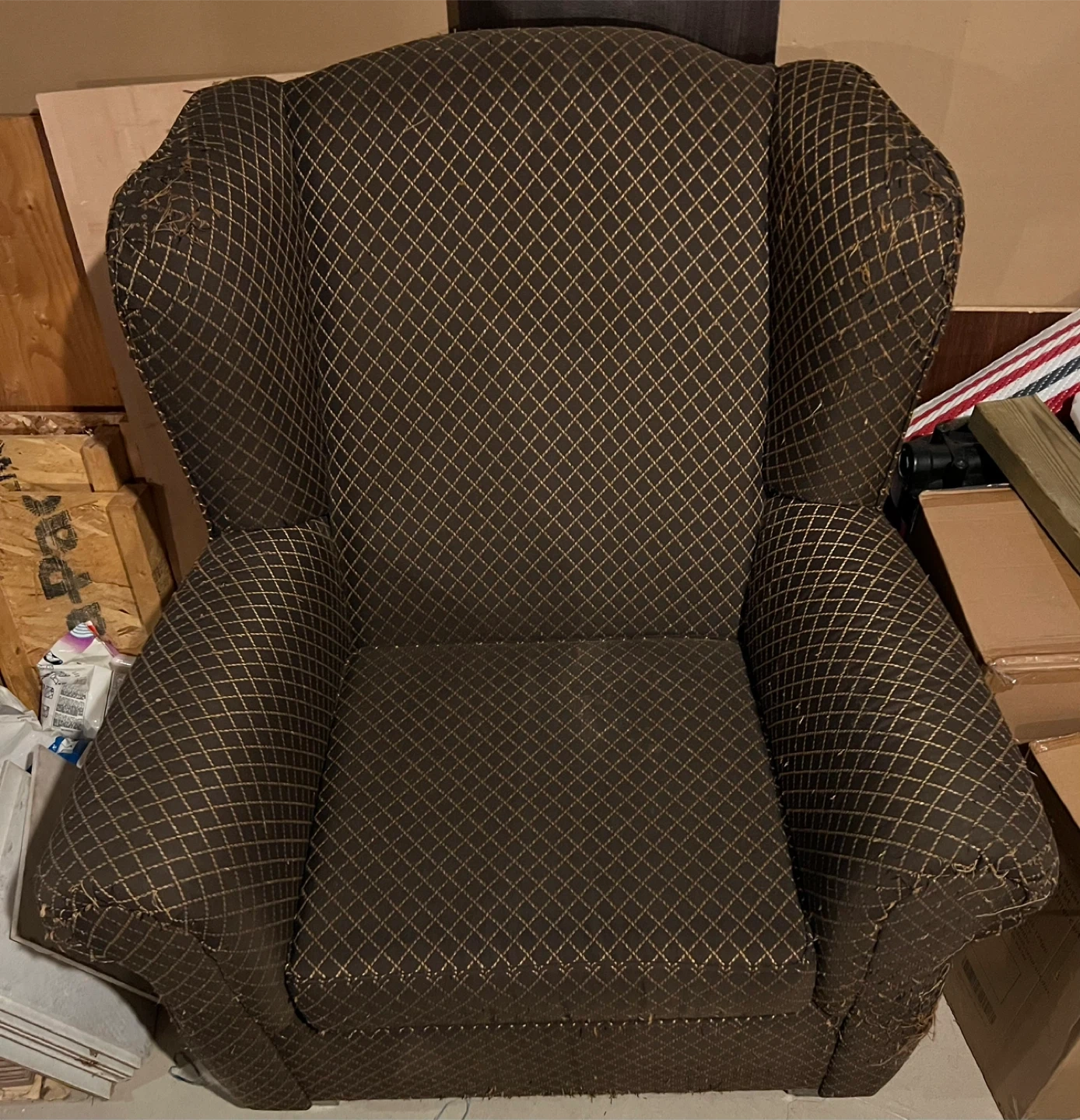 This armchair features a dark brown patterned fabric, perfect for adding a touch of comfort to any room. It has a classic design with a high back and rolled arms. The fabric shows some wear and tear, but it's still a comfy place to relax and unwind after a long day!