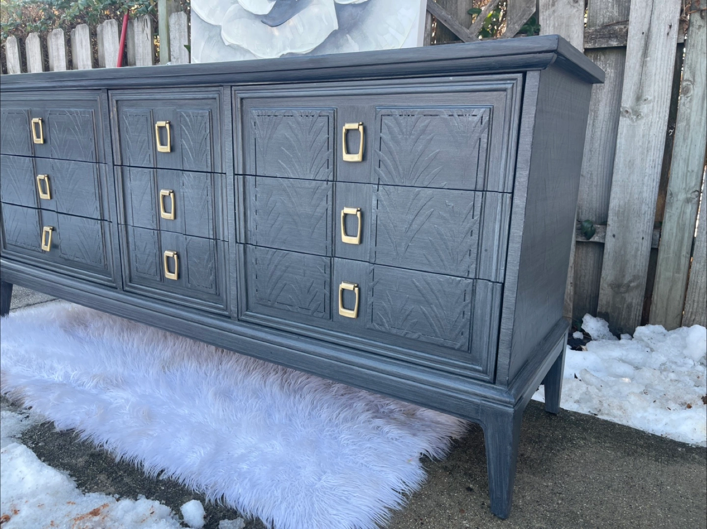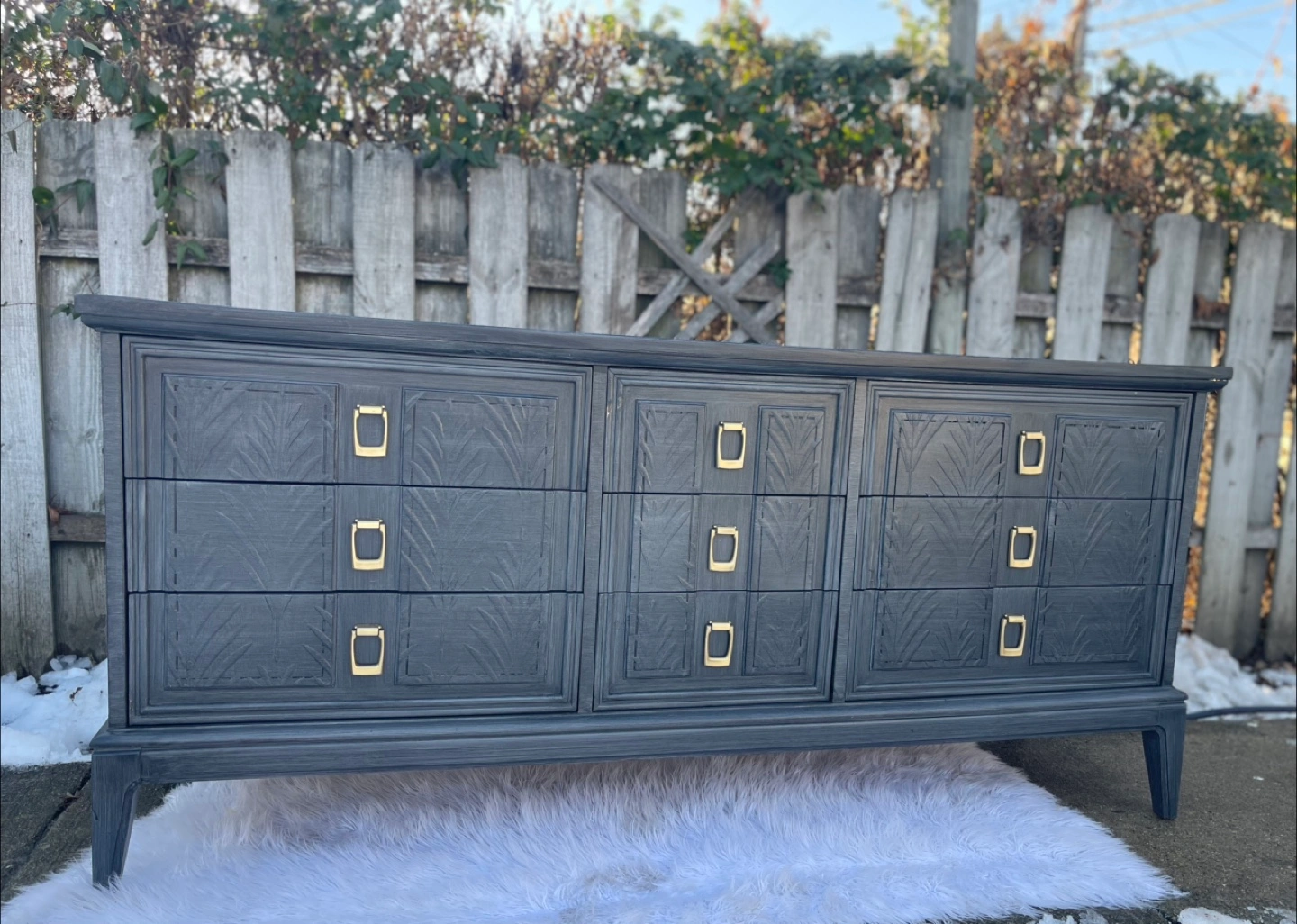 Beautiful MCM Dixie dresser redone in modern gray brushed finish. Featuring 2 layers of primer, 2 layers of paint, and 3 layers of polycrylic for extra protection and durability.