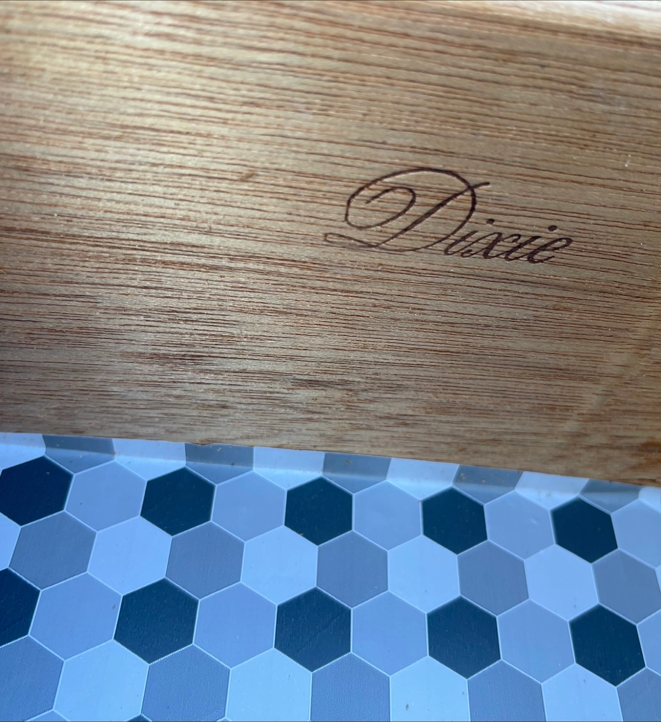 Front and back dovetail drawers. All the drawers are working very good and are lined with new contact paper, extremely clean. Lots of storage. Solid wood. Very sturdy. Original gold hardware. Raised stencil added.