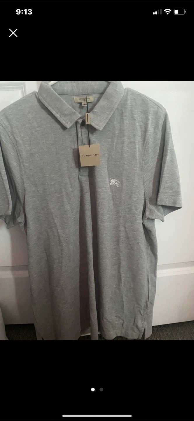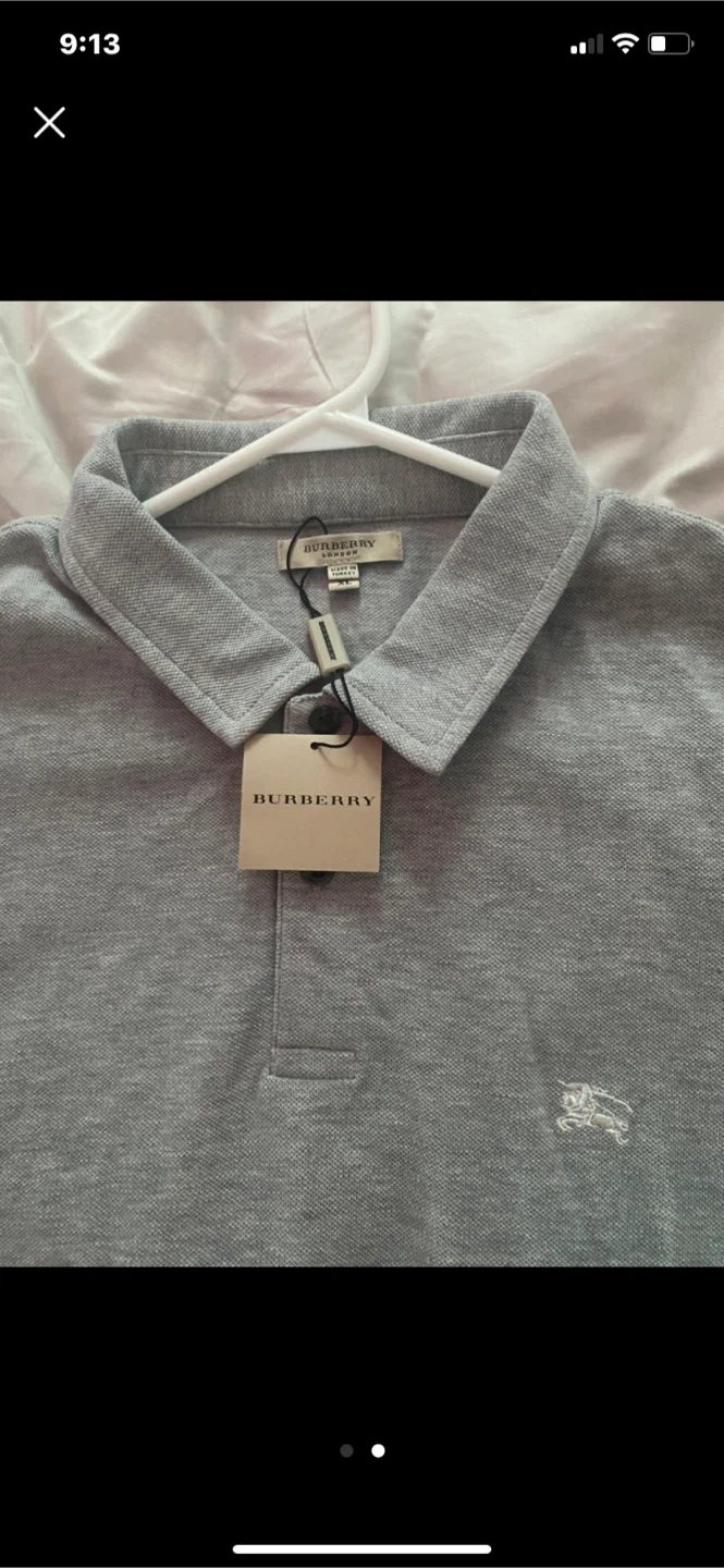 Here's a Burberry polo shirt in a lovely grey colour! It's in great condition and ready for a new home. The shirt features the iconic Burberry logo. Perfect for a casual yet stylish look!