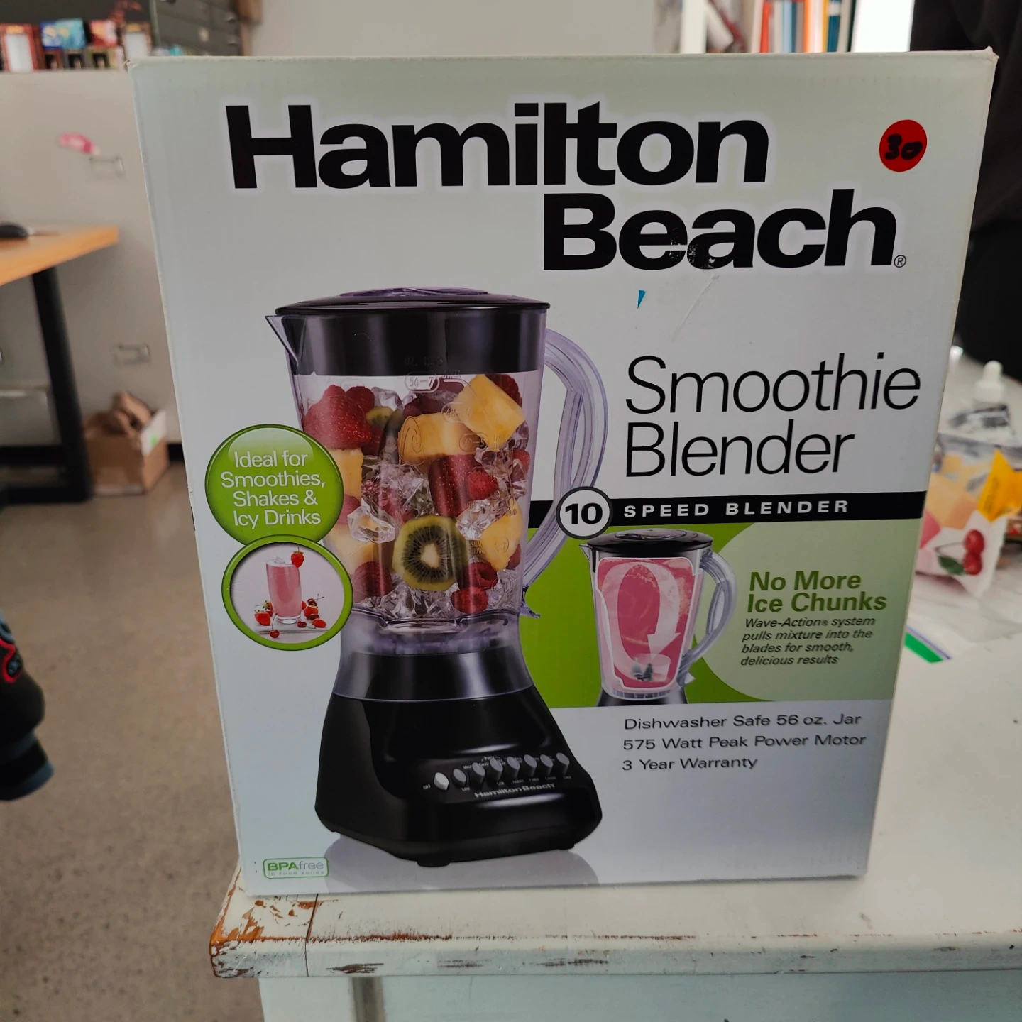 Selling a Hamilton Beach Smoothie Blender! It's in excellent condition and comes with the unopened box. It's a 10-speed blender with a 575 Watt peak power motor.