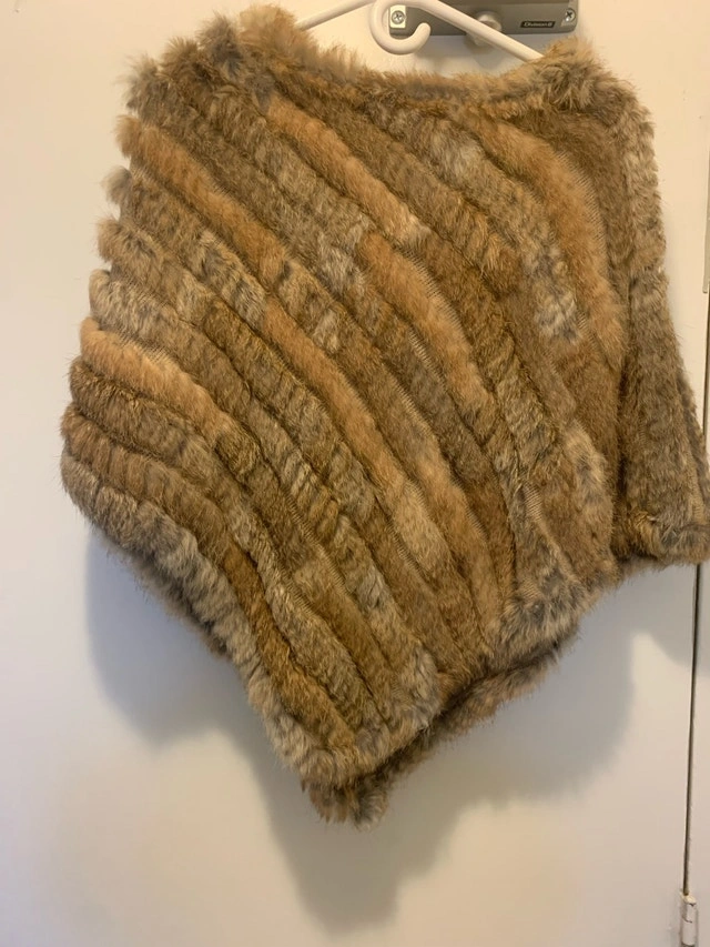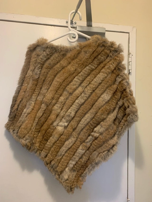 Wrap yourself in luxury with this stylish natural rabbit fur poncho! This new poncho is in great condition and features a beautiful, eye-catching design, perfect for adding a touch of elegance to any outfit. * Material: Real Rabbit Fur * One size fits most.