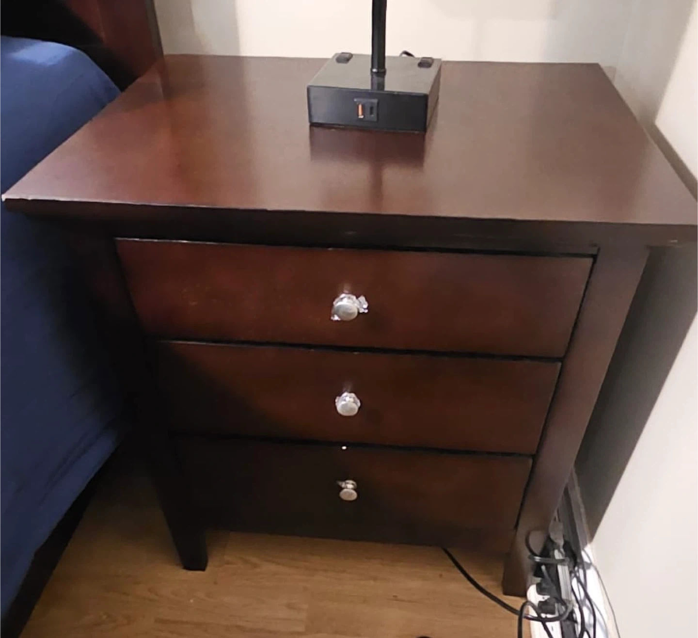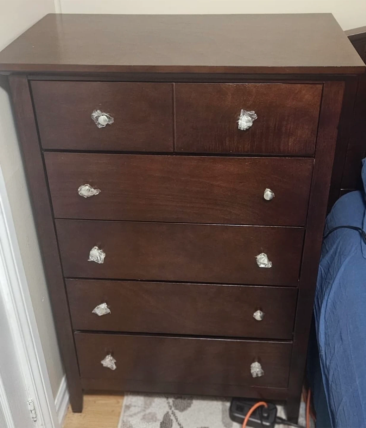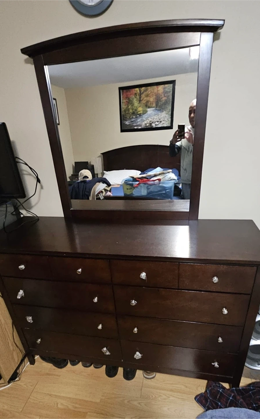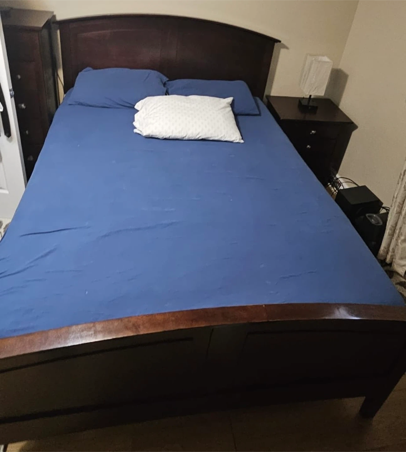 Bedroom set for sale! Includes a bed frame, dresser with mirror, and a nightstand. All pieces are a matching dark wood. Great for furnishing a new space or upgrading your current bedroom setup