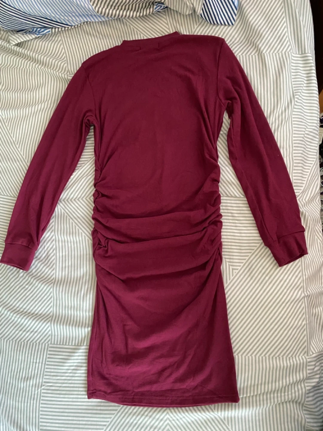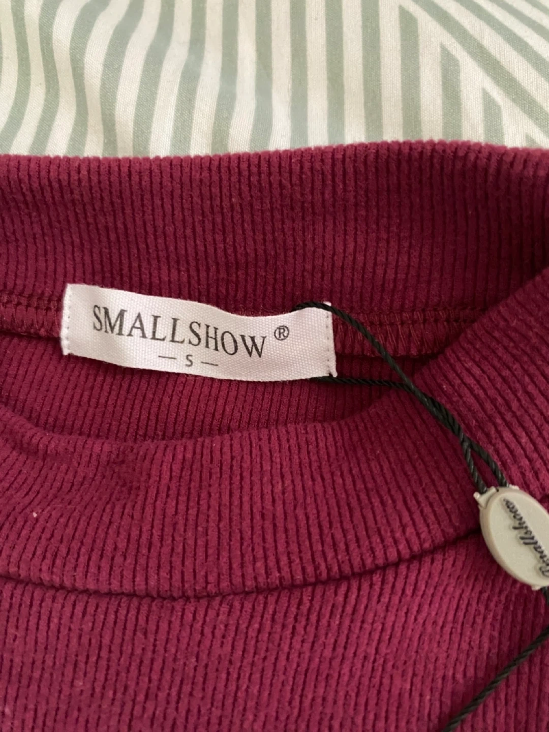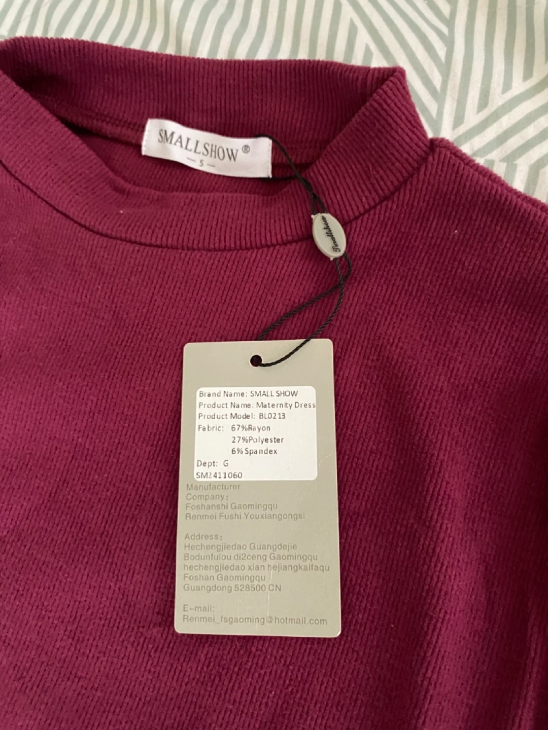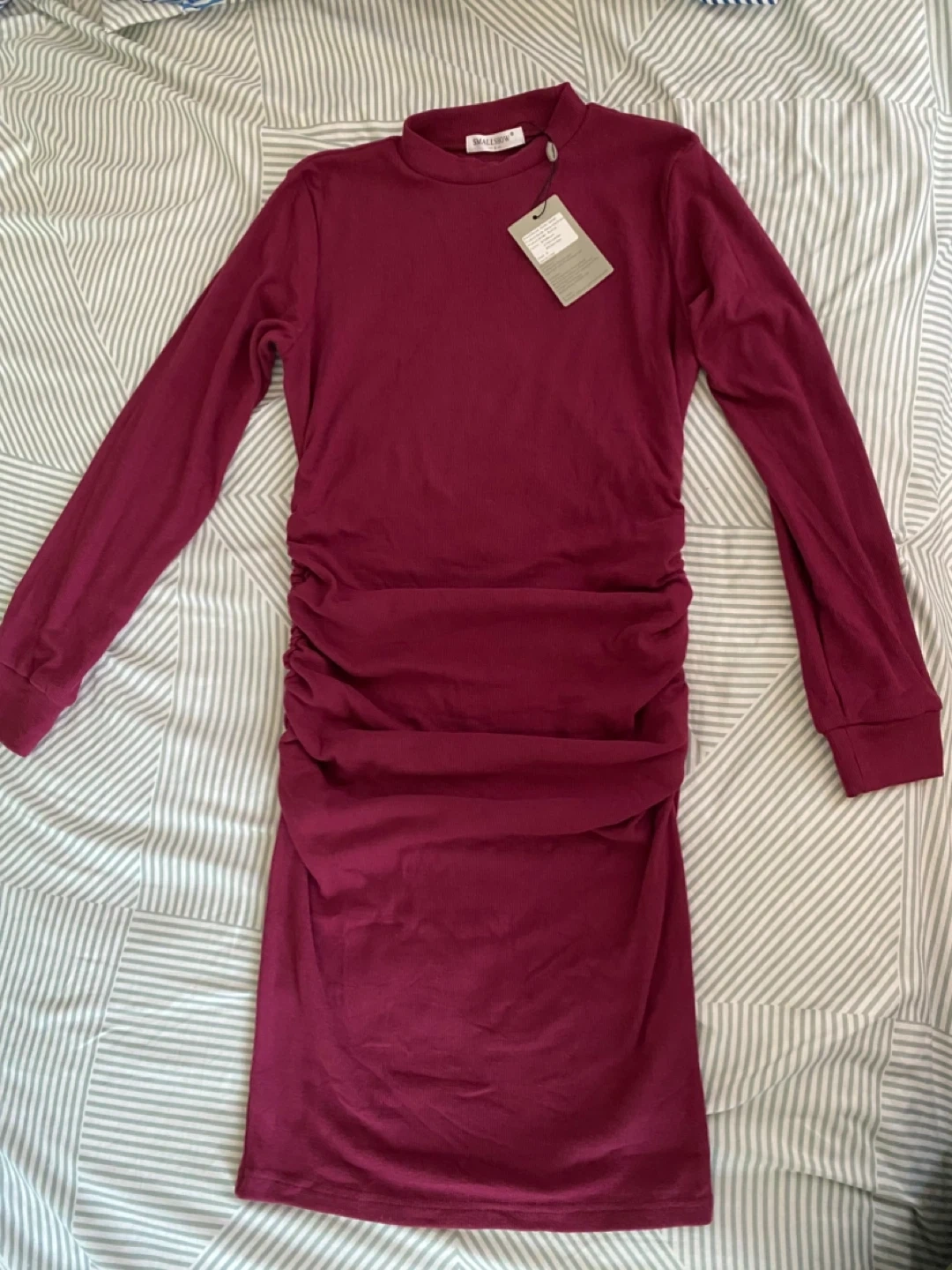 This is a brand new SMALLSHOW dress in size small! It's a beautiful burgundy colour and made of 67% Rayon, 27% Polyester, and 6% Spandex. The product model is BL0213.