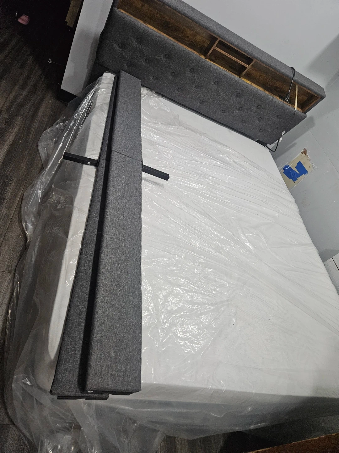 Selling a gray upholstered bed frame. It features a stylish headboard with built-in shelving. The bed frame appears to be in good condition and is ready to add a touch of elegance to your bedroom