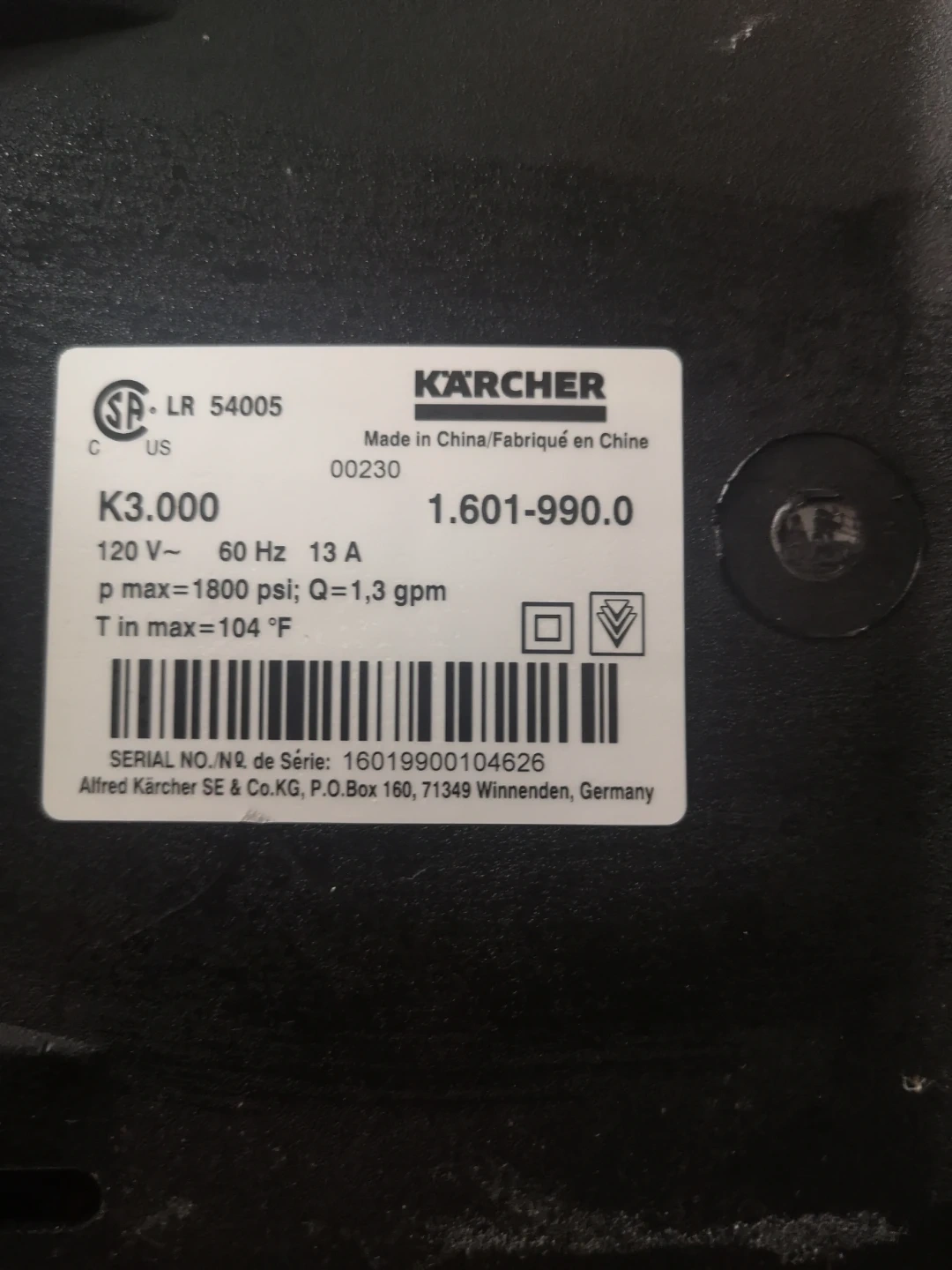 Selling a Karcher K3.000 pressure washer. It's in good working condition and ready to help you tackle your outdoor cleaning projects. It operates at 120V and delivers a pressure of 1800 psi with a flow rate of 1.3 gpm.