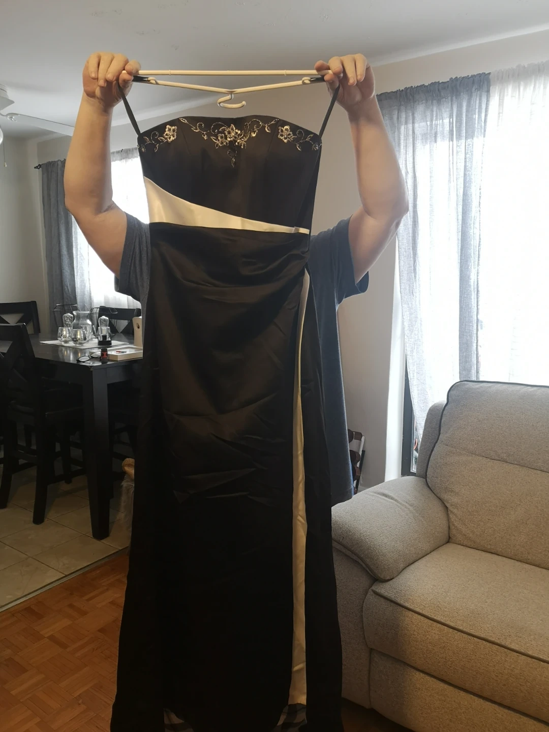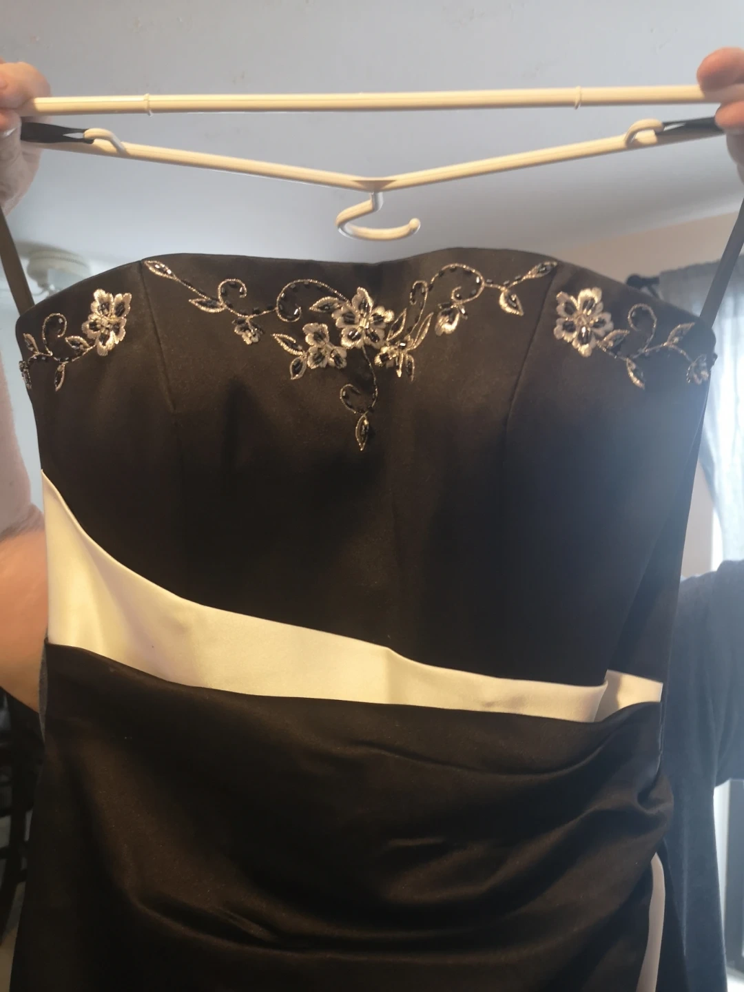 A beautiful black and white formal dress, perfect for a special occasion! It has lovely floral detailing on the bodice and a flattering design. In great condition only worn once for a wedding.