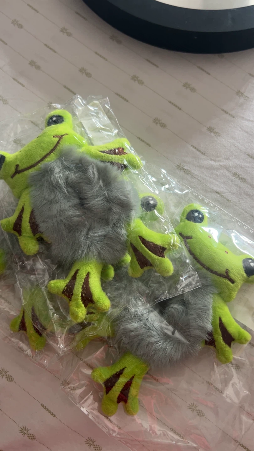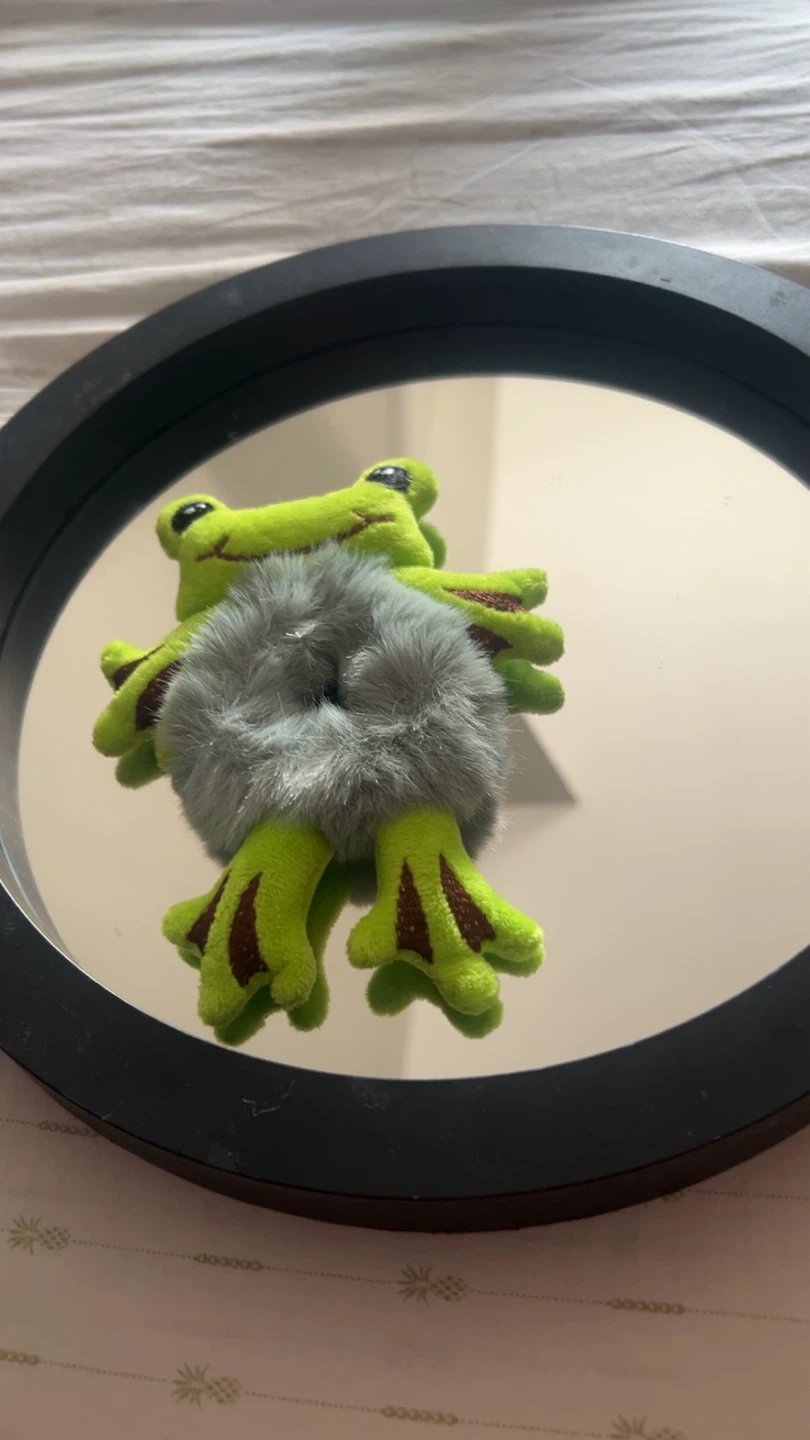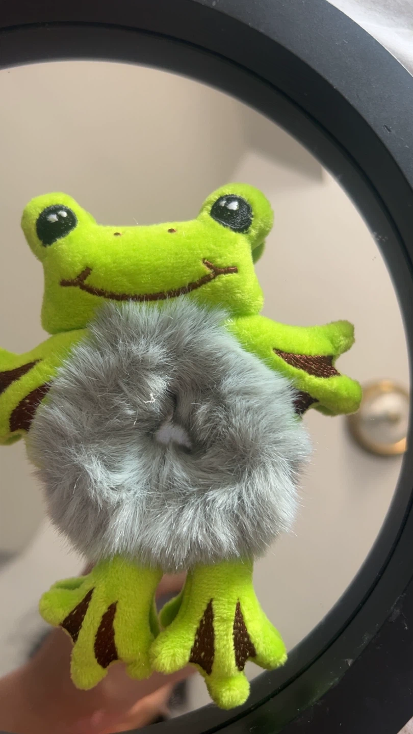 Super cute frog plushie hair tie! It's a fun and quirky accessory to add to your collection. The plush frog is a vibrant green and features a fluffy gray hair tie. Ideal for crazy hair day