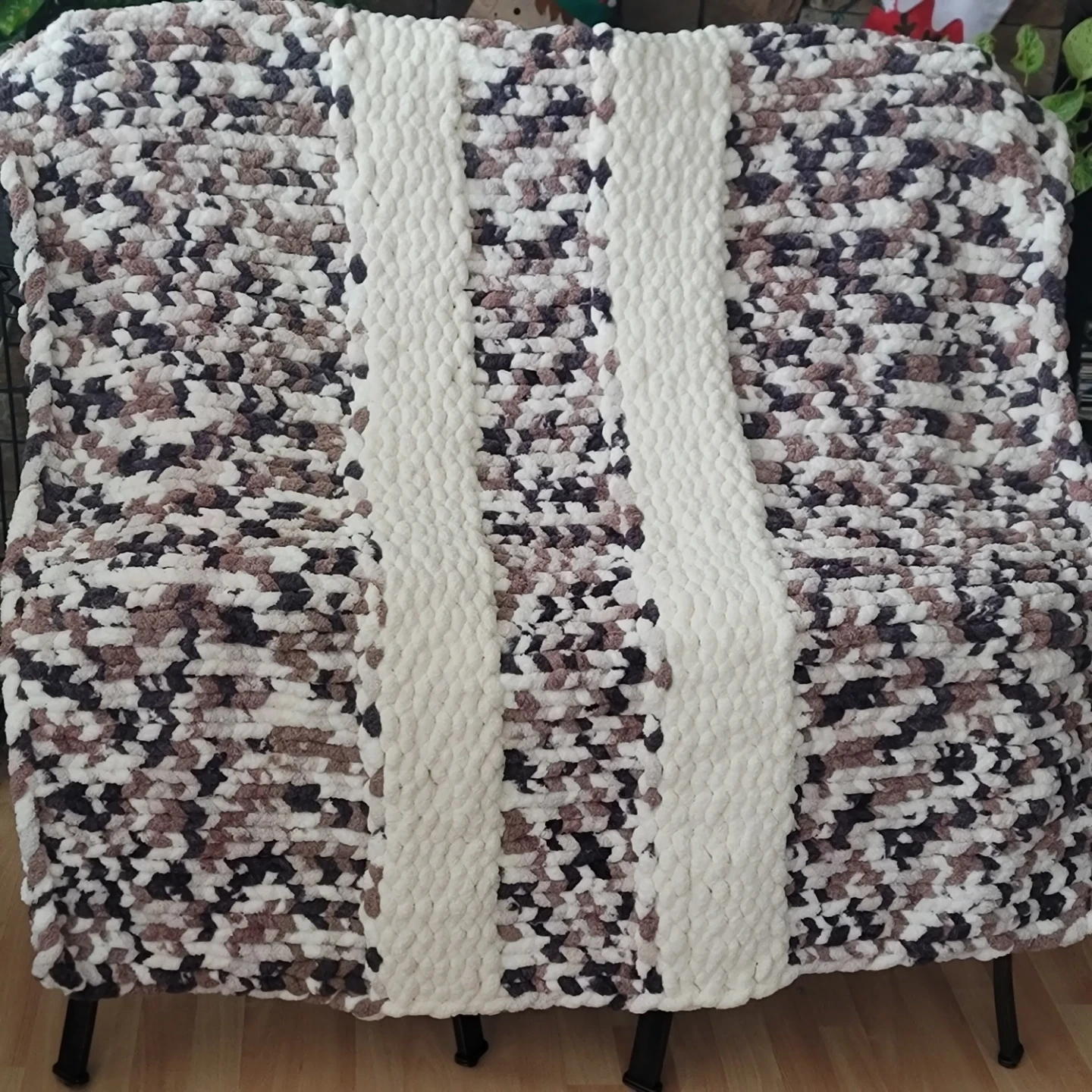 Selling a cozy, handmade chunky crochet blanket. It's perfect for snuggling up on the couch during those chilly Canadian evenings. The colours are a mix of white, brown, beige and grey, creating a soft and inviting look. It's in great condition and ready to keep you warm!
