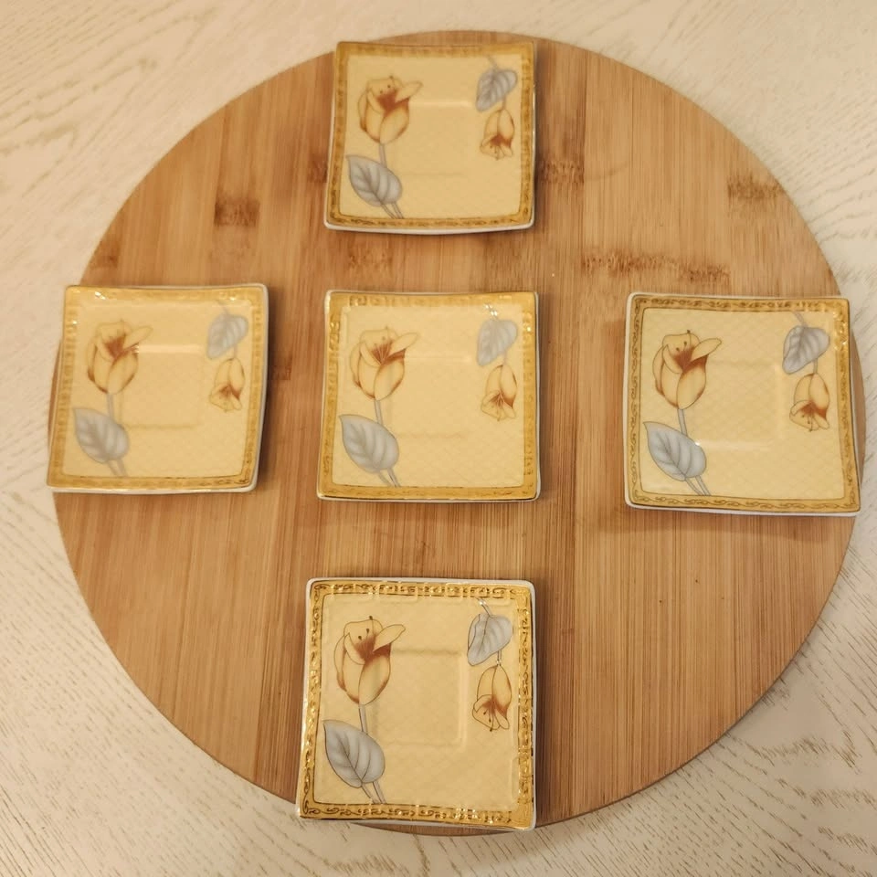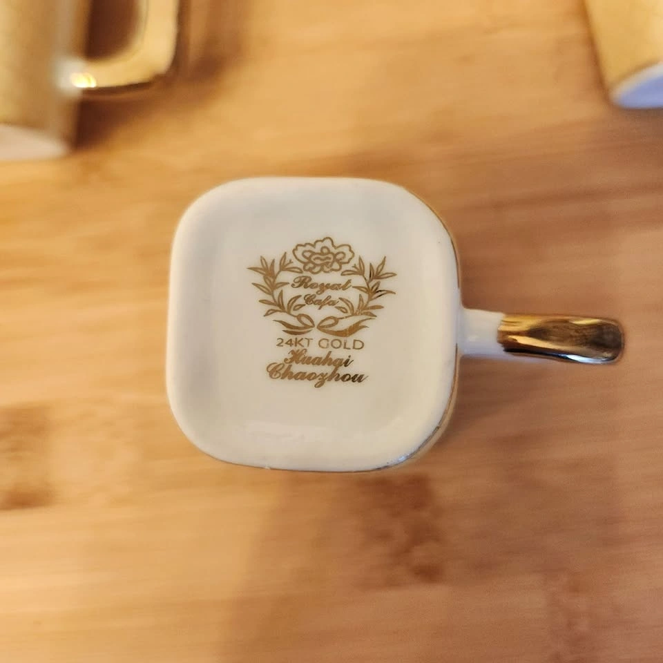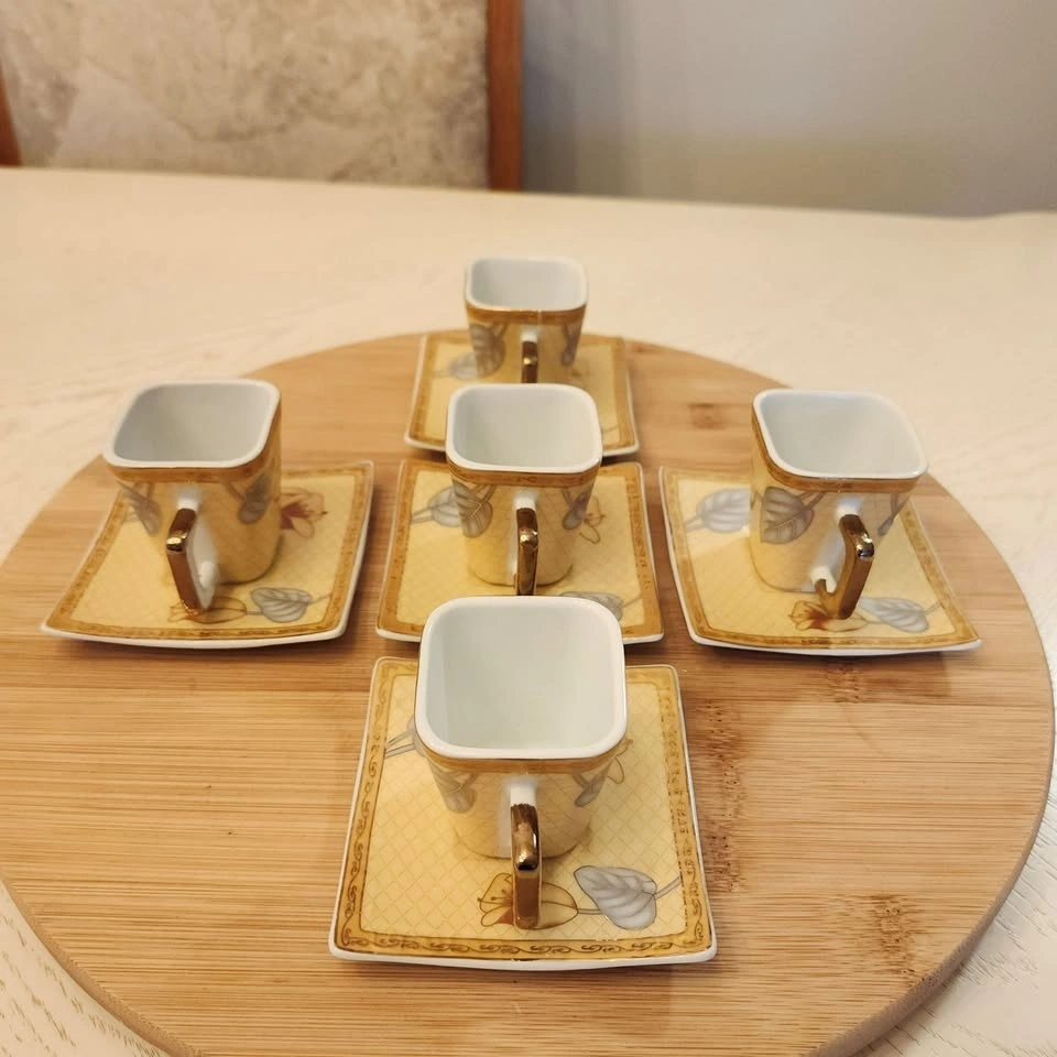 10 piece cup and saucer set, decorated with 24K gold. The demitasse cups are square and match the square saucers.