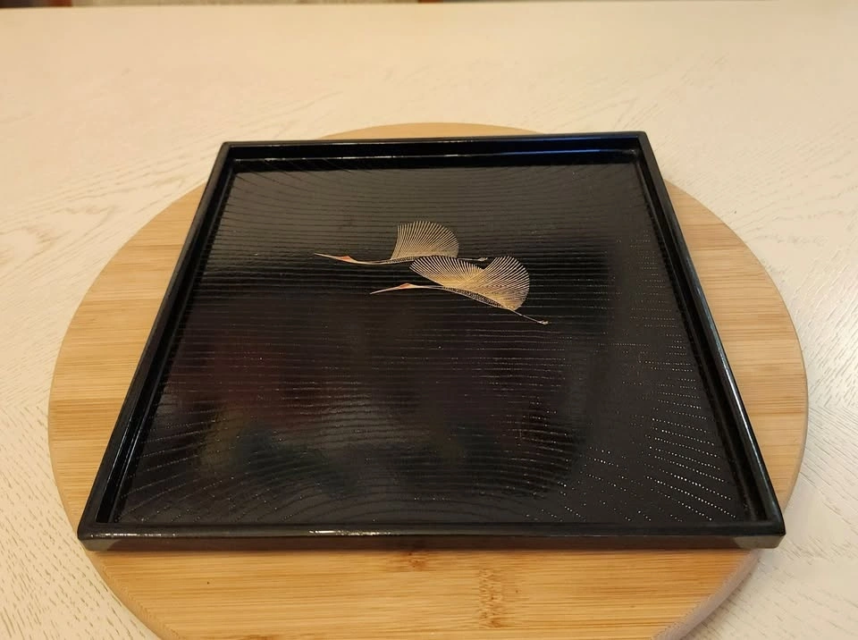 Comes with a black lacquered serving tray that is 10.25"x10.25" square. It features delicate lines with 2 cranes in flight.