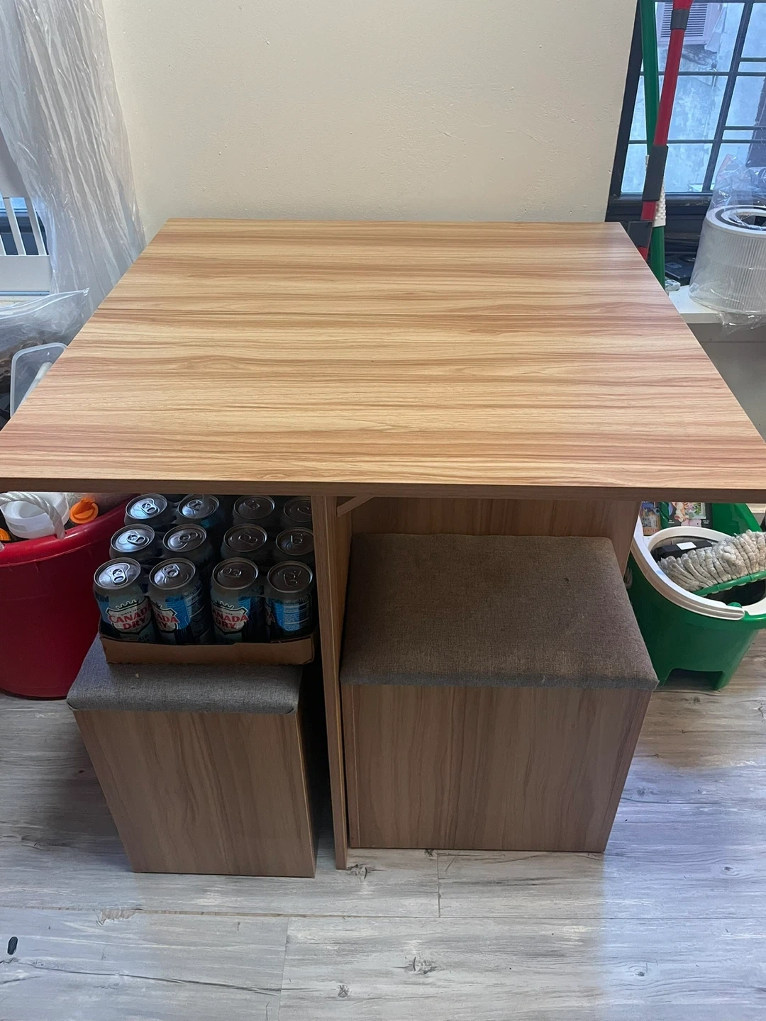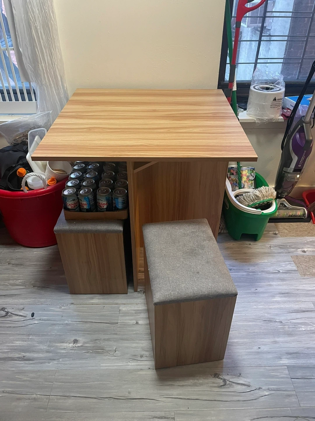 Selling a wood dining table with storage benches! The benches fit neatly under the table when not in use, making it great for saving space. The benches also have storage inside, perfect for keeping things organized. The table is in good condition and ready for a new home!