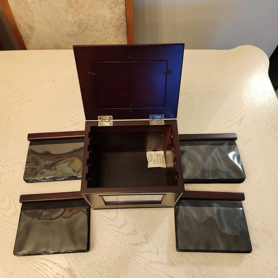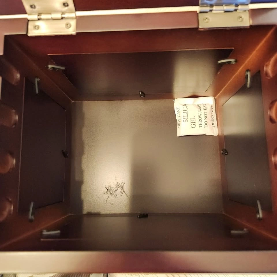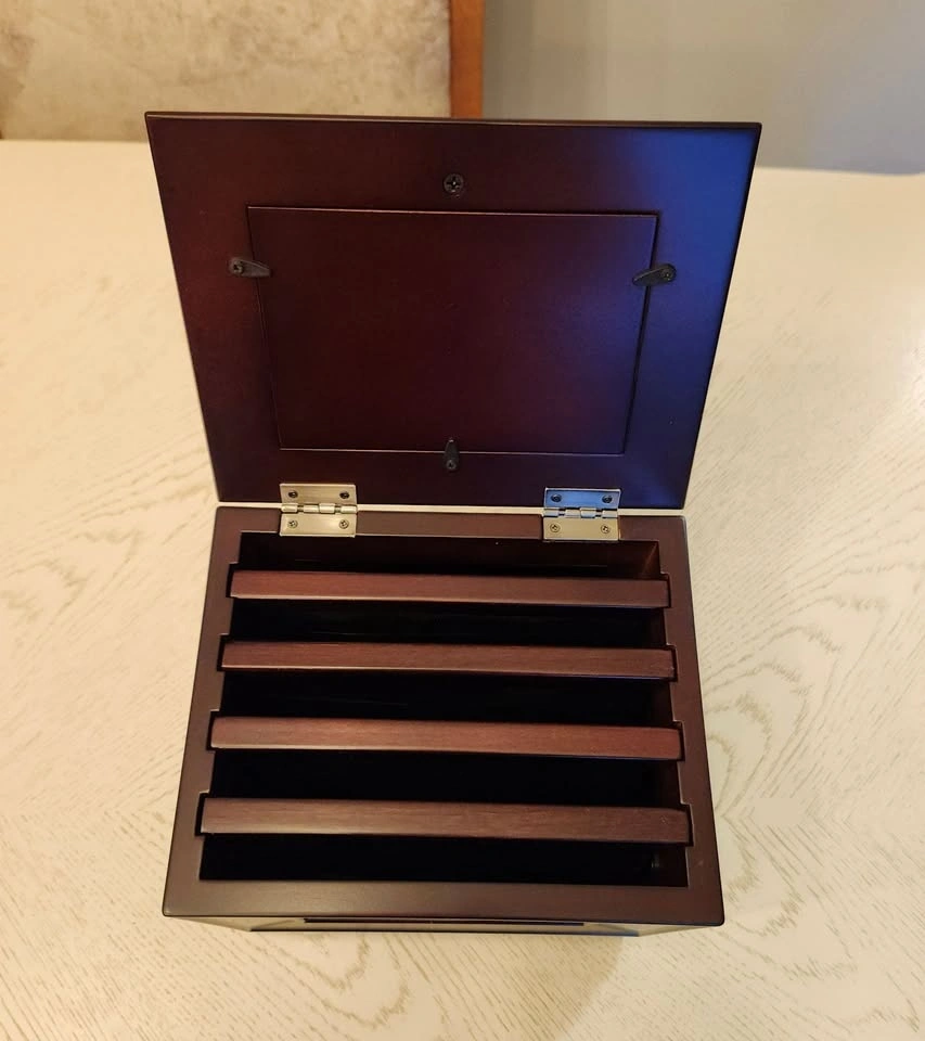 It is a mahogany toned wood, which is beveled toward the pictures. There is a pewter look top handle and pewter look feet. The top is an easy open hinged lid to access the inside. No scratches, dings or dents.