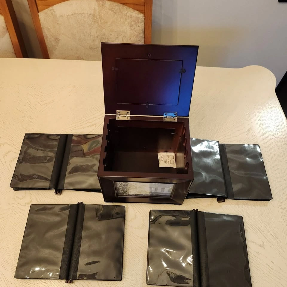 This treasured photo cube stores 4 individual albums inside that hold 24 4"x6" photos in each one. That's 96 photos in the hanging folders inside! Plus there is removable backing on the inside so you can display 3 more 4"x6" on the front, top and back of the cube along with 2 more 3.5"x3.5" on the ends of the cube.