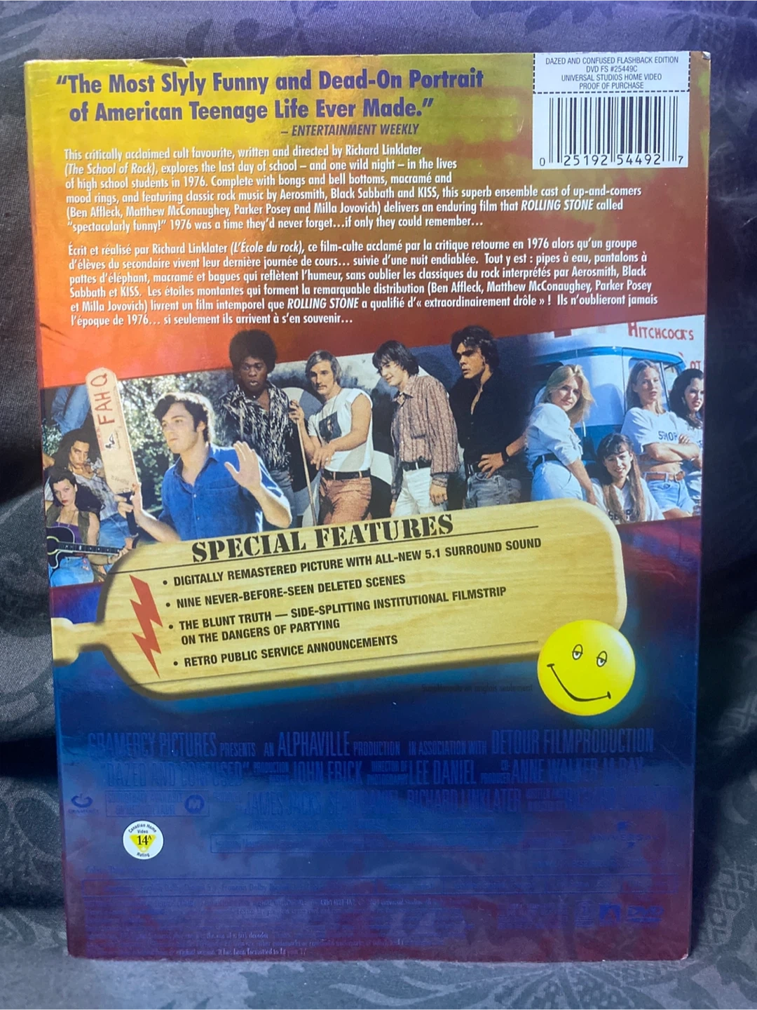 Selling a DVD of Dazed and Confused: Flashback Edition! It's a digitally remastered film with all-new 5.1 surround sound. It also includes never-before-seen deleted scenes, side-splitting institutional filmstrip on the dangers of partying, and retro public service announcements
