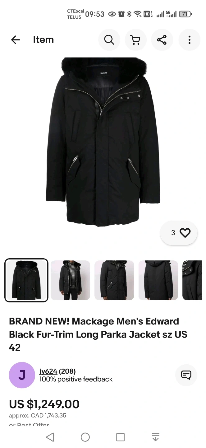 Selling a Mackage Men's Edward Parka jacket in size 46 XL / XXL. It has a black fur trim and is in great condition. Perfect for the cold Canadian winters!