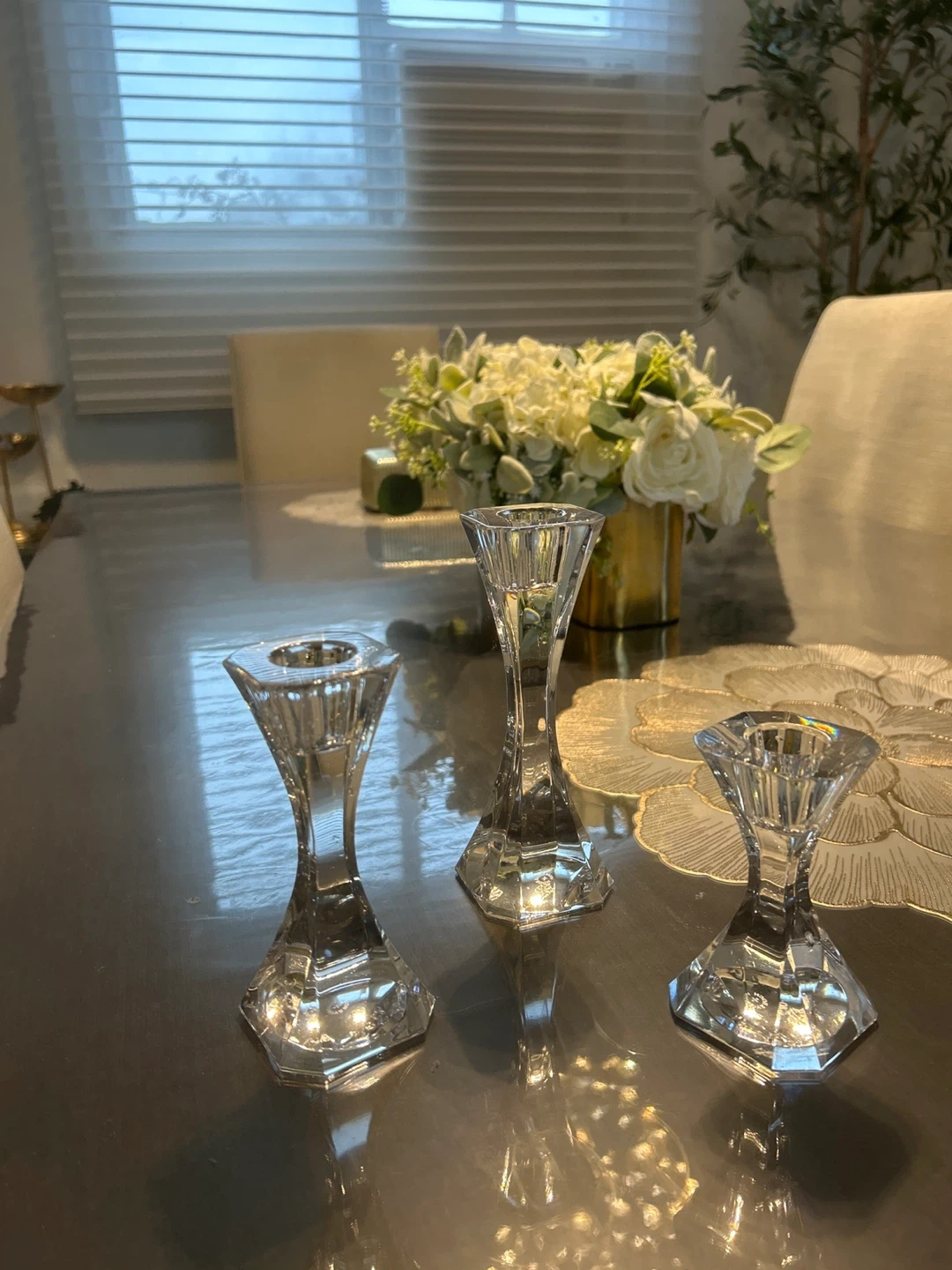 Selling a set of three clear glass candlestick holders! They're in great condition and would look lovely on a dining table or mantelpiece