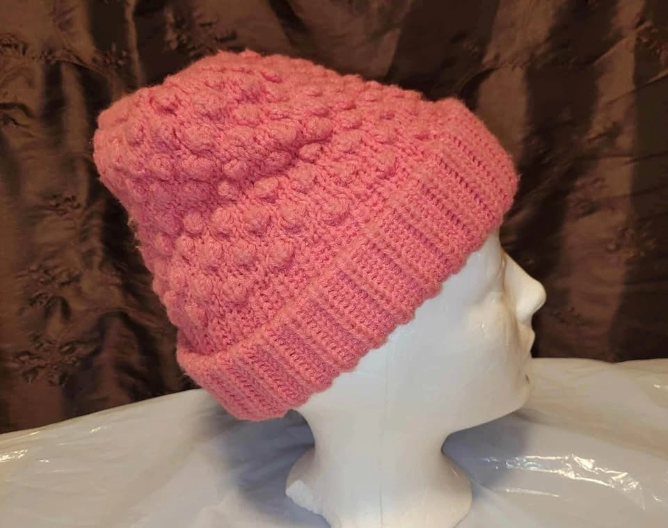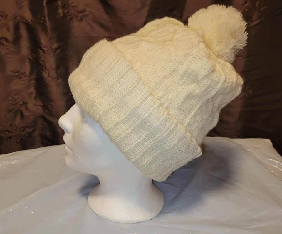 Ivory colored toque has a pompom on top, and fits fashionably loose and comfy.