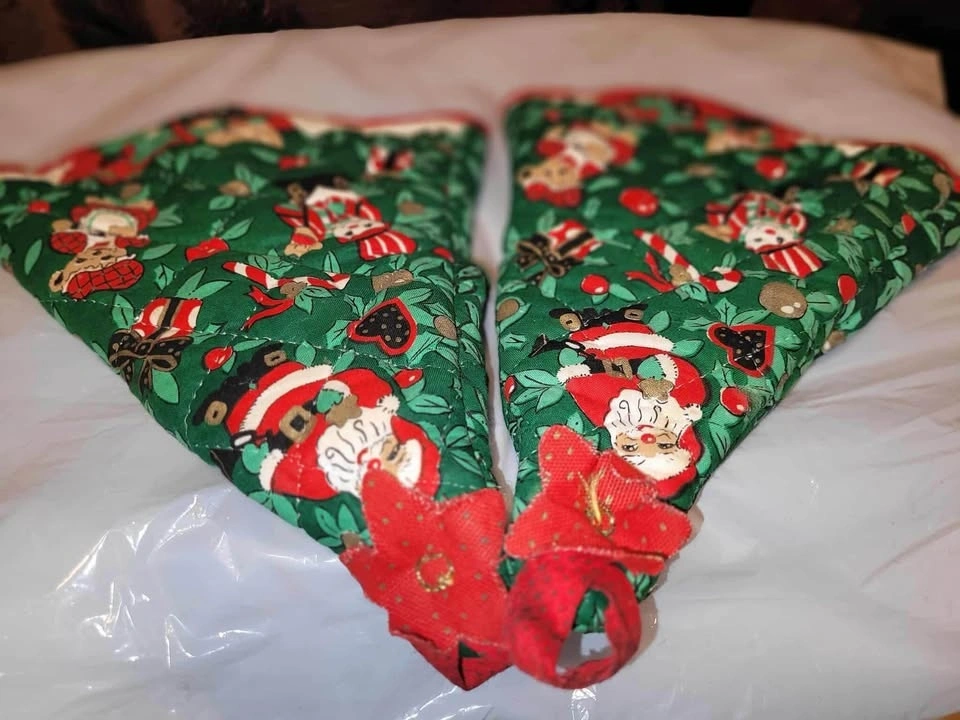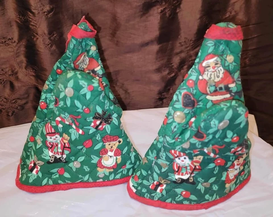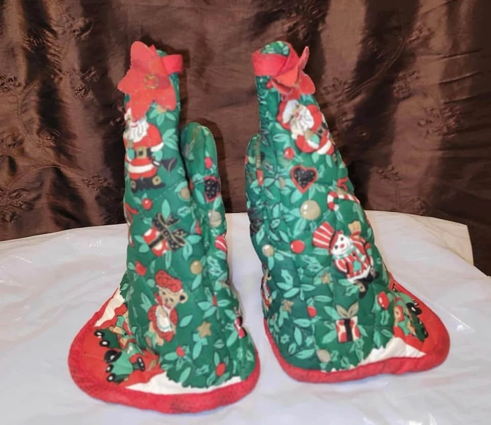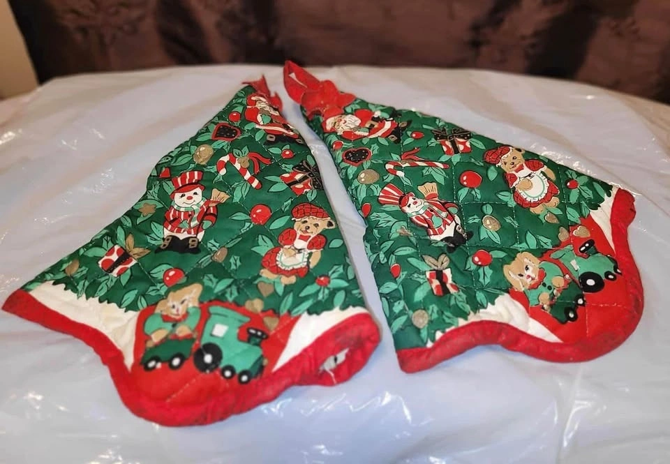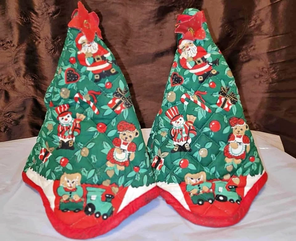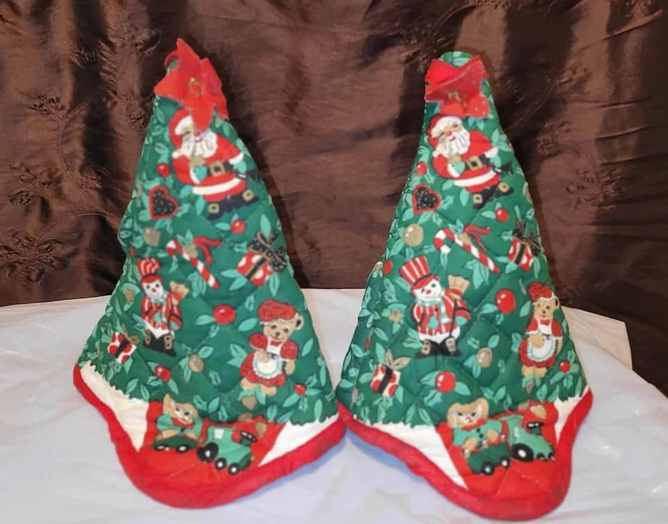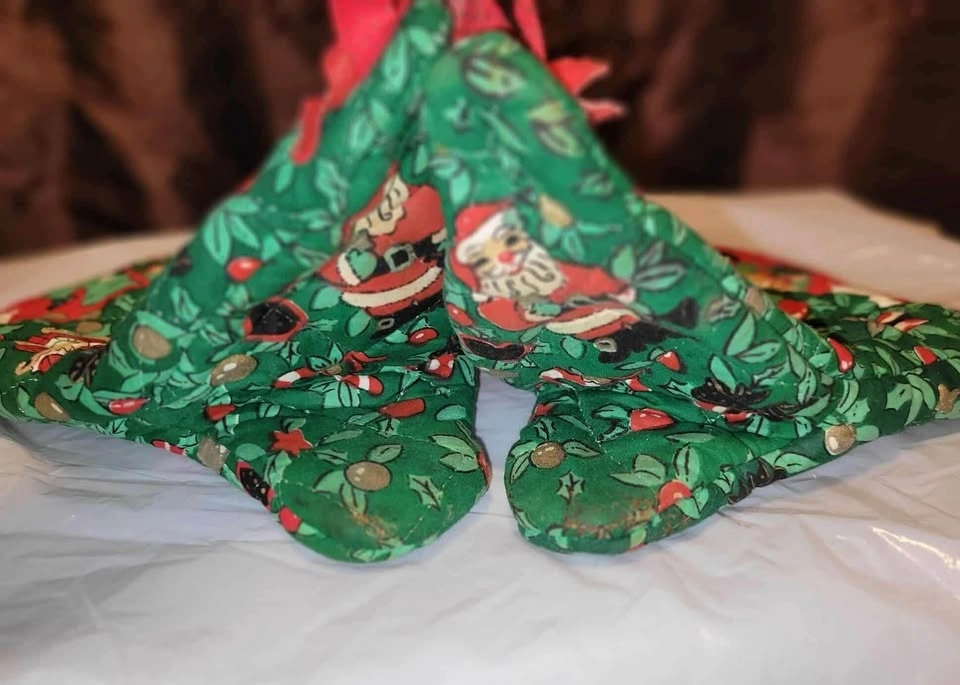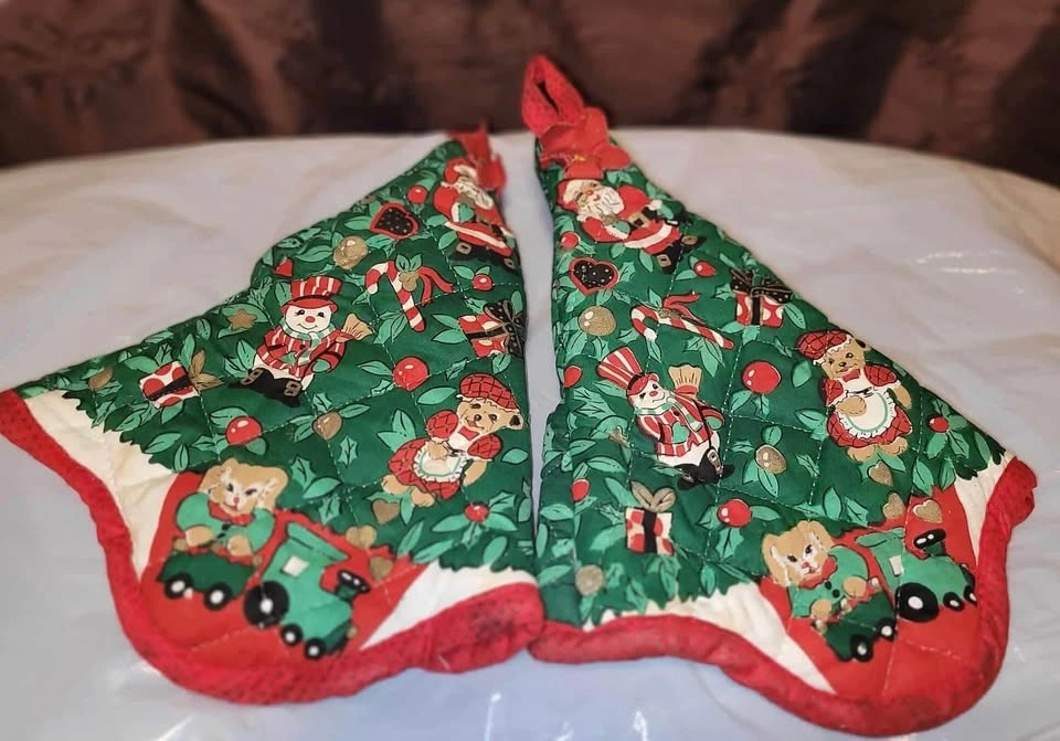 Good condition. Only used a few times. Oven mitts have loops on the end to hang up, or they can stand up, like Christmas trees.