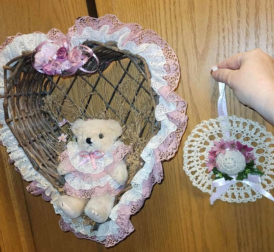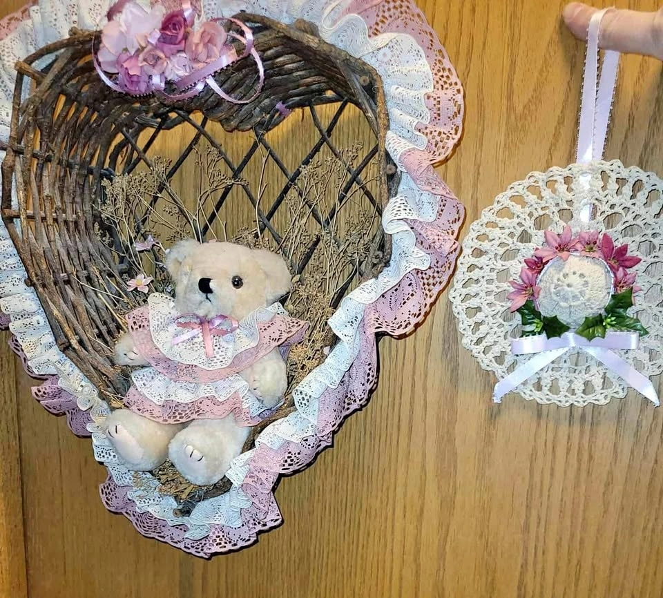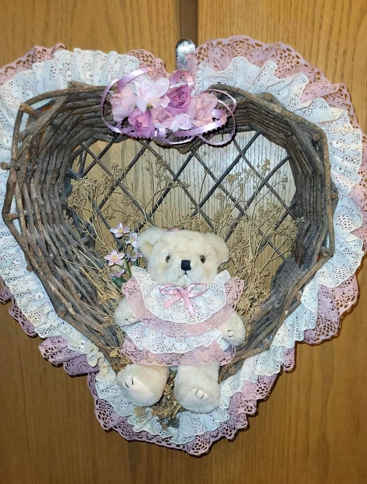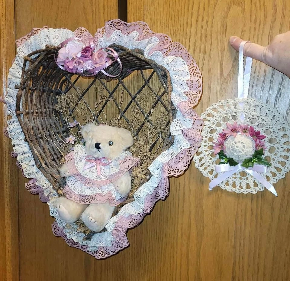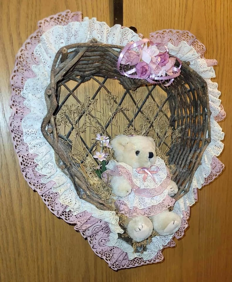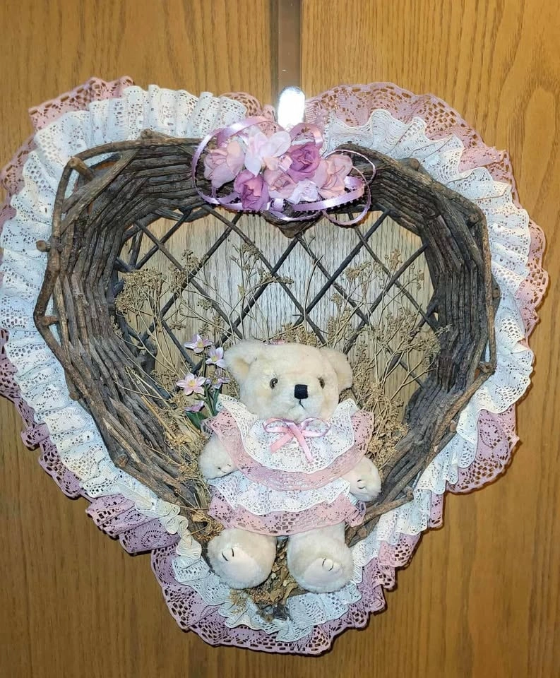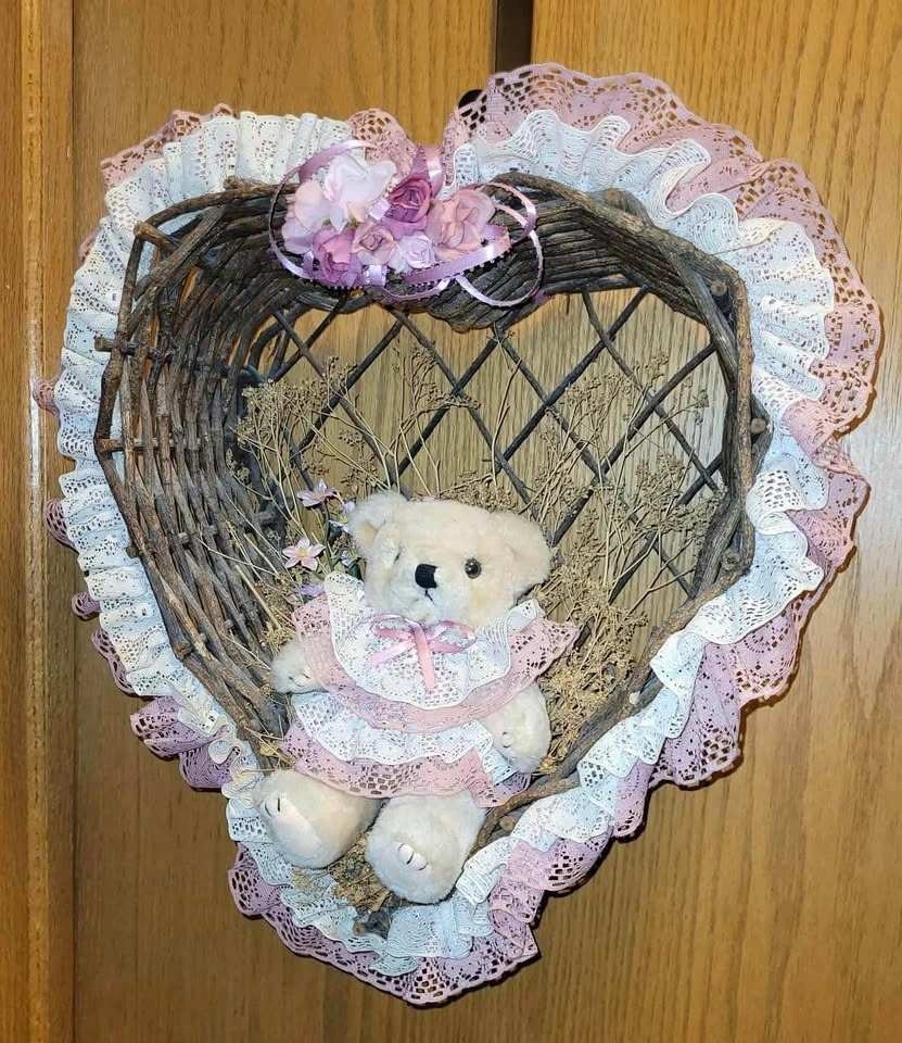 $15- Heart shaped wicker type woven branches have a cute bear in the middle. Accents are pink (light rose). Totally retro adorable! Measures 13” (33cm) x 15” (38cm)