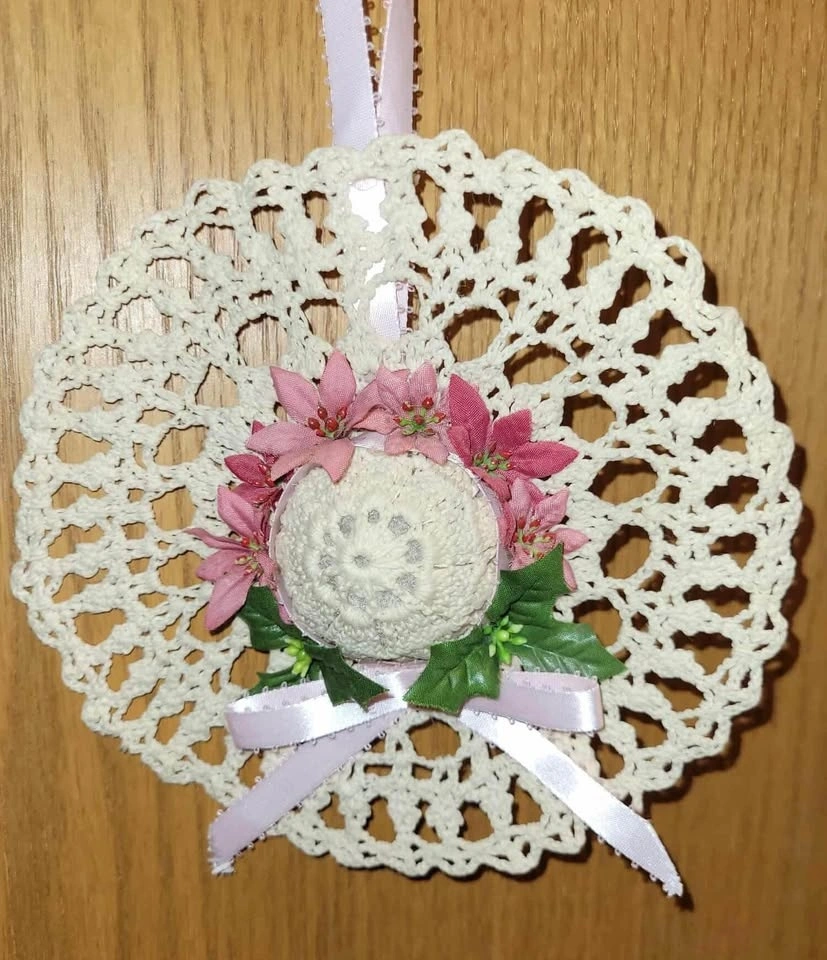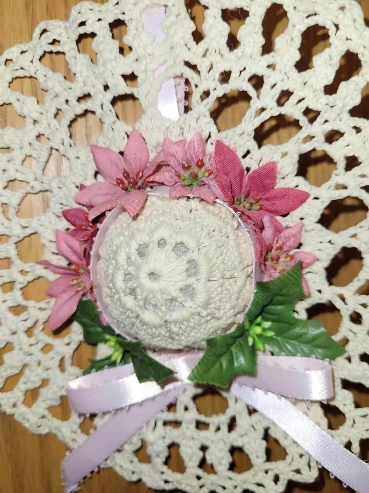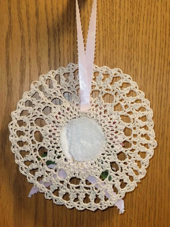 $8- Crocheted hanging ‘hat’ was stiffened with starch to hold its shape. Measures 7” (18cm) in diameter