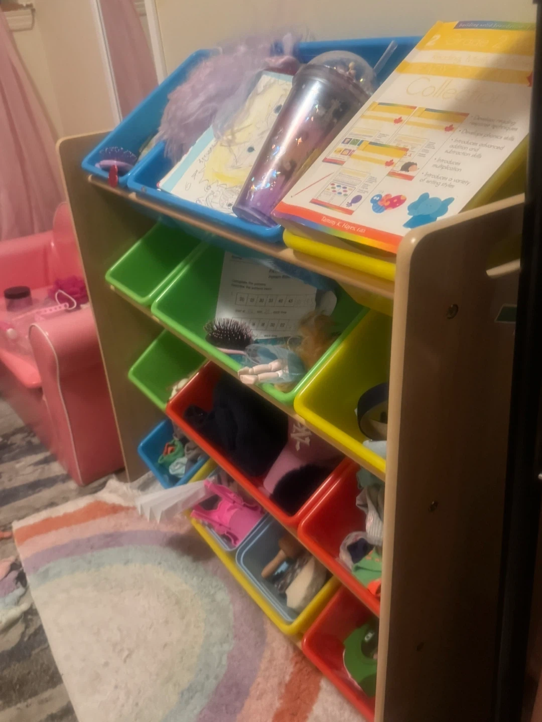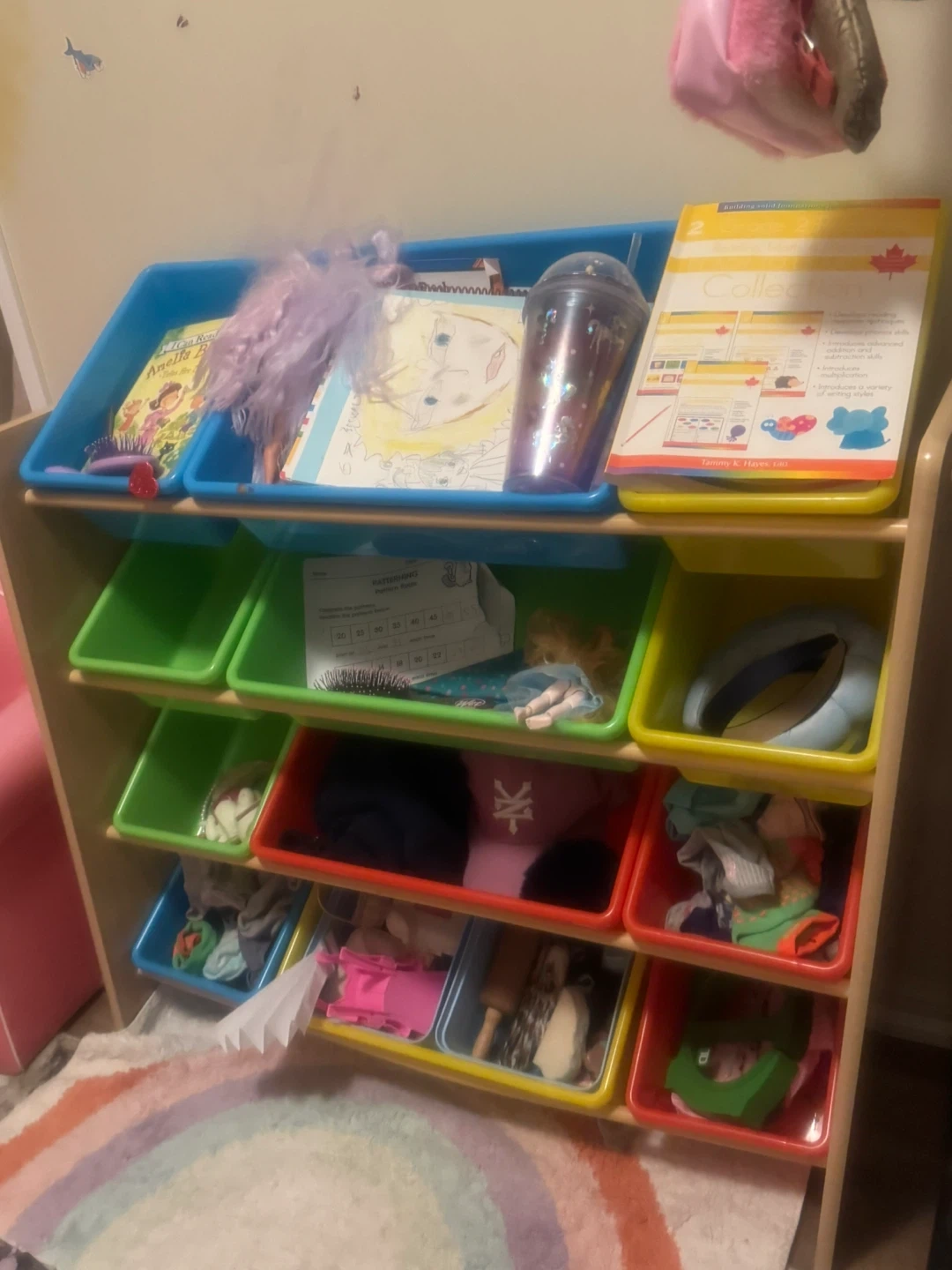 Declutter your little one's space with this colourful toy storage organizer! It features multiple bins in various colours, perfect for sorting and storing toys, books, and other items. A great addition to any playroom or bedroom to keep things tidy and organized
