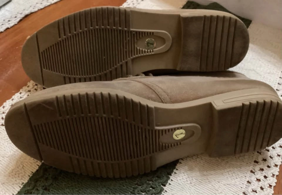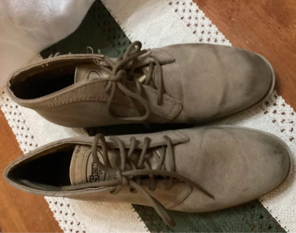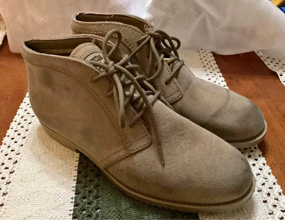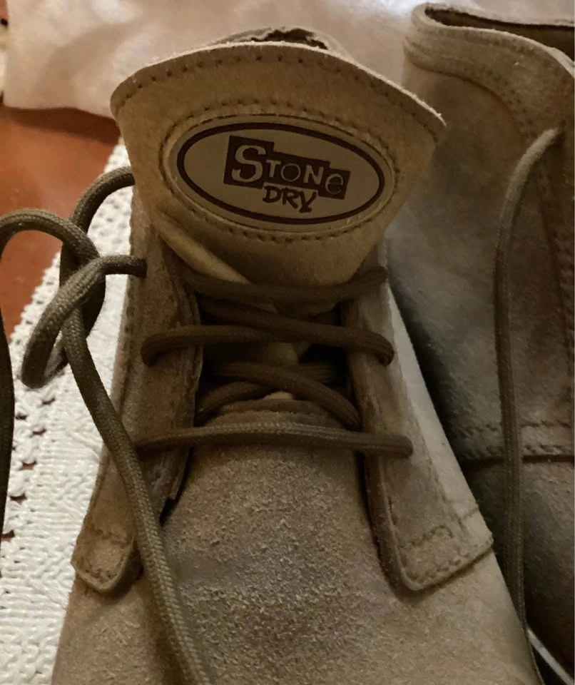 Clearing out the closet! A good walking/hiking boot. Suede Tex is a waterproof technology. Great price for these! These boots are still in good condition and will last. Solid built Stone Dry brand. Beige brownish color. Sold as is. The one lace hole at the top of the left shoe has a small rip, as shown.