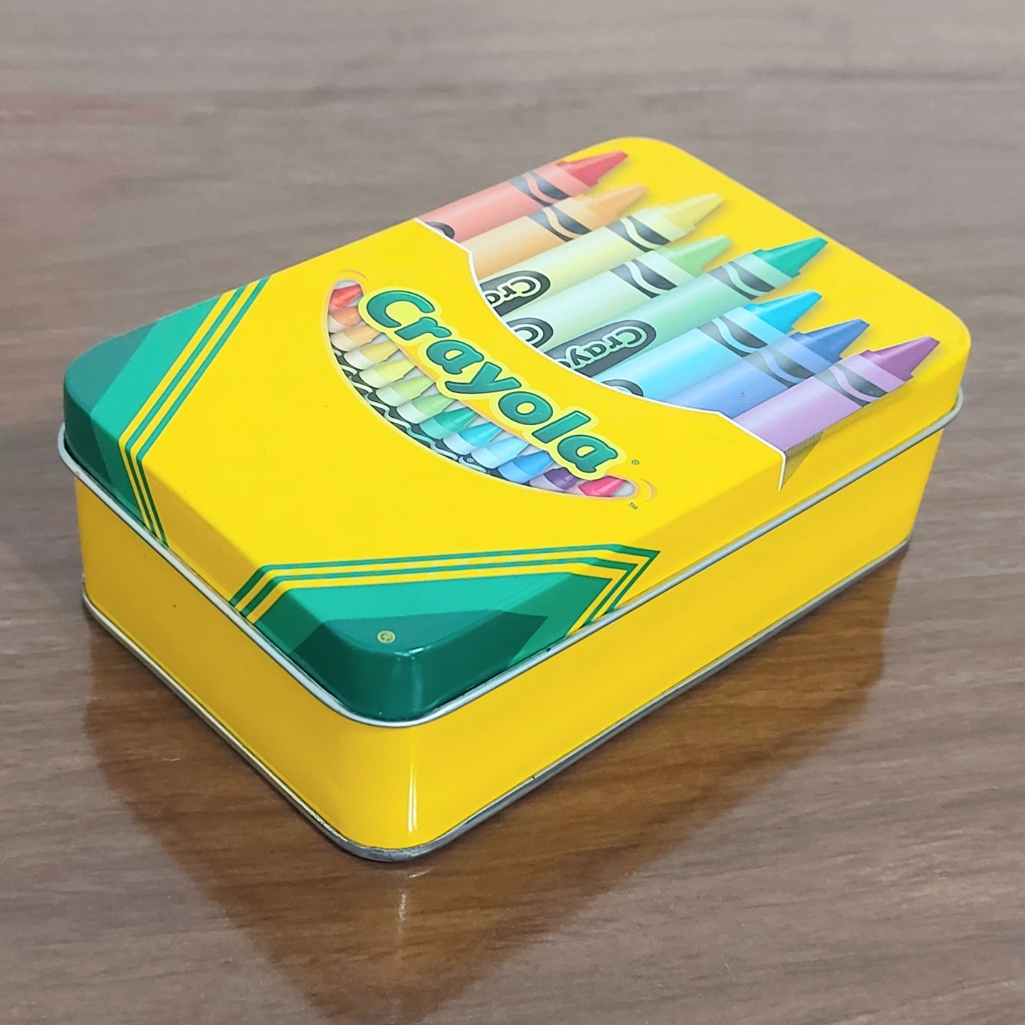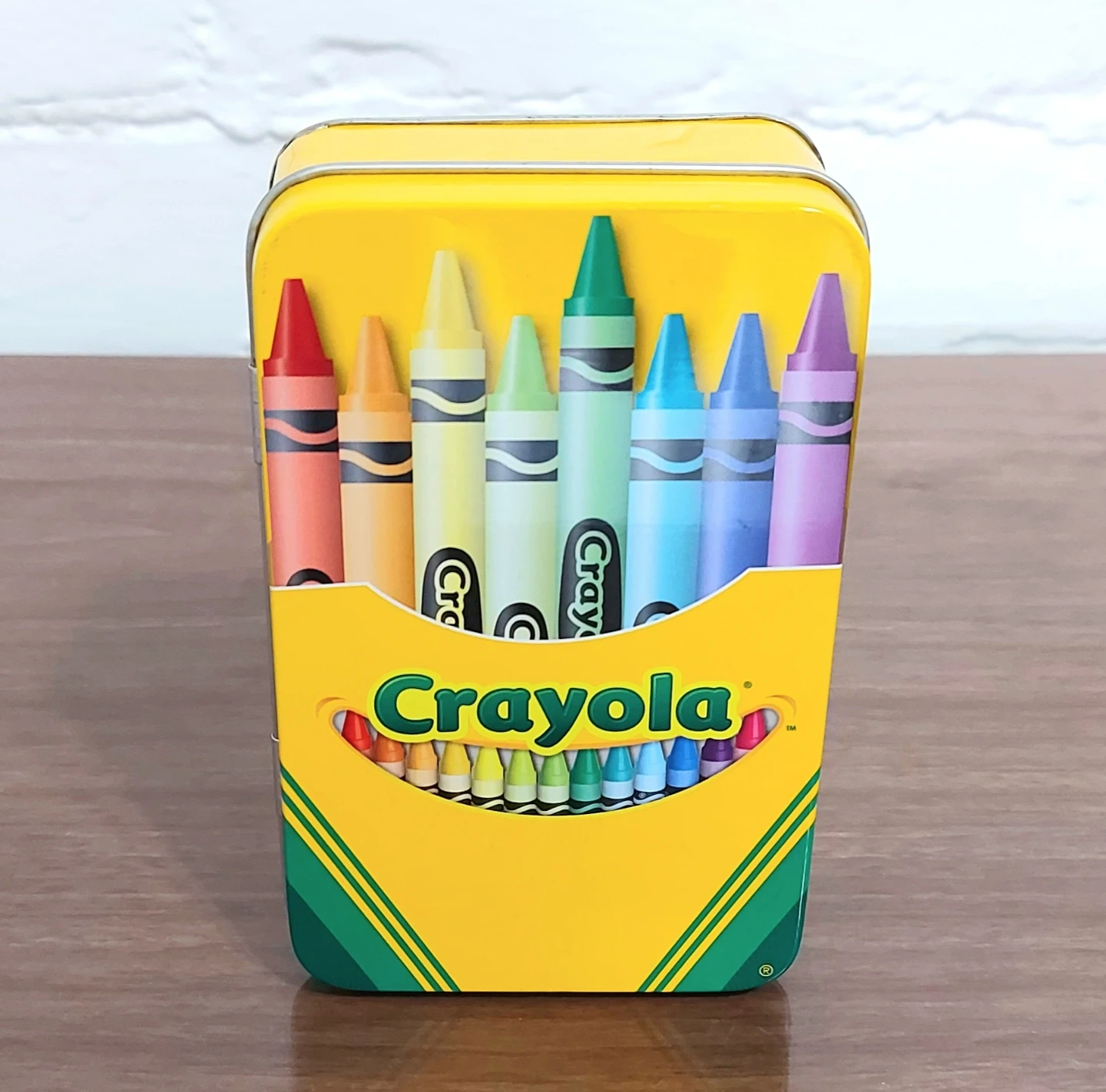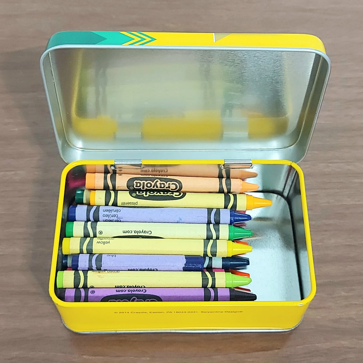 Crayola crayons in metal tin— crayons have been lightly used previously, and have plenty of use left in them. Tin is in excellent condition. From a pet free and smoke free home.