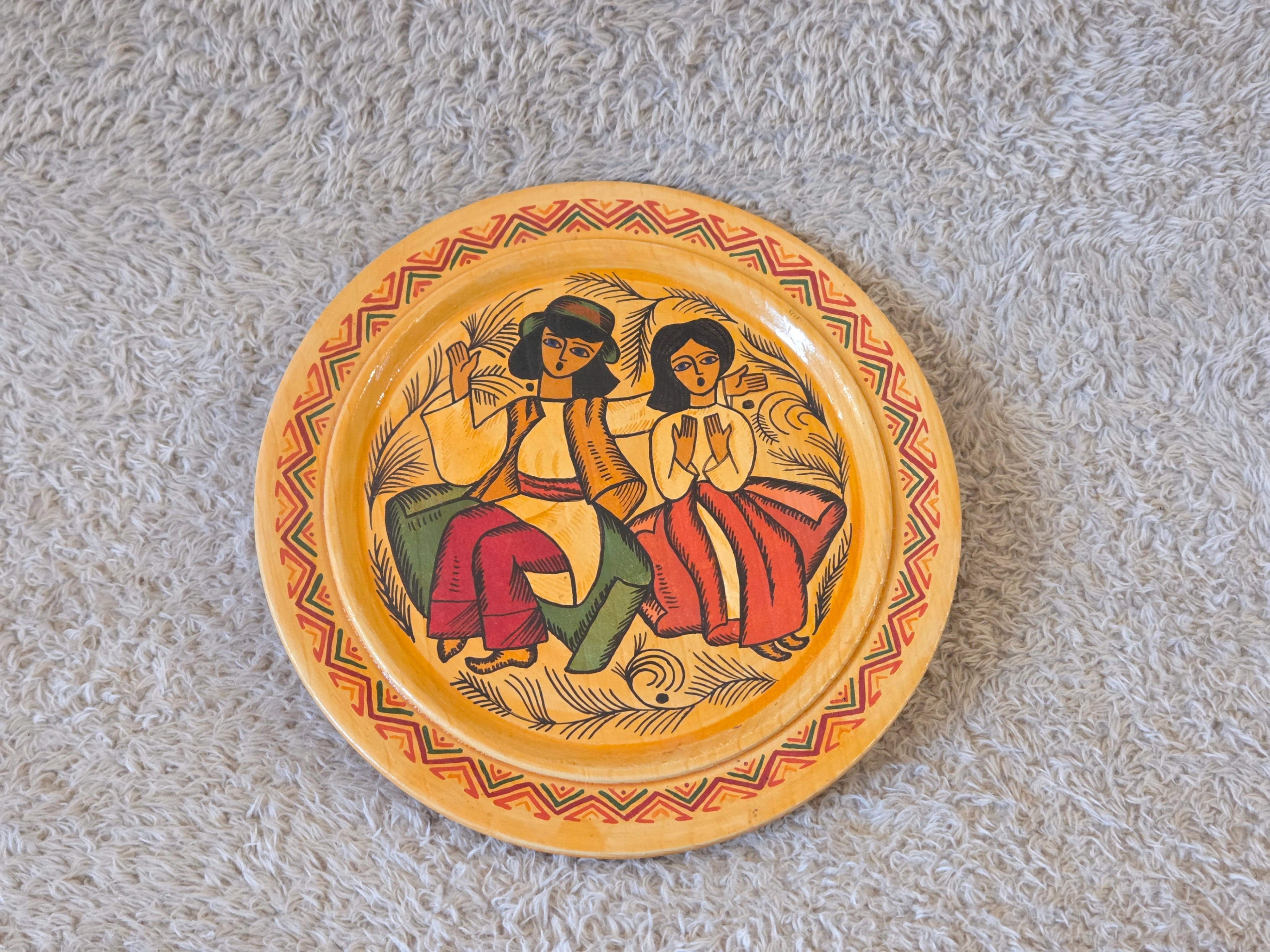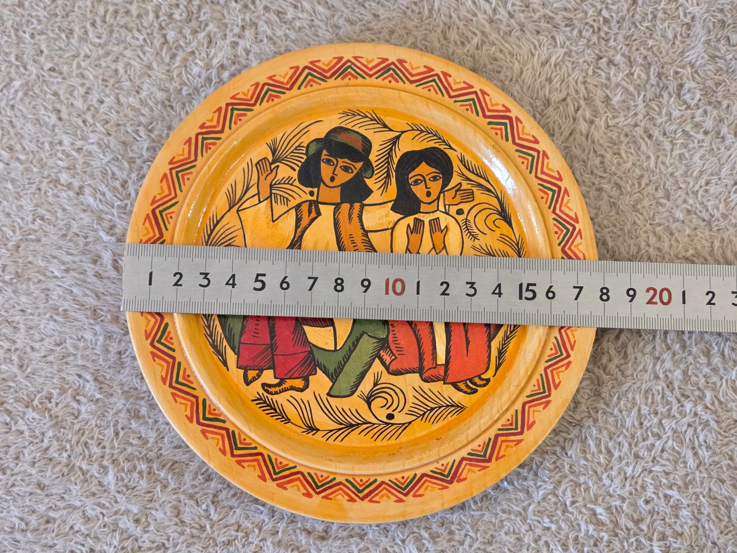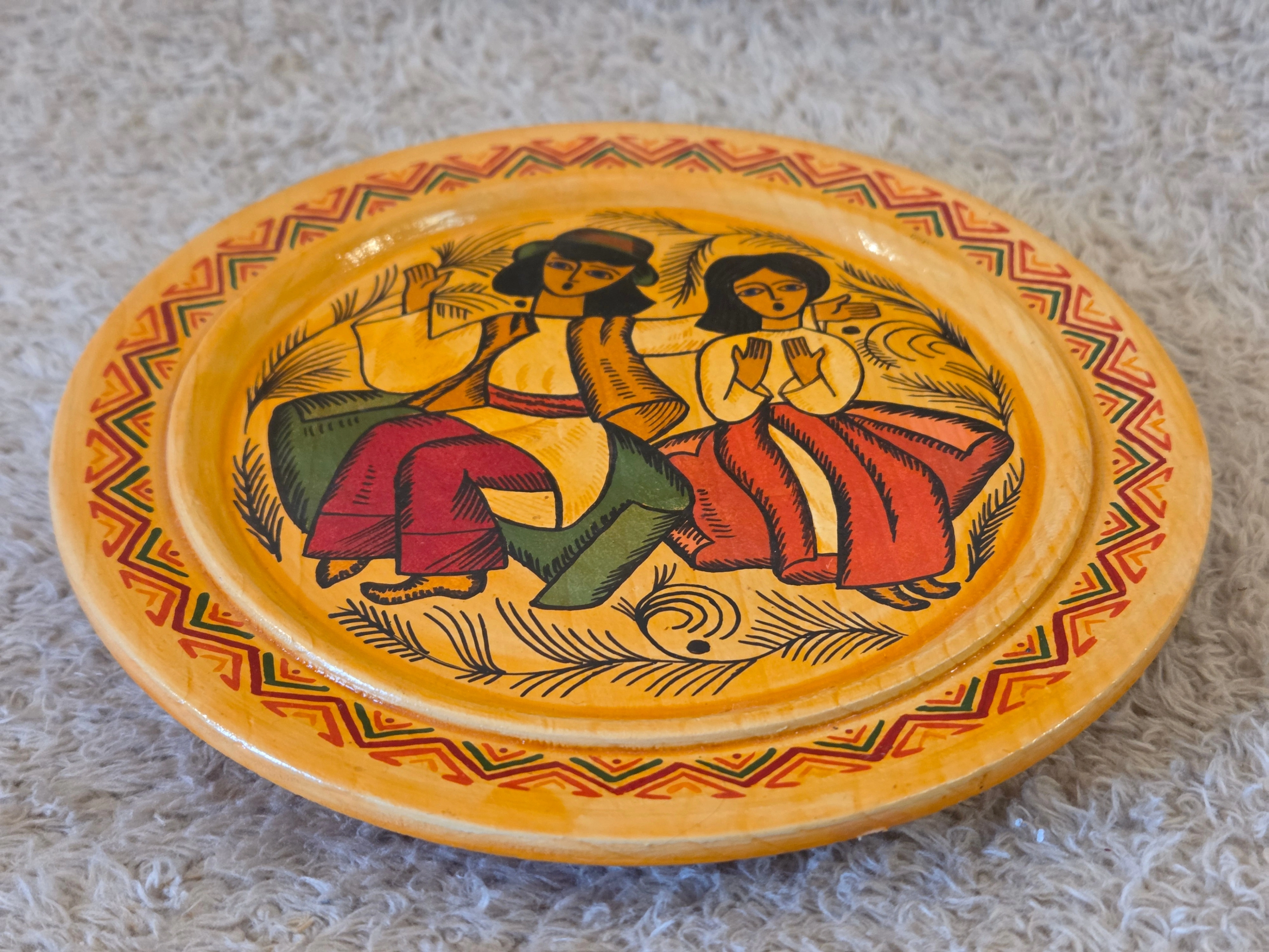Charming hand-painted wooden wall plate with an Eastern European folk-art scene of a couple in traditional dress. Turned wood with warm amber finish, graphic border and lacquered topcoat. Ready to hang – metal hanger installed on the back.