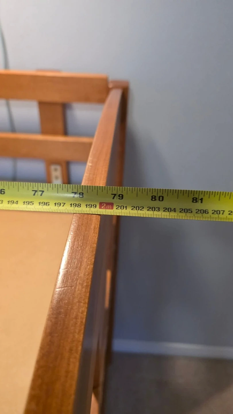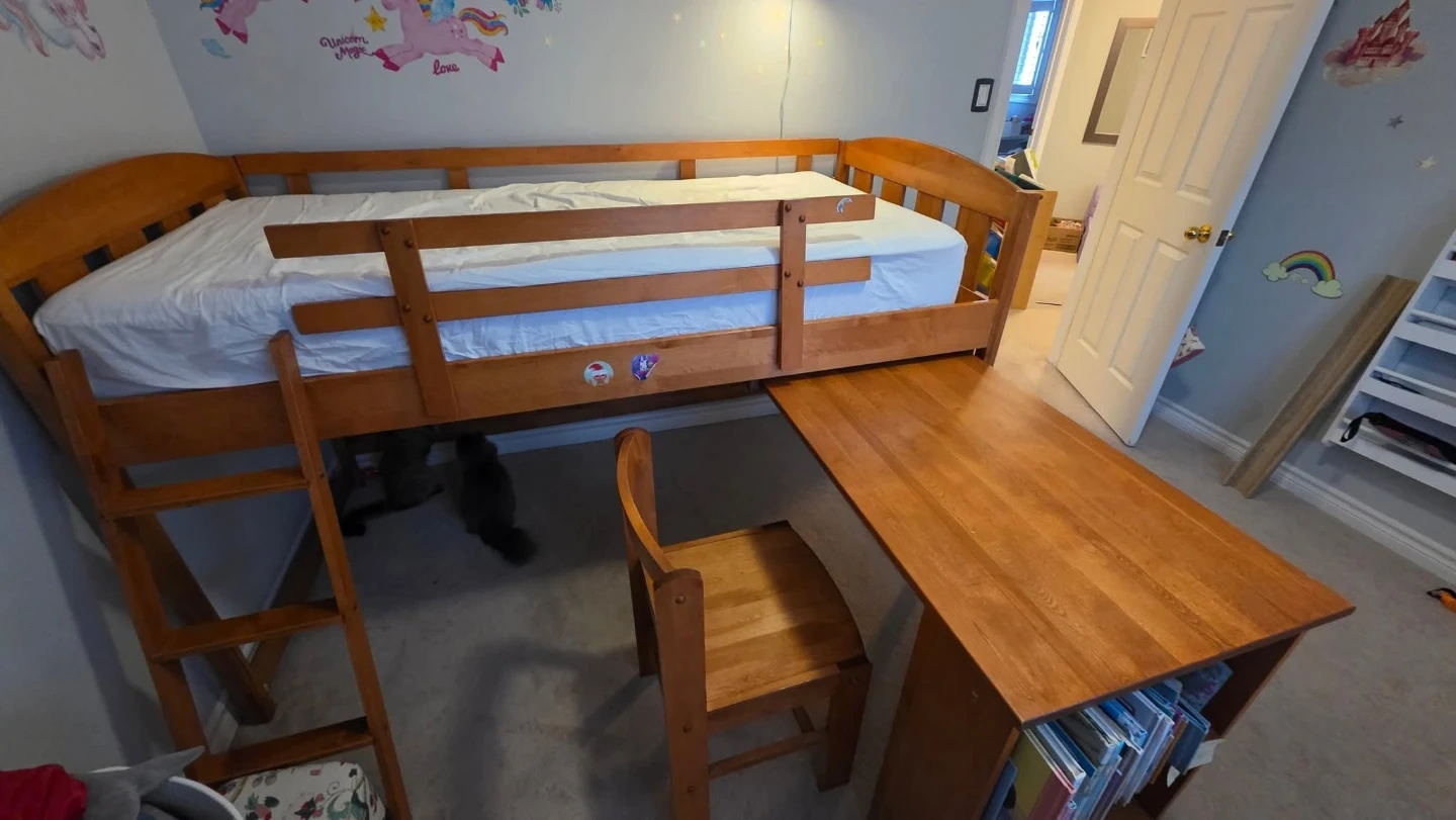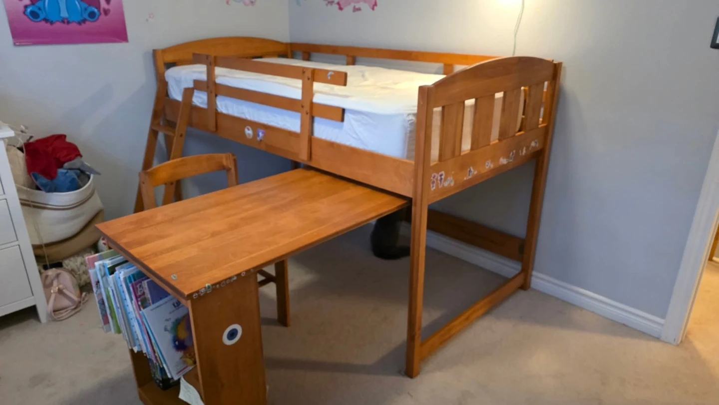 Here's a wooden loft bed that comes with a desk and chair! The bed is in good condition and has been well-maintained. The desk is integrated into the bed frame, making it a great space-saving solution for a kid's room or a small apartment. It is approximately 79 inches wide and 41 inches deep. Mattress is not included. Cash Only and pick up only.