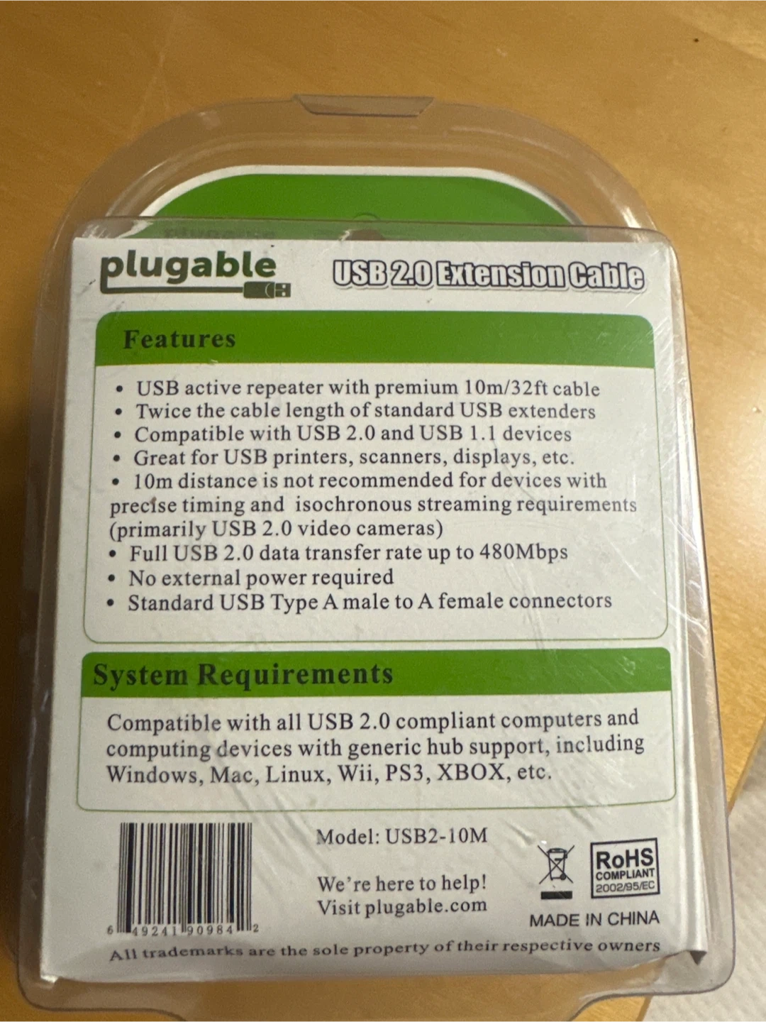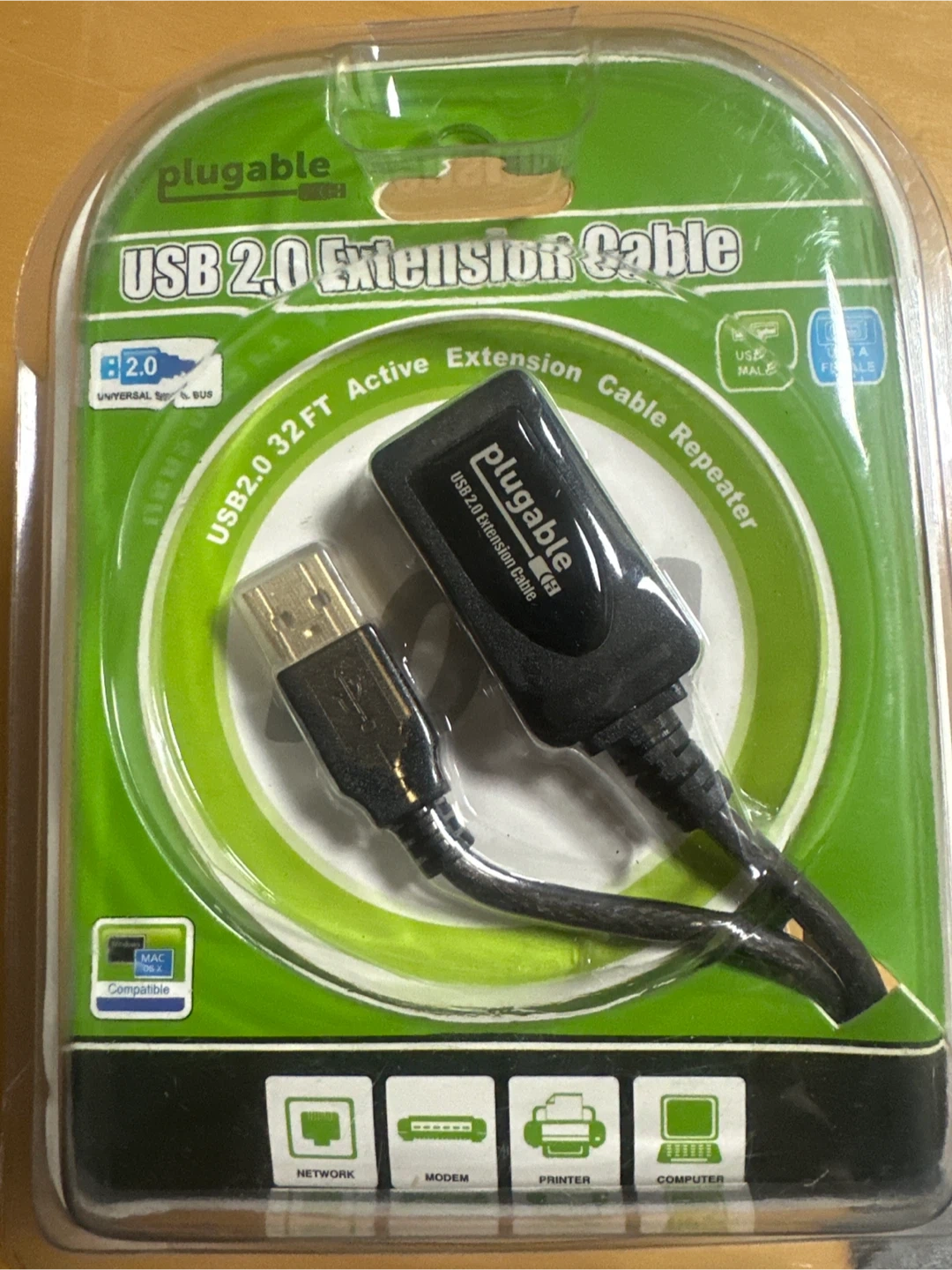 I'm selling a brand new Plugable USB 2.0 Extension Cable. This cable is 32 feet long and features an active repeater with a premium 10m/32ft cable. It's compatible with USB 2.0 and USB 1.1 devices, making it great for USB printers, scanners, and displays. The cable supports a full USB 2.0 data transfer rate of up to 480Mbps and does not require external power. It has a standard USB Type A male to A female connector. The cable is compatible with all USB 2.0 compliant computers and devices with generic hub support, including Windows, Mac, Linux, Wii, PS3, and XBOX. The model number is USB2-10M. The box is included
