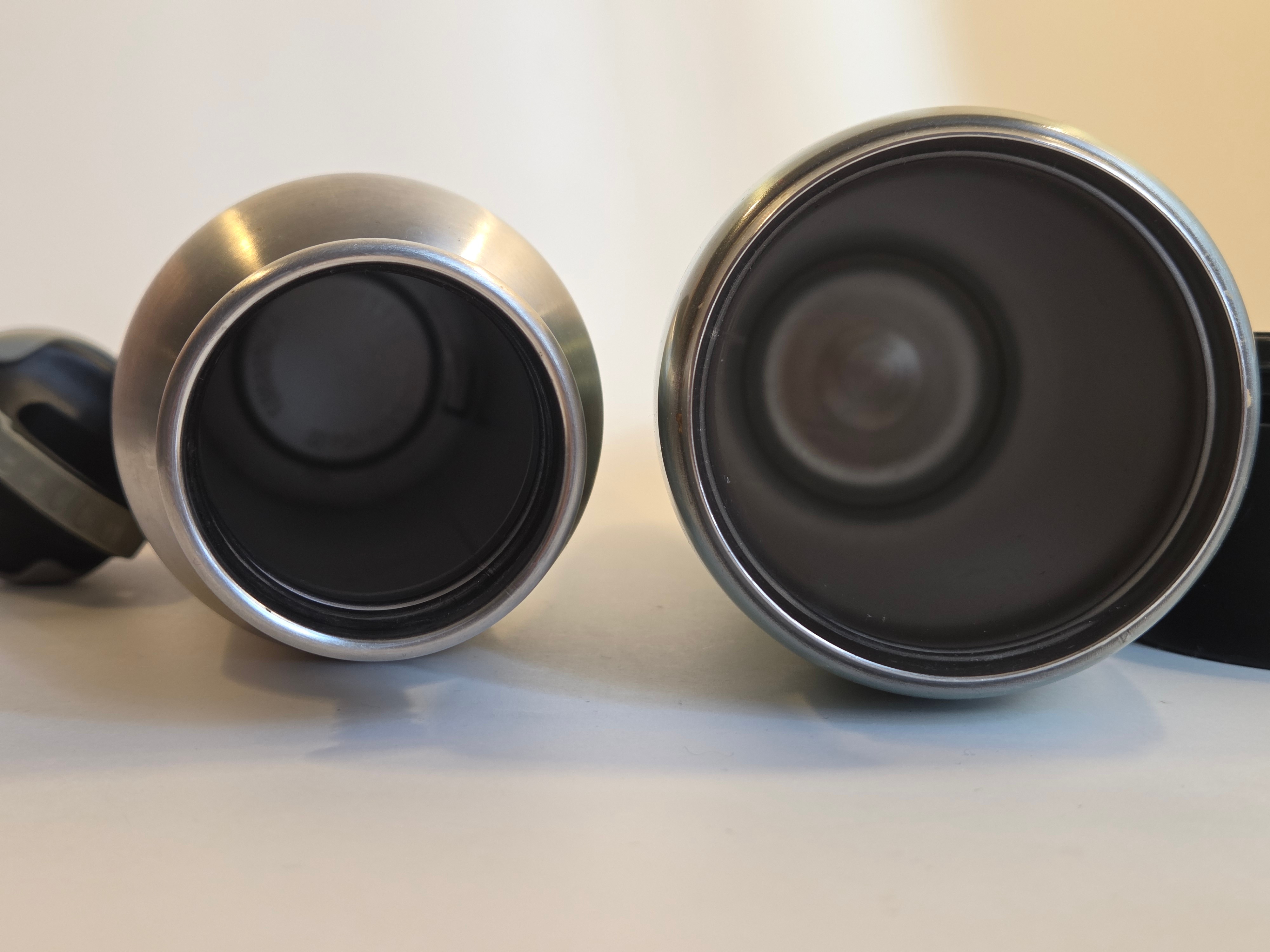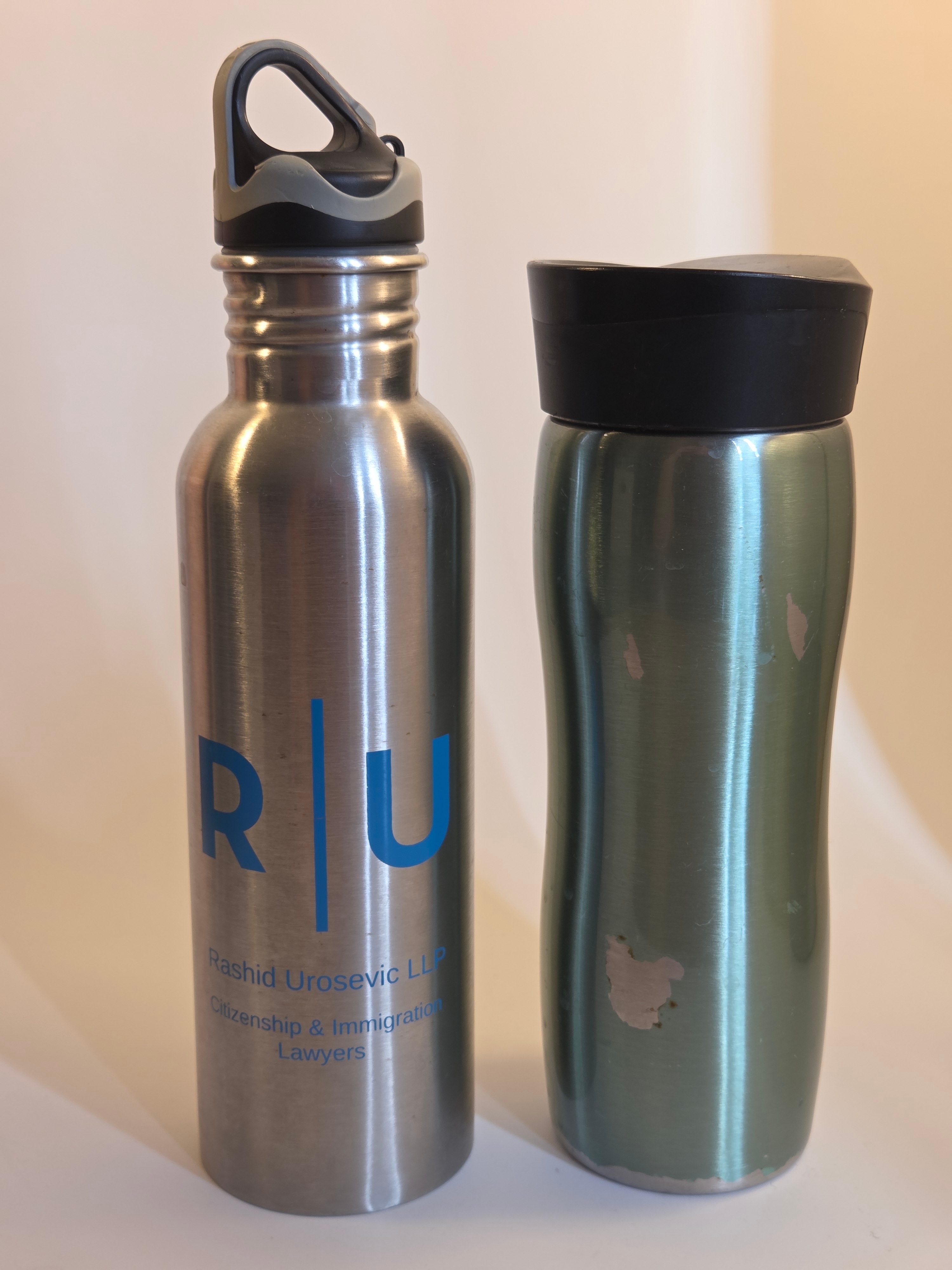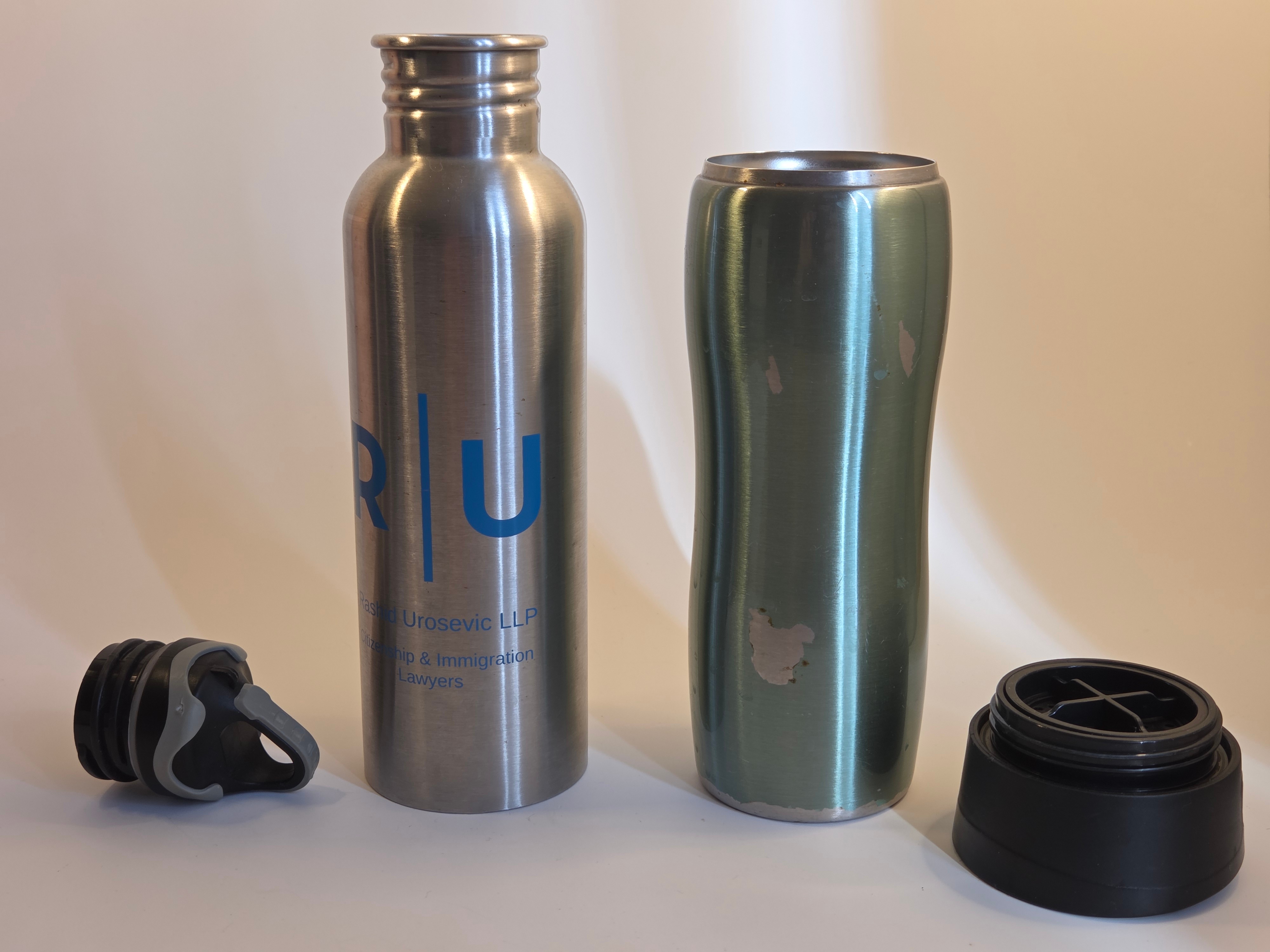 Set of 2 stainless steel drinkware – a classic water bottle and a travel coffee mug. Both washed and ready to go.
