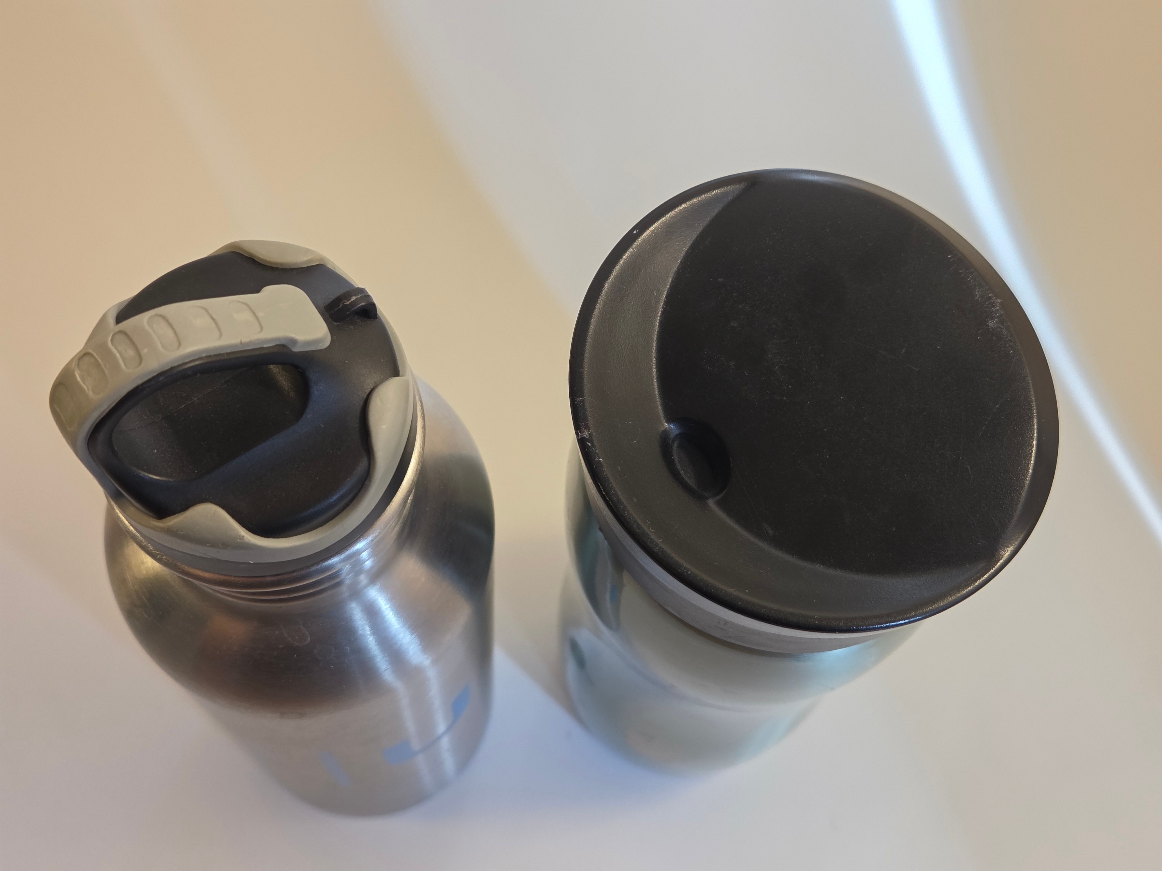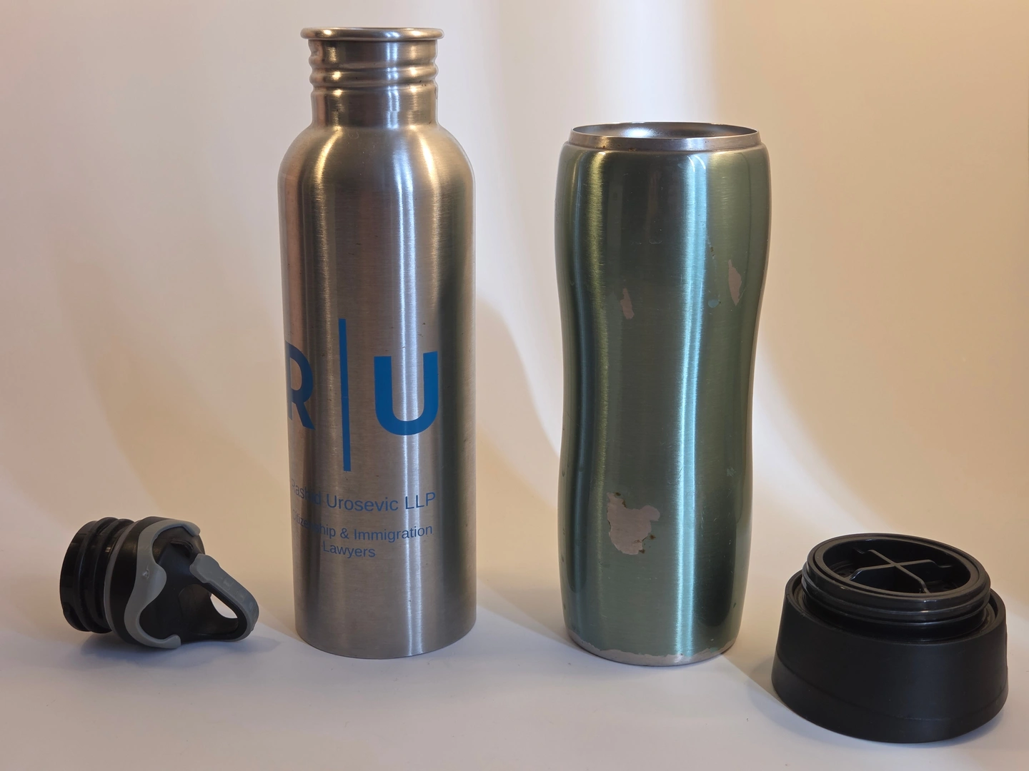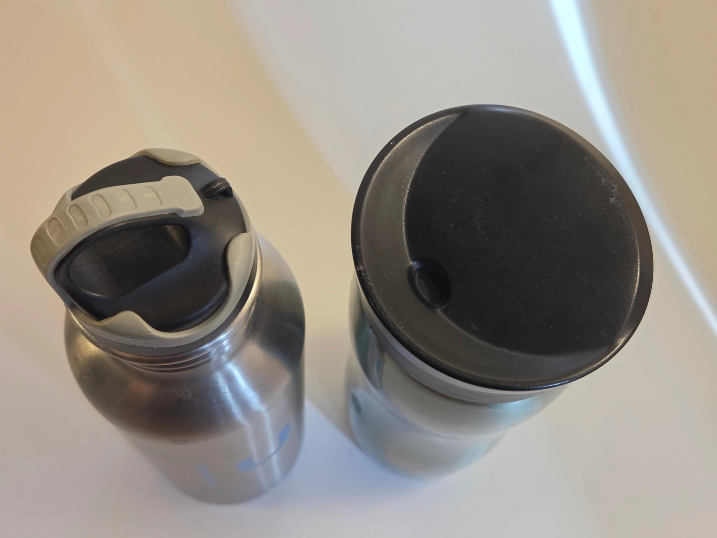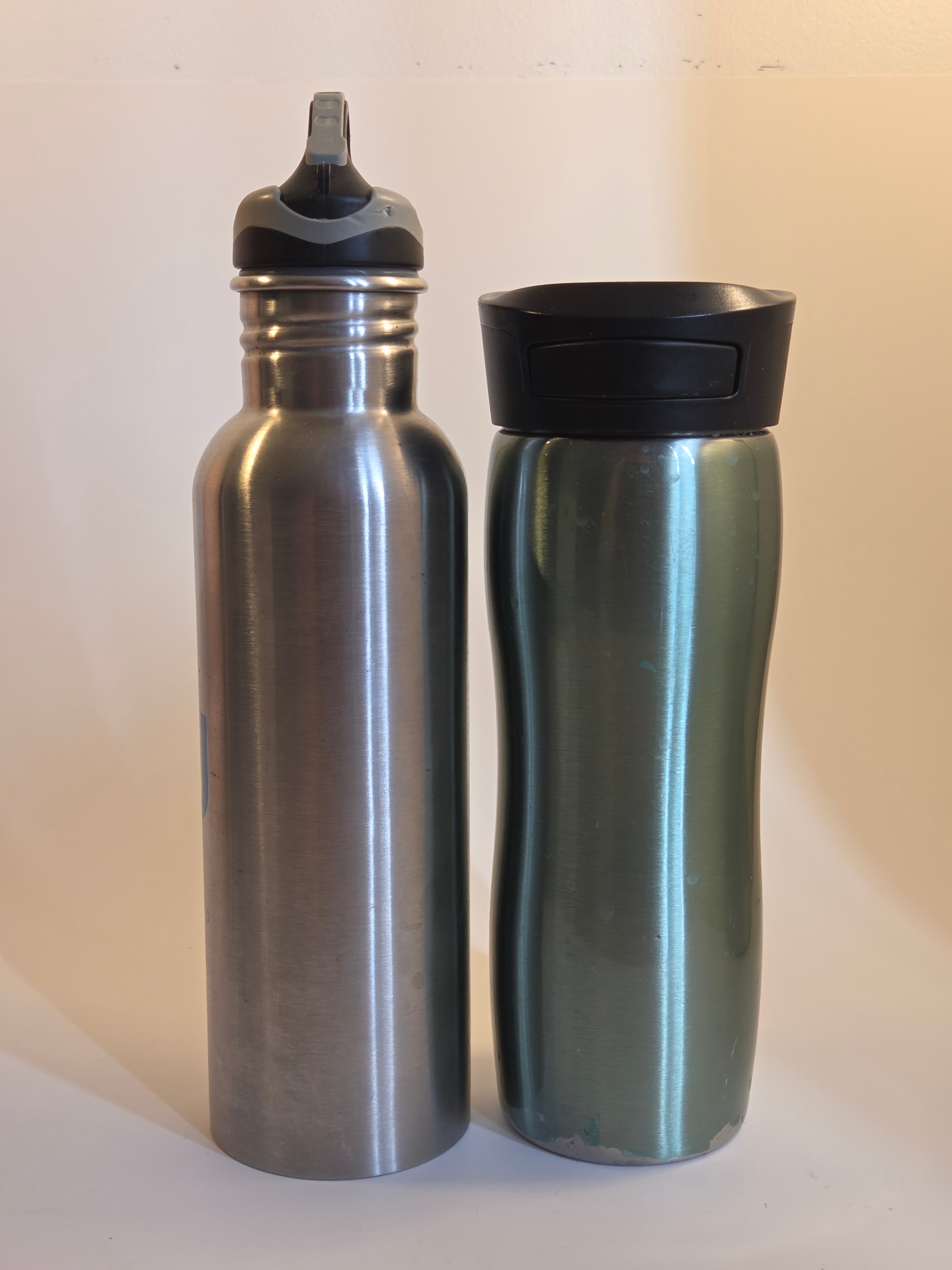 Condition: used. The bottle is in good working shape with light scuffs from normal use. The green travel mug shows visible paint chips and cosmetic wear on the outside, but the interior and lid are intact and usable. See photos for details.