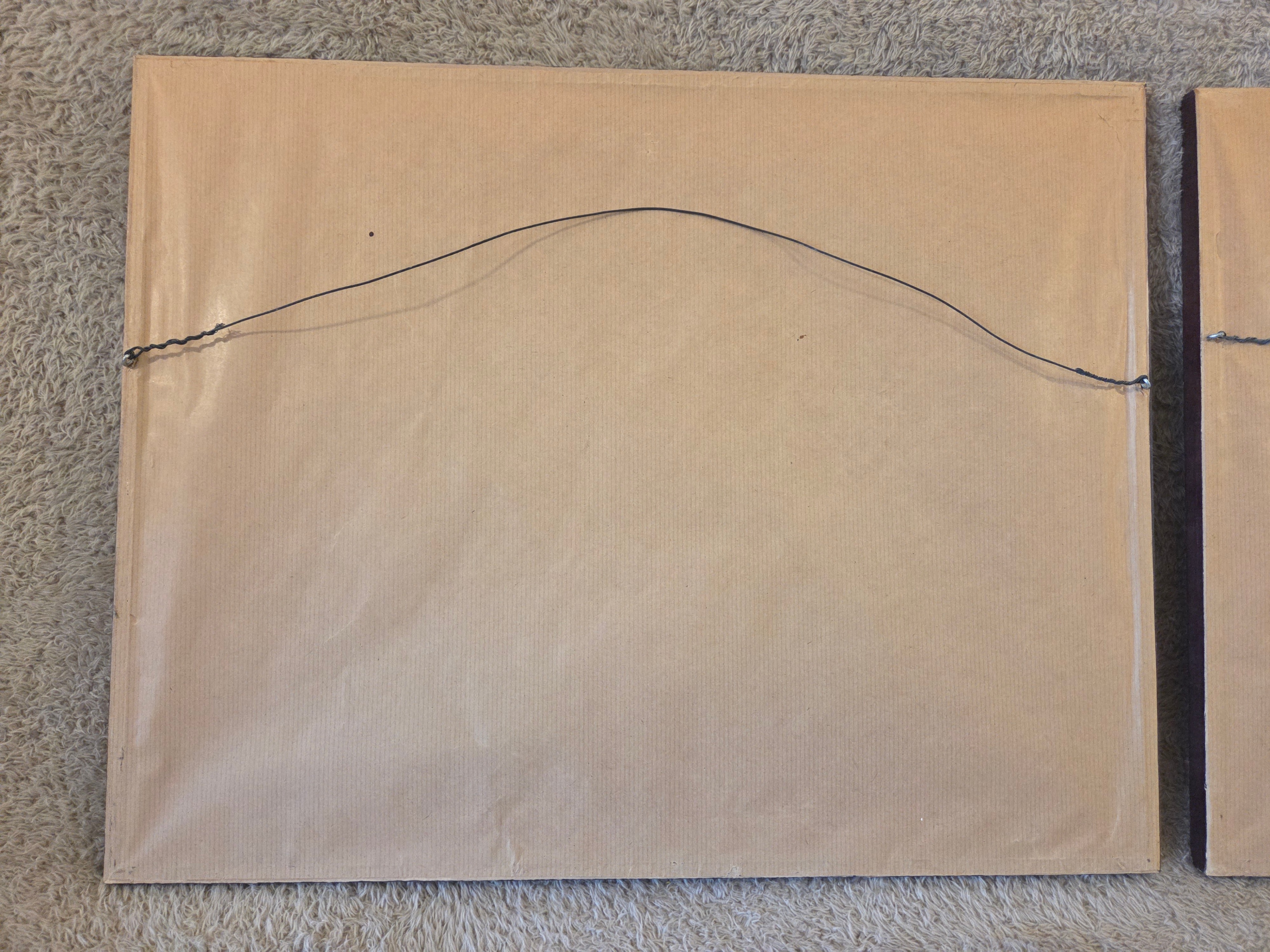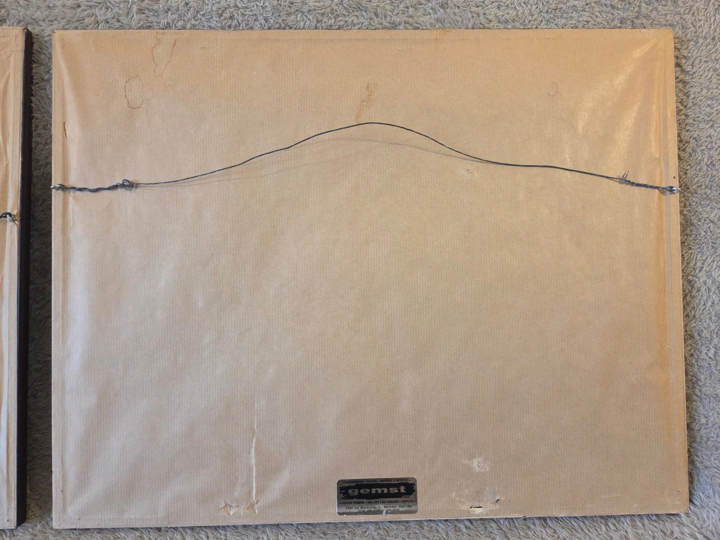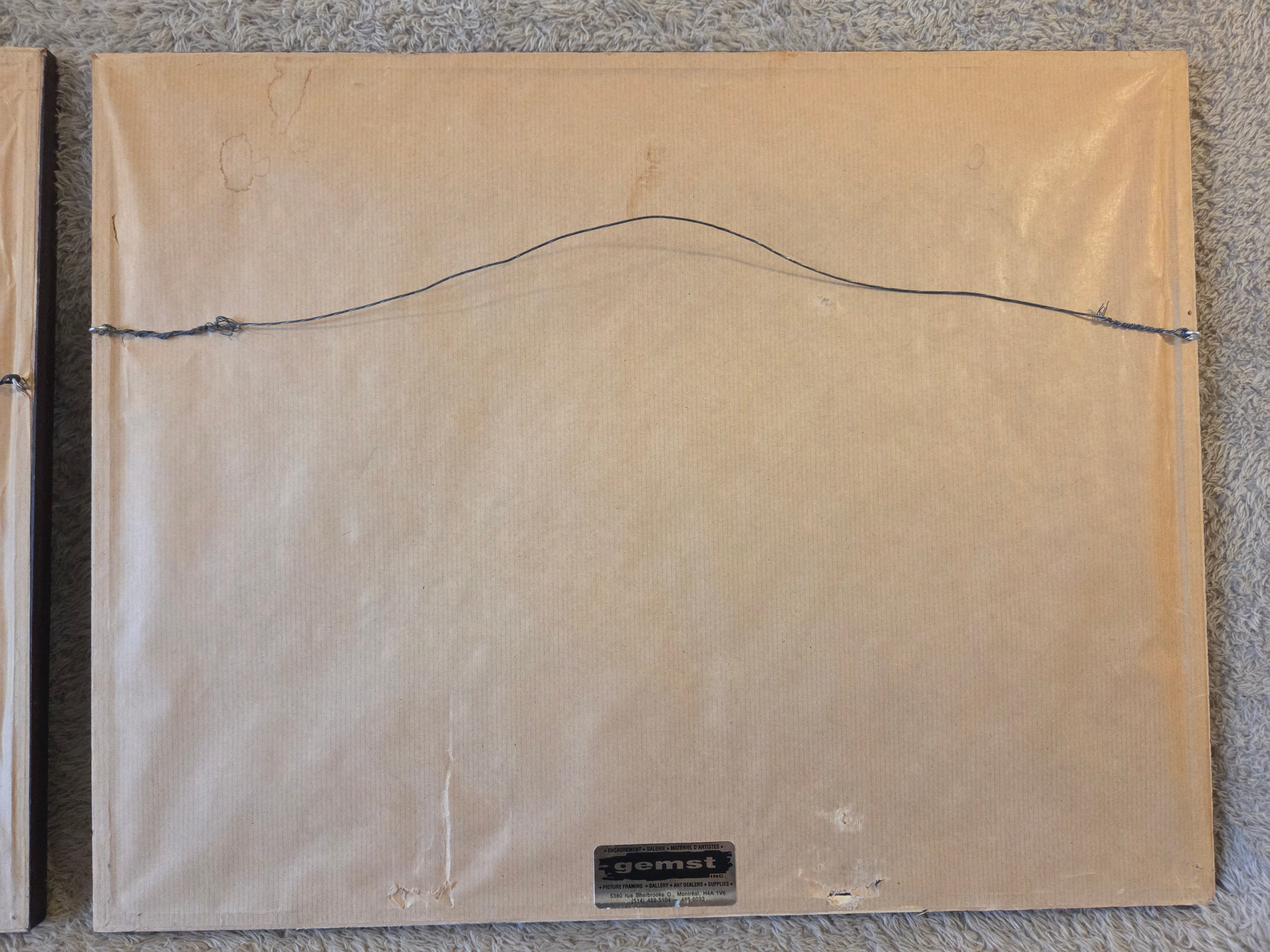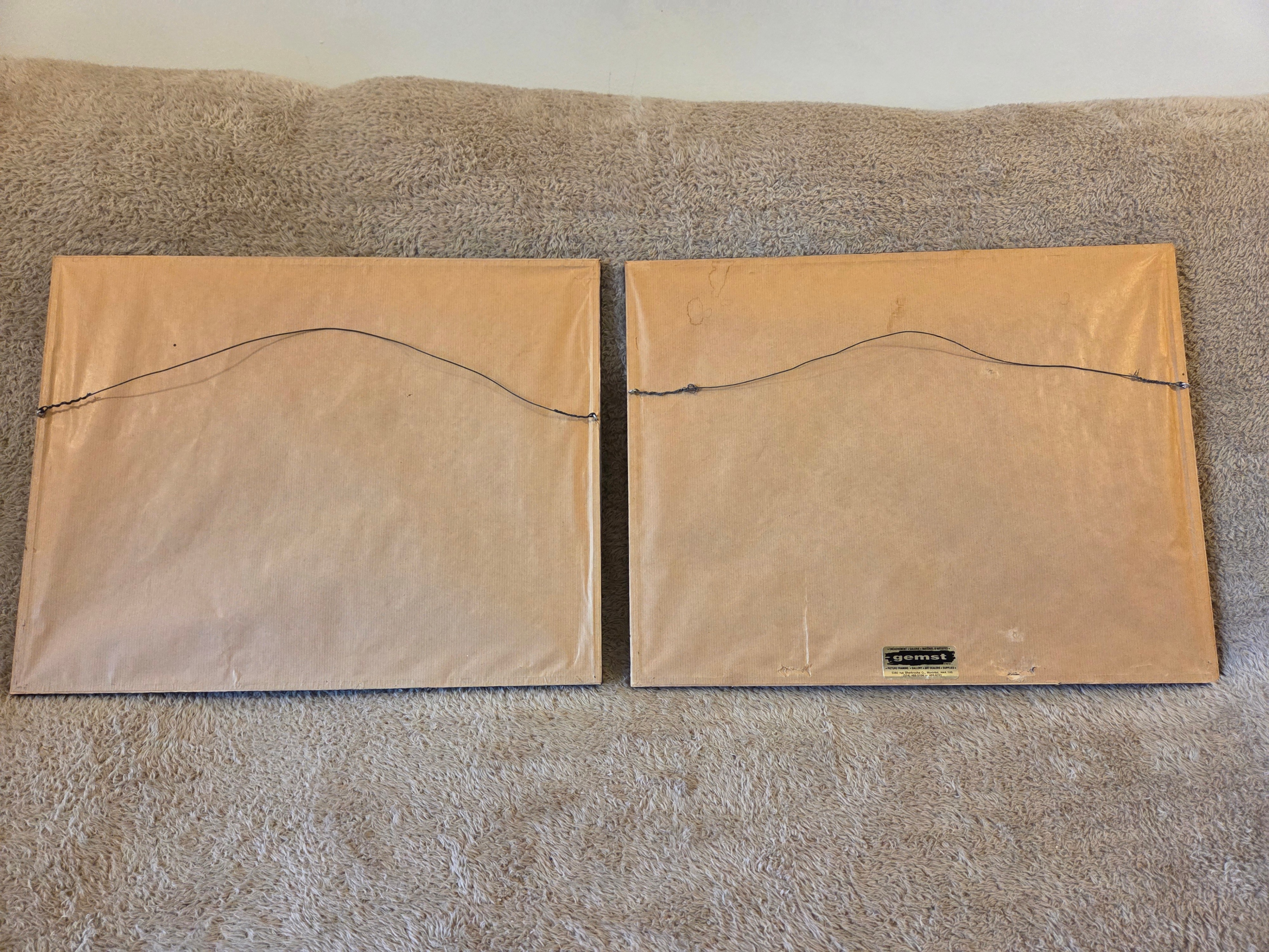 • Framing: wood frames, white and blue mats, glass fronts, paper dust covers and hanging wires intact