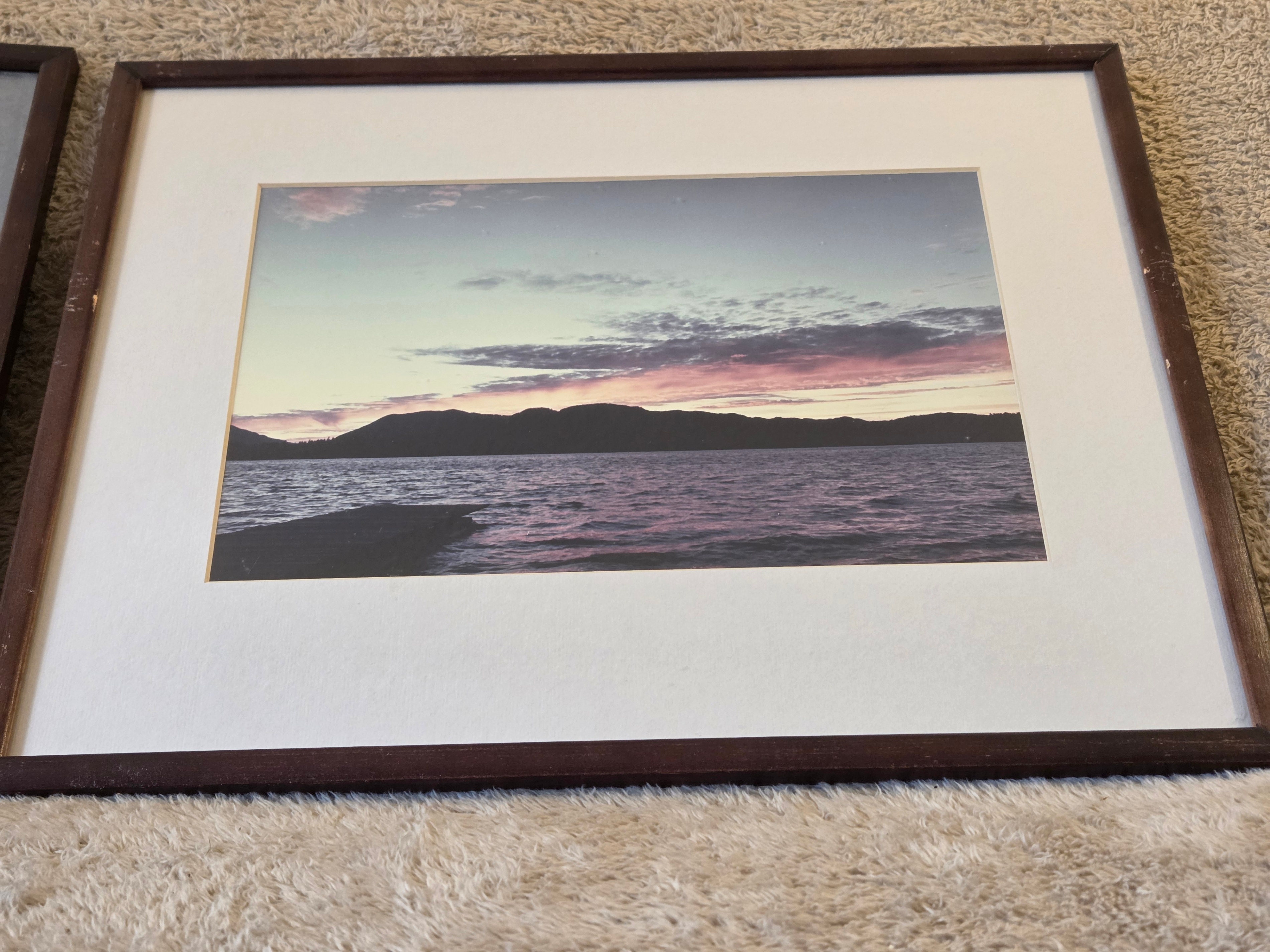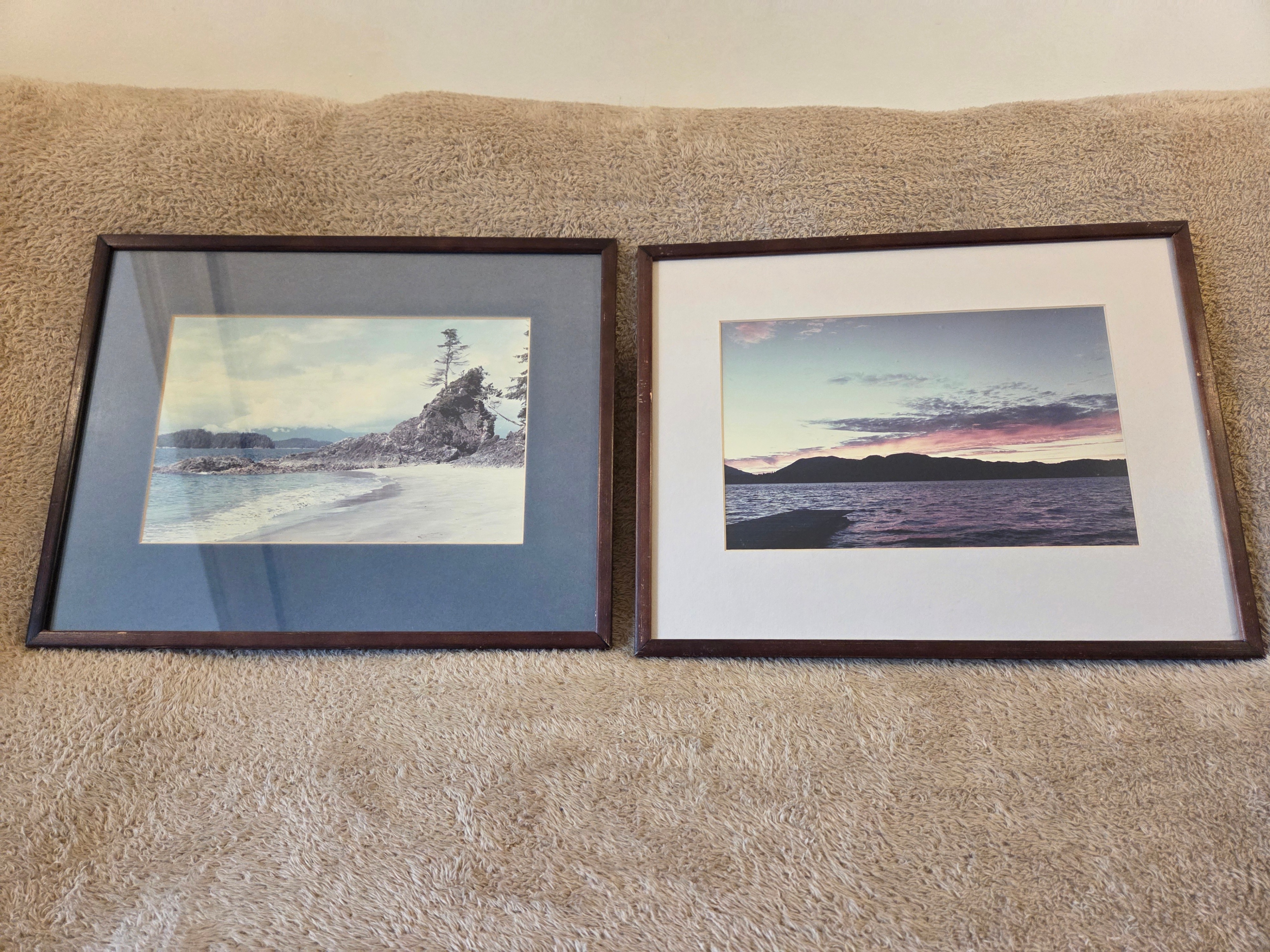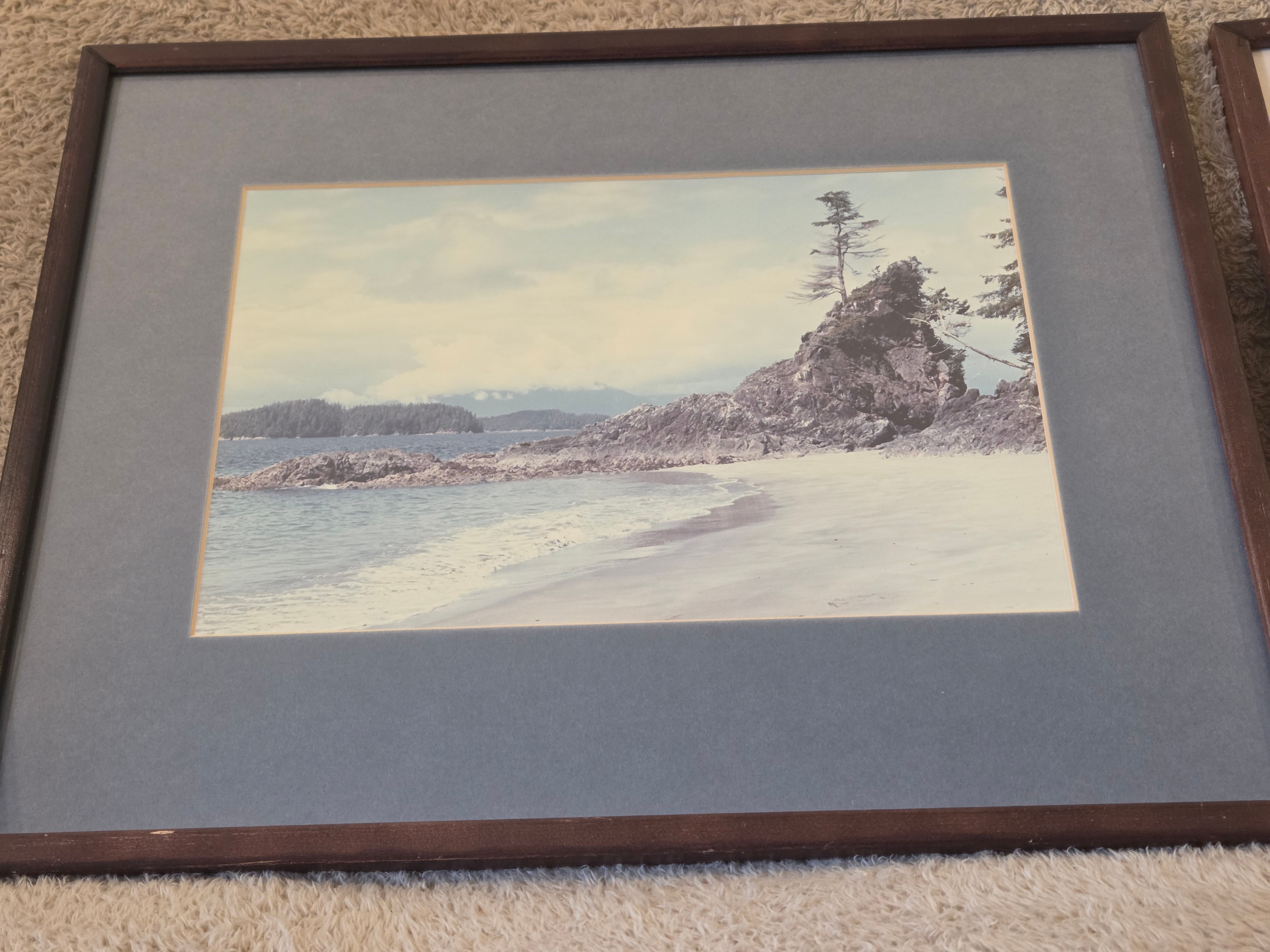 Tasteful pair of professionally framed coastal landscape photo prints, framed in Canada by Gemst Inc. in Montréal. Each piece is matted under glass with a dark brown wood frame and hanging wire – ready to go on the wall.