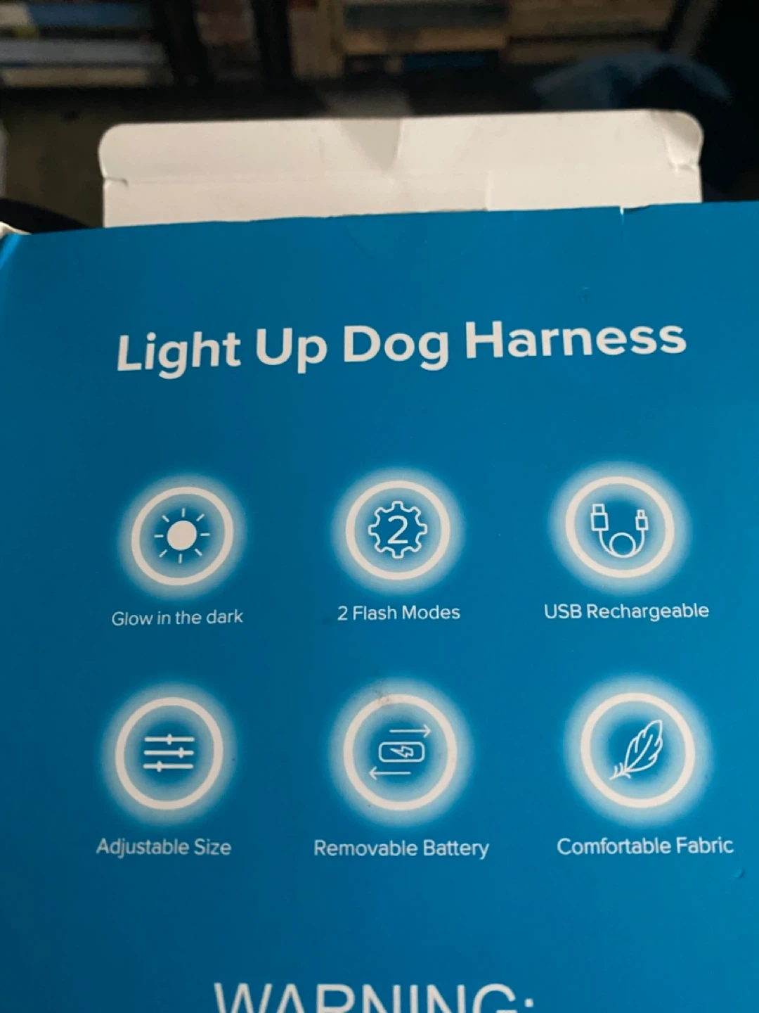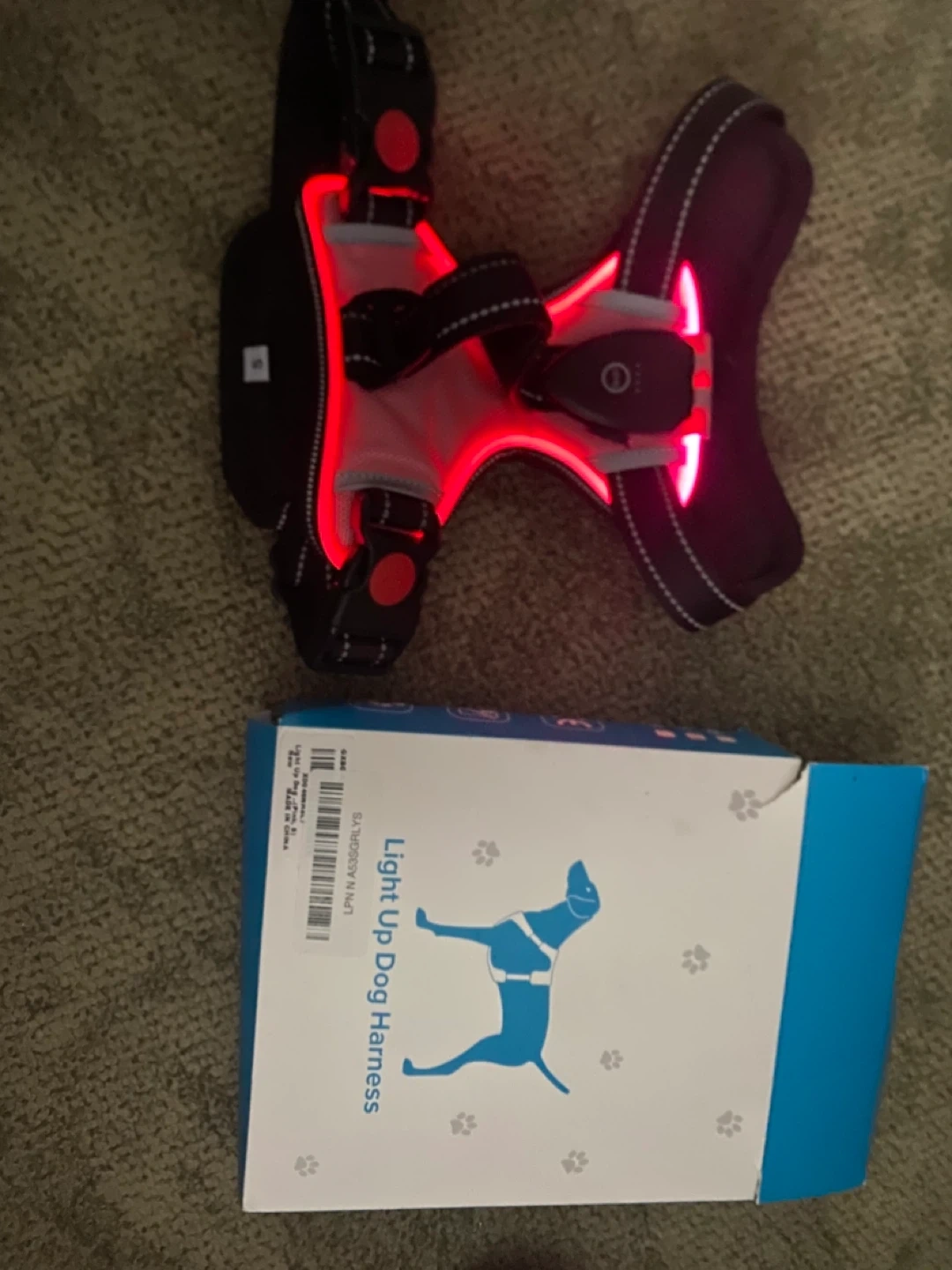 Selling a brand new light up dog harness Size small. It is in its original box! It has a glow in the dark feature and 2 flash modes. It's USB rechargeable, has an adjustable size, a removable battery, and is made of comfortable fabric