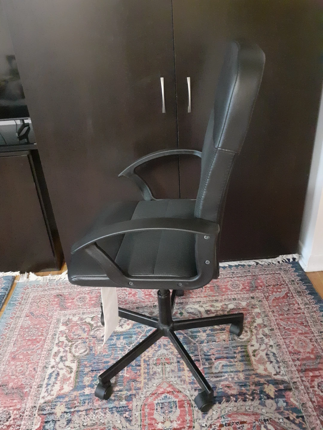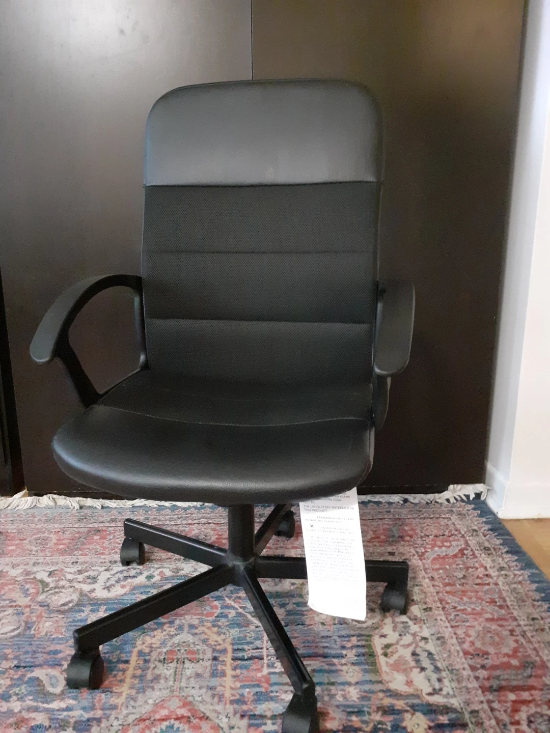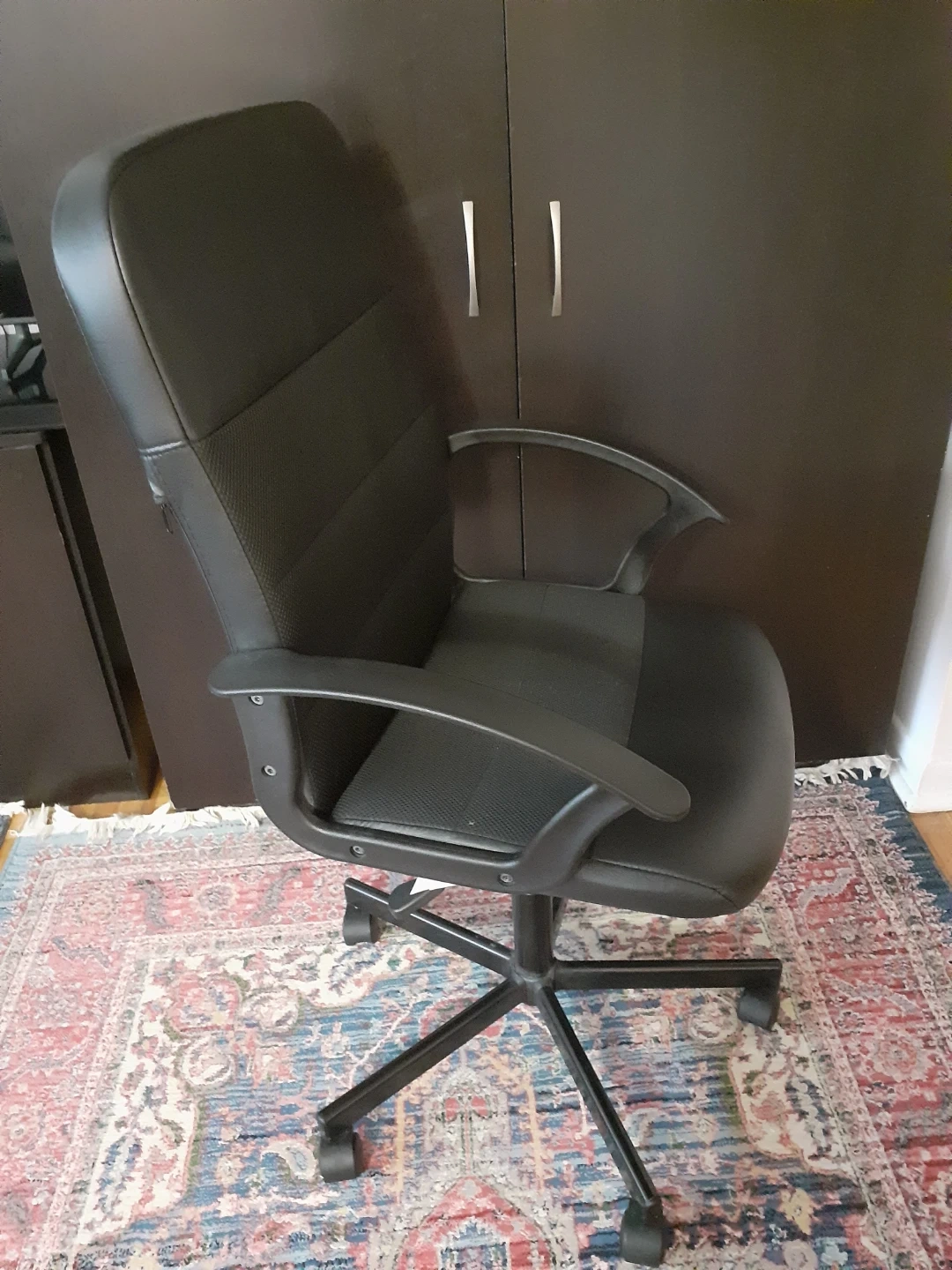 Selling one Ikea black office chairs in good condition. It's perfect for a home office or study space. It has a comfortable backrest and adjustable height. It's ready to go to a new home!