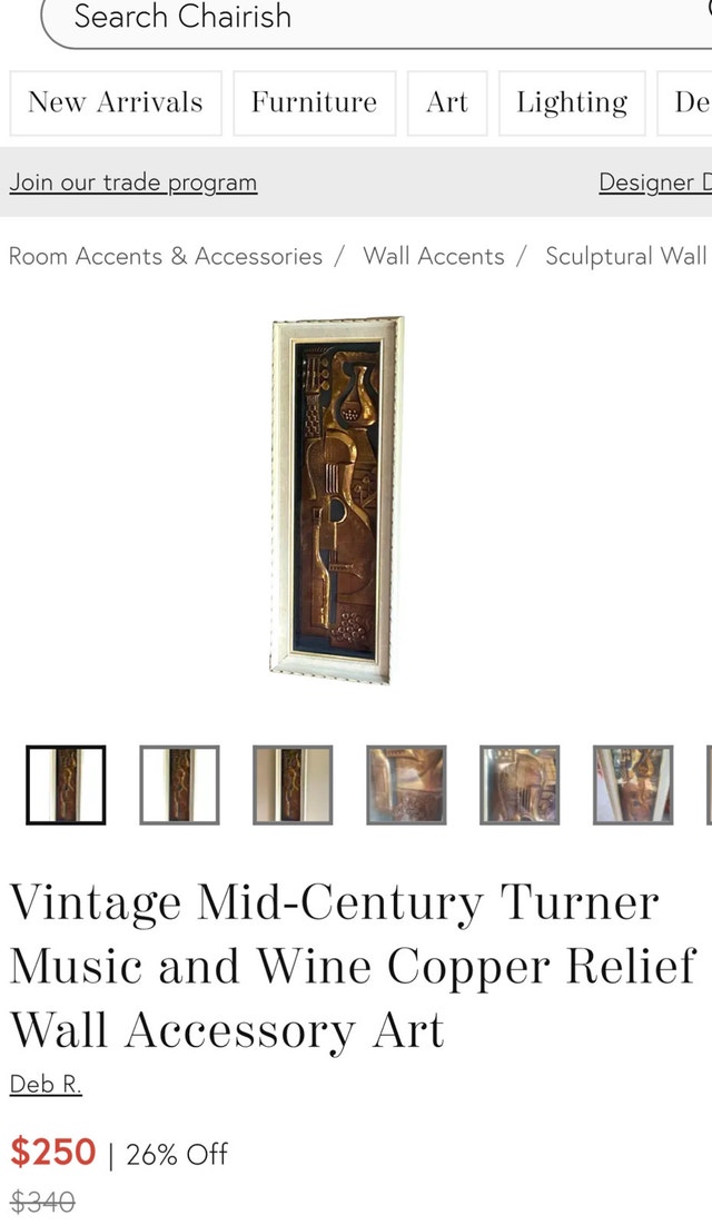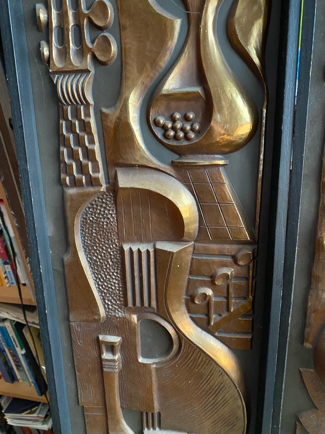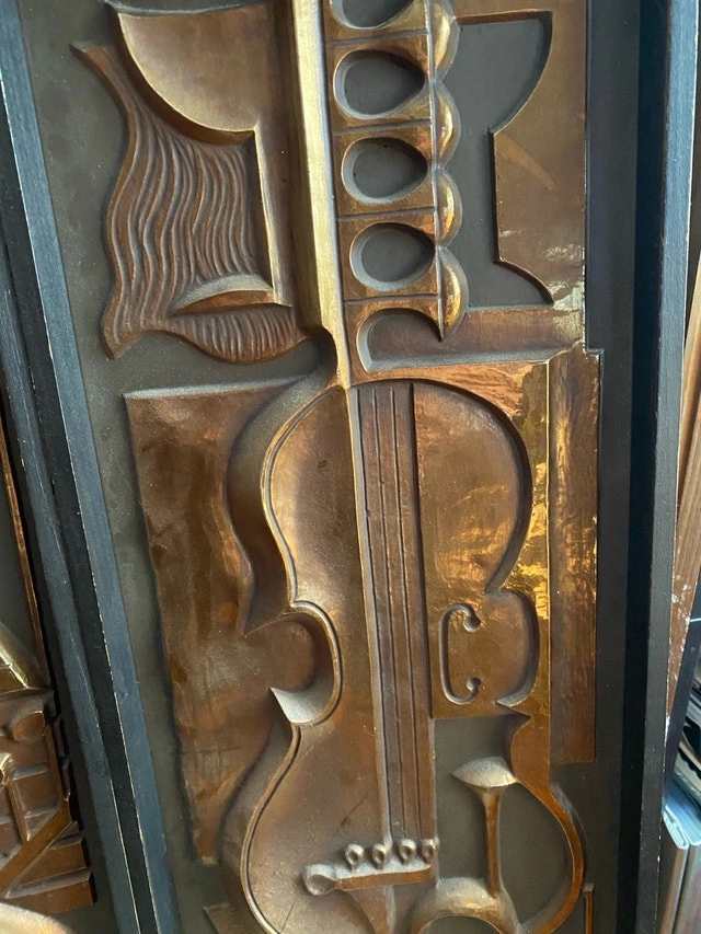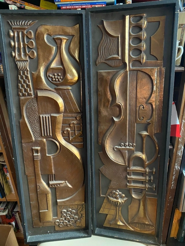 Perfect wall accent for wine cellar, music room / studio. Bought by owner from renowned art deco dealer Red Indian on Queen St West, Toronto - mid 90s - Importer from Belgium. From a distance (unless touched or carried) gives convincing illusion of it being constructed from metal copper or brass. Only other reference to this item is found on website - see photos. Ready to hang two light-weight unique wall sculptures, showcasing a captivating mid-century modern mold, design with Musical Instruments and Wine Motifs in a copper-tone finish. These two pieces are in used condition, displaying some signs of age that add to their unique charm and character. Approximate dimensions: * Width: 11 inches * Height: 35 inches * Depth: 1.5 inches