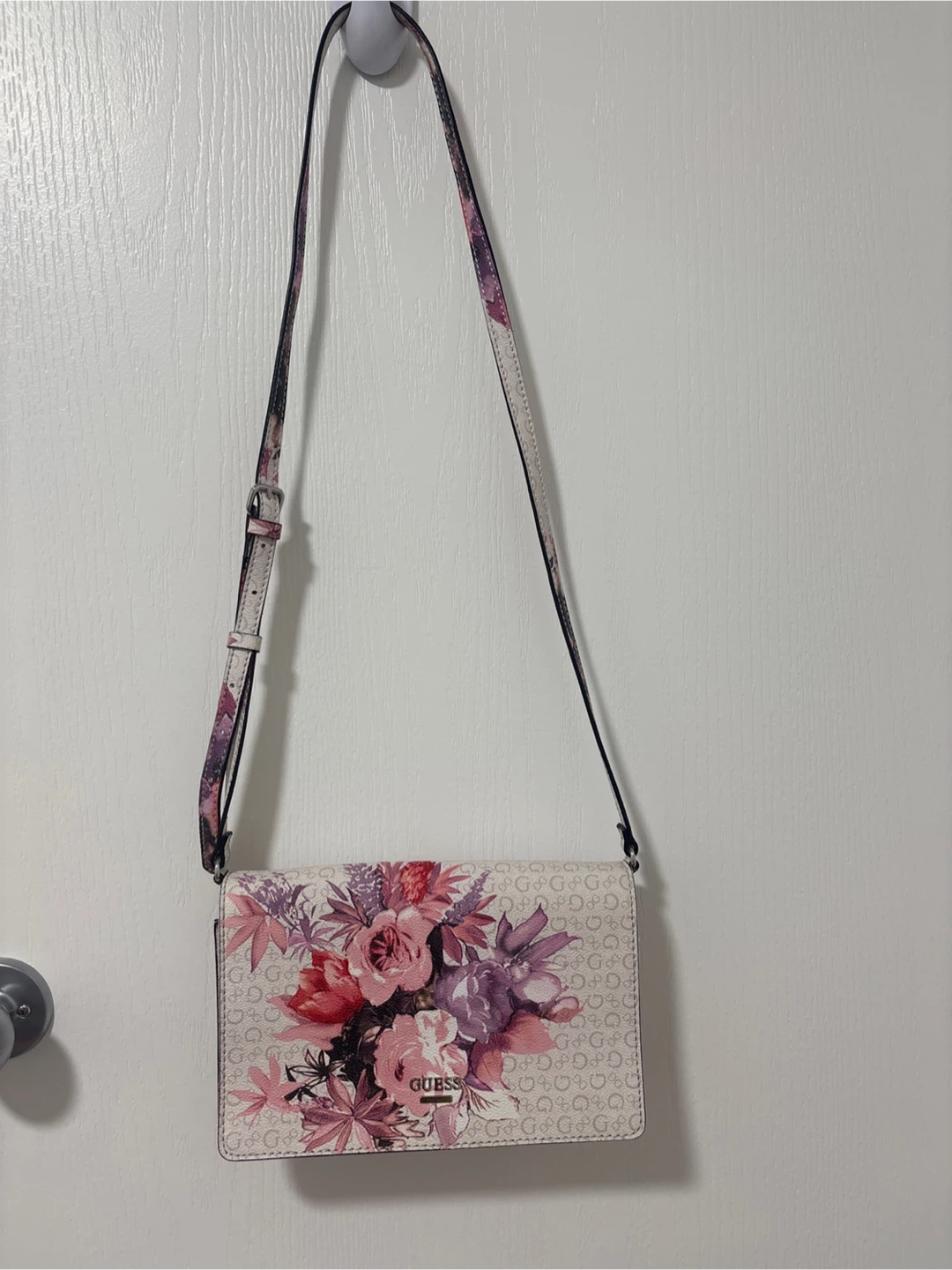 Selling a cute Guess crossbody bag with a floral print! It's in great condition and perfect for adding a pop of colour to your outfit. The bag features the Guess logo subtly incorporated into the background pattern. Pick up cash only