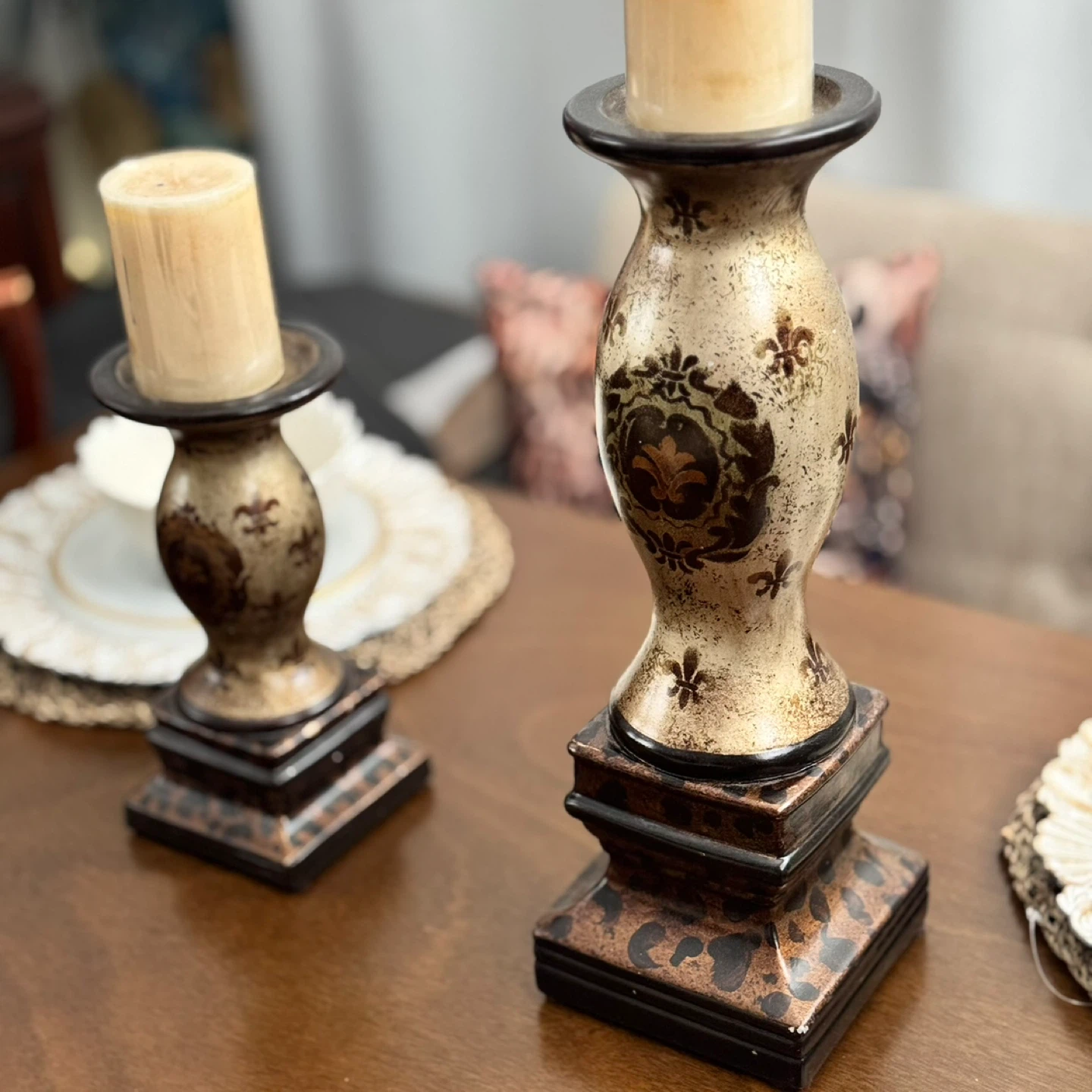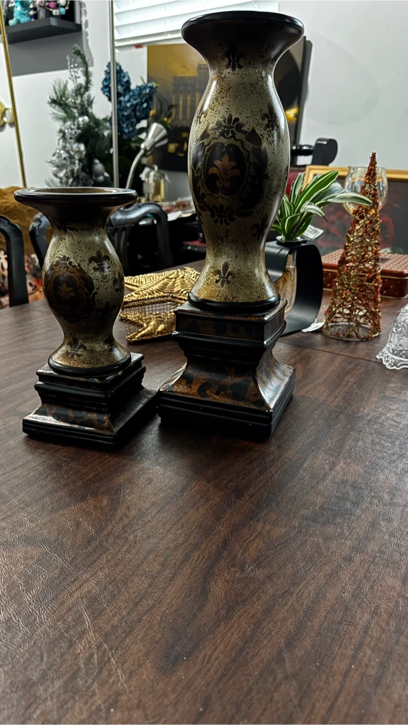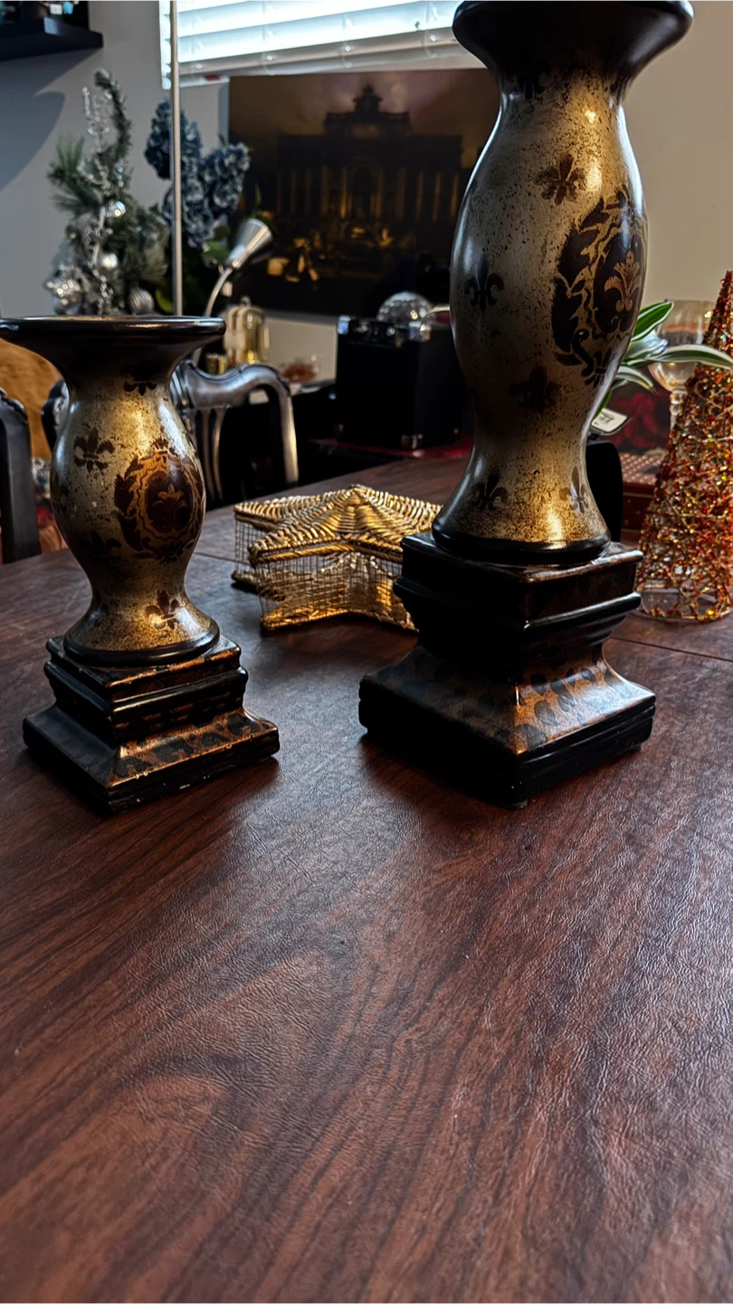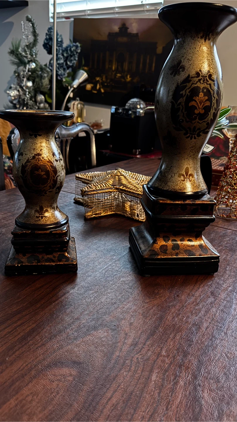 Selling a set of decorative candle holders. They have a unique design with fleur-de-lis accents and a black and gold color scheme. Perfect for adding a touch of elegance to any room