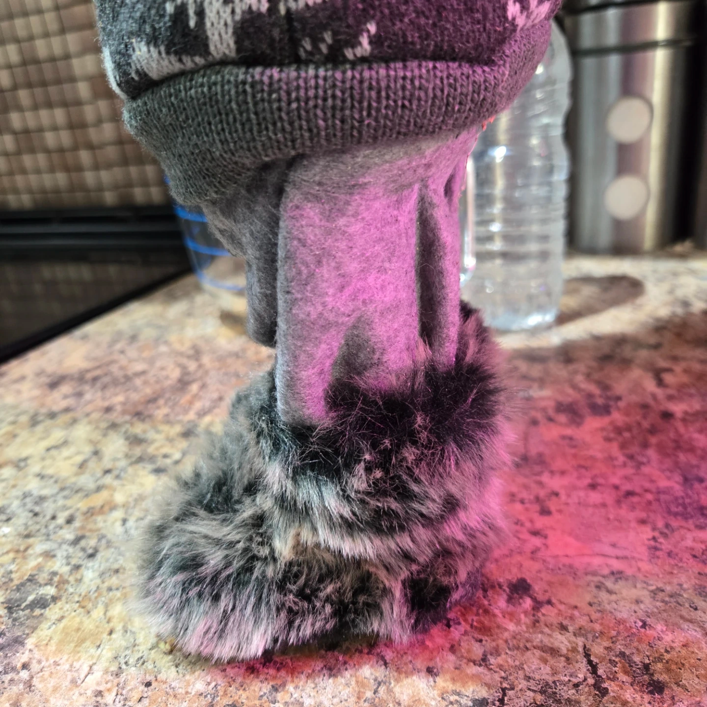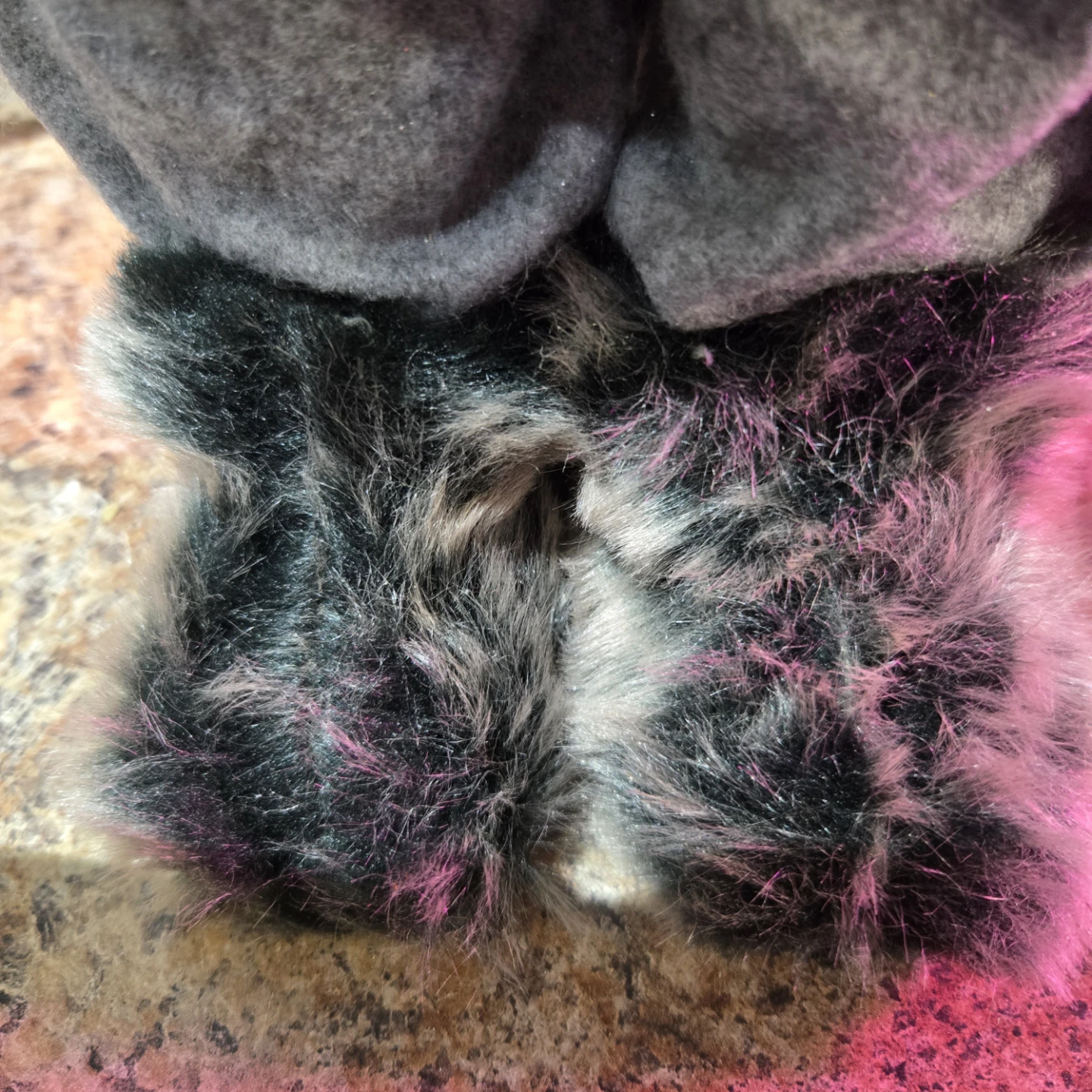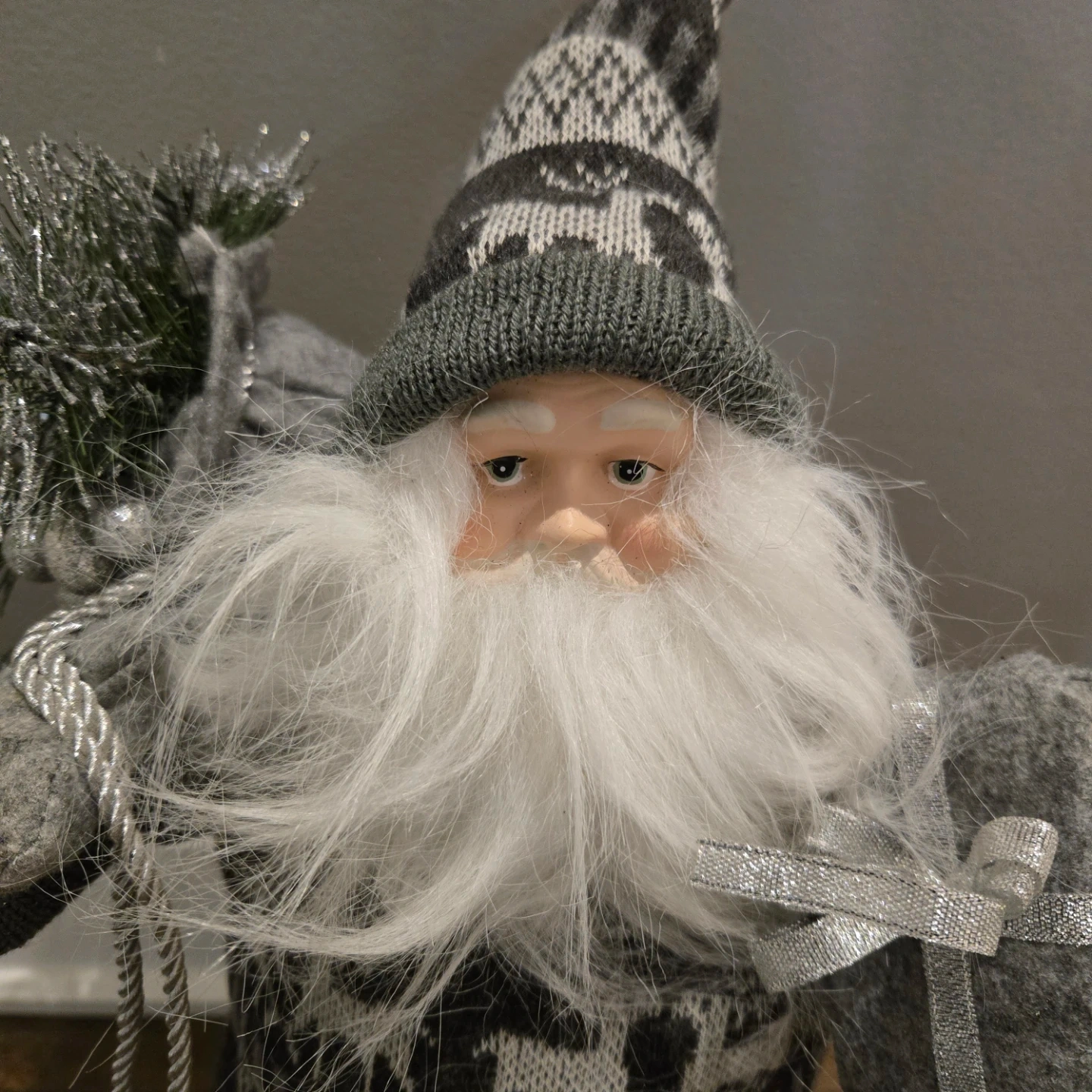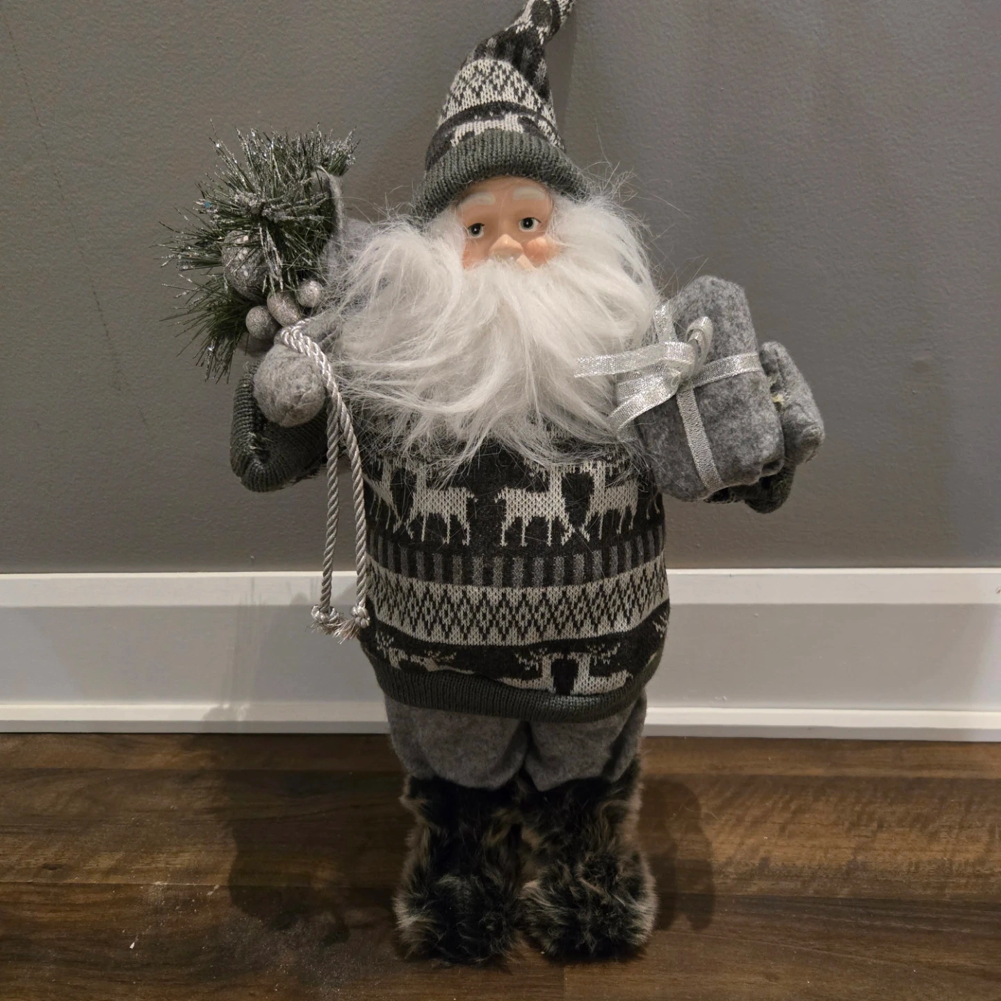 Here's a cute grey Santa decoration for the holidays! It has a grey and white patterned sweater and hat, a long white beard, and is holding a little bundle of silver ornaments. It stands on furry boots.