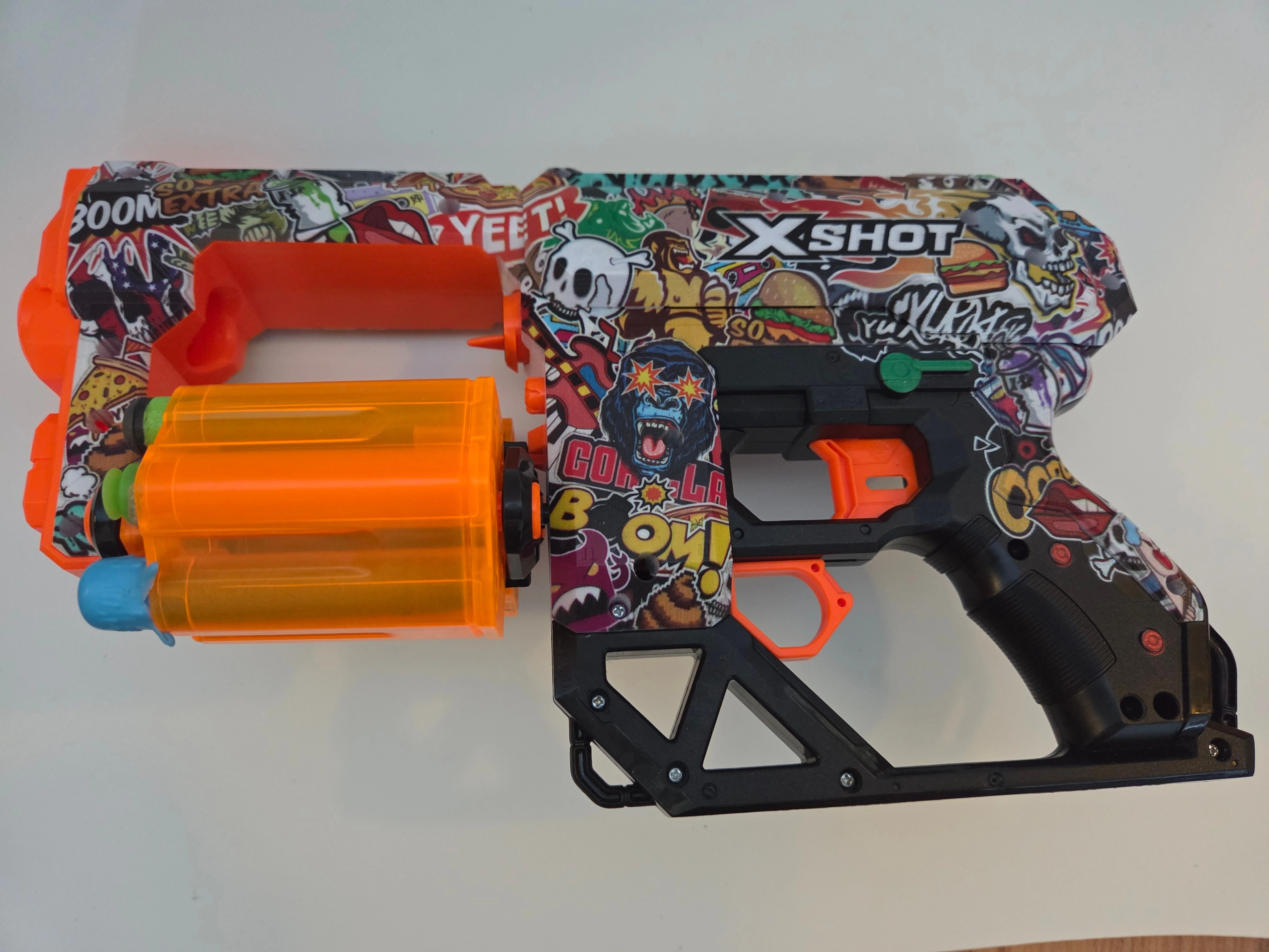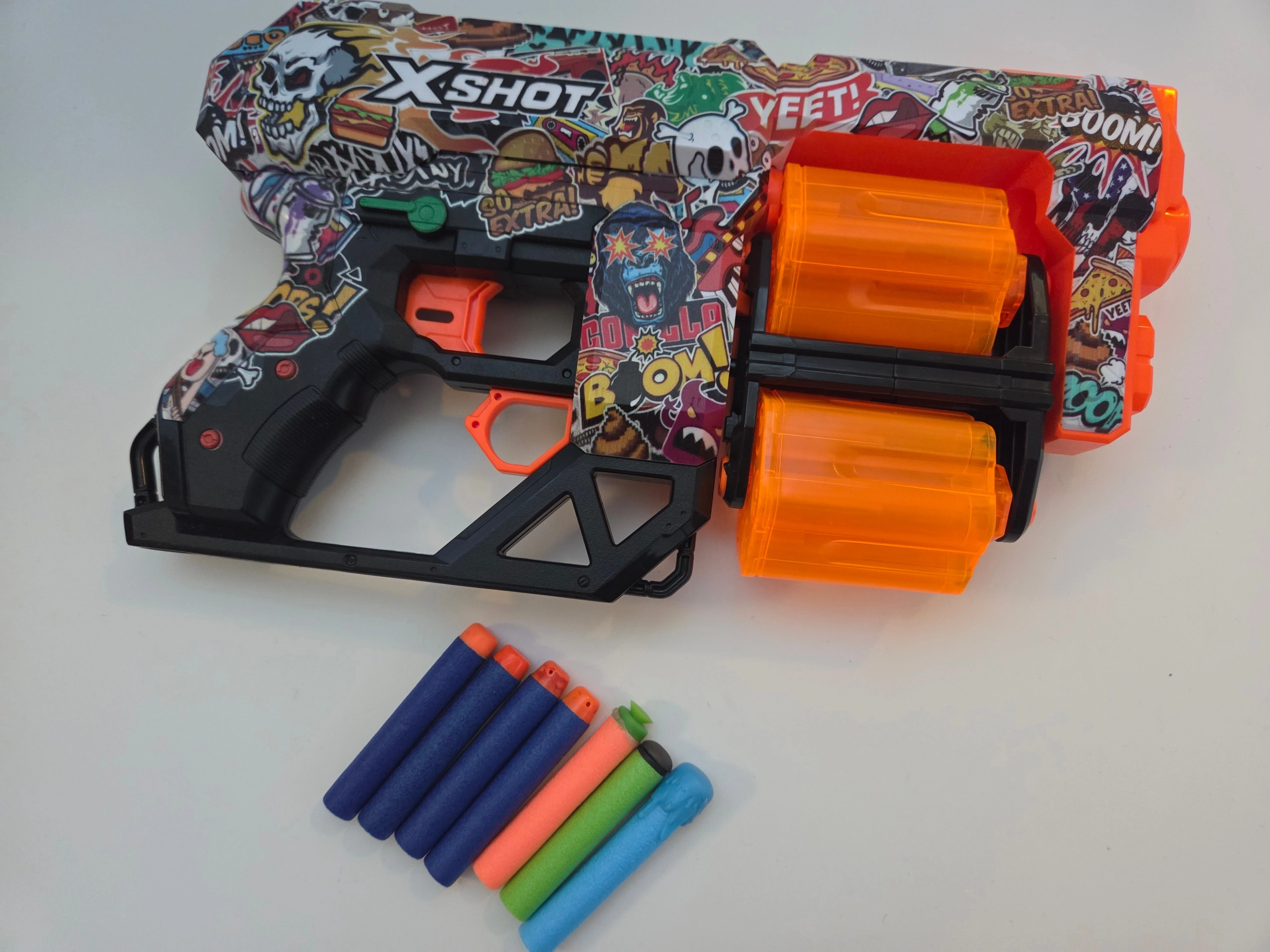 Fun, loud and ready to play! This is the ZURU X-Shot Skins XCESS foam-dart blaster in the graffiti print. It features two side-by-side rotating drums for up to 12 darts total (2×6). Manual prime and single-shot trigger – simple and reliable.
