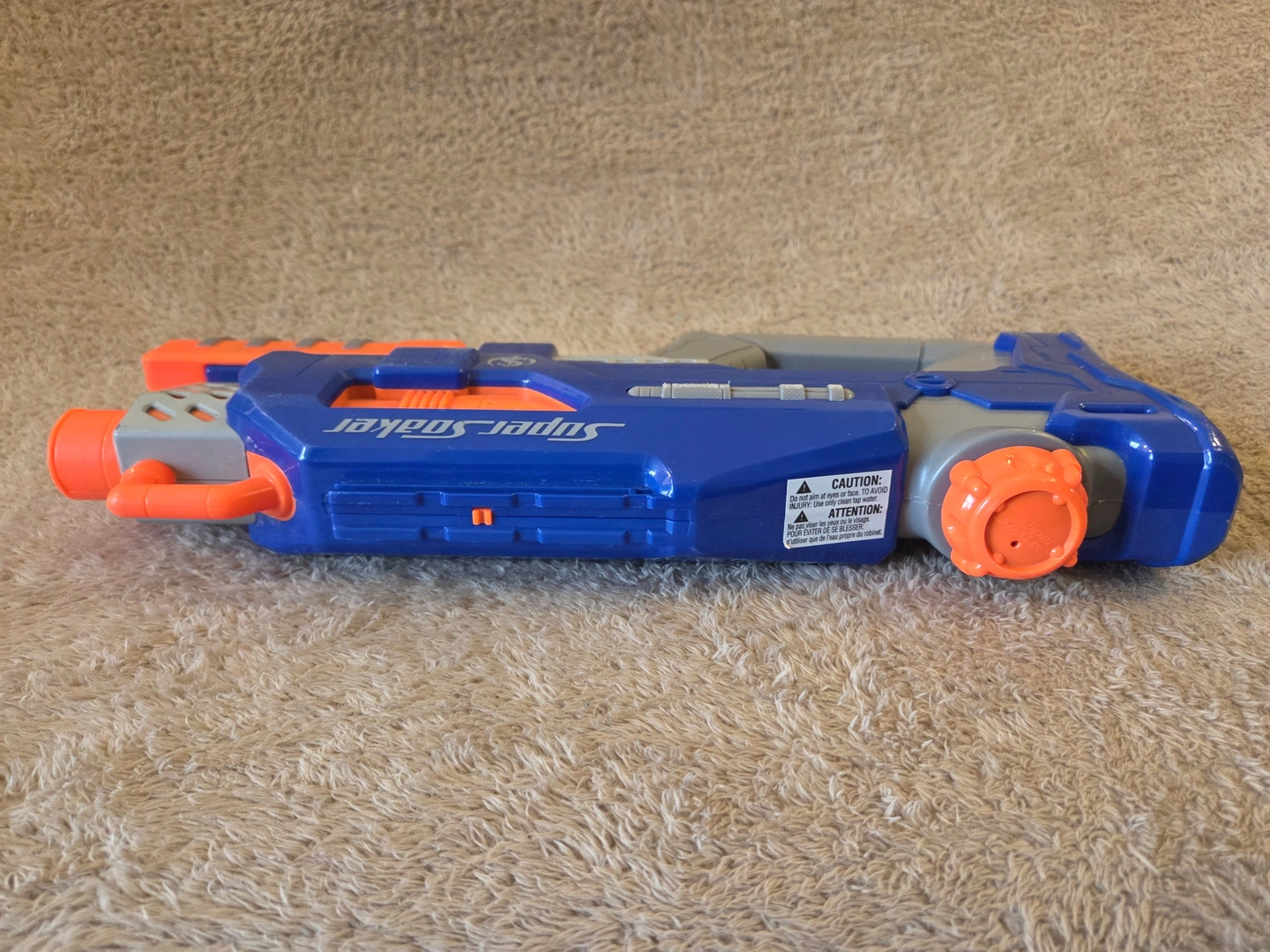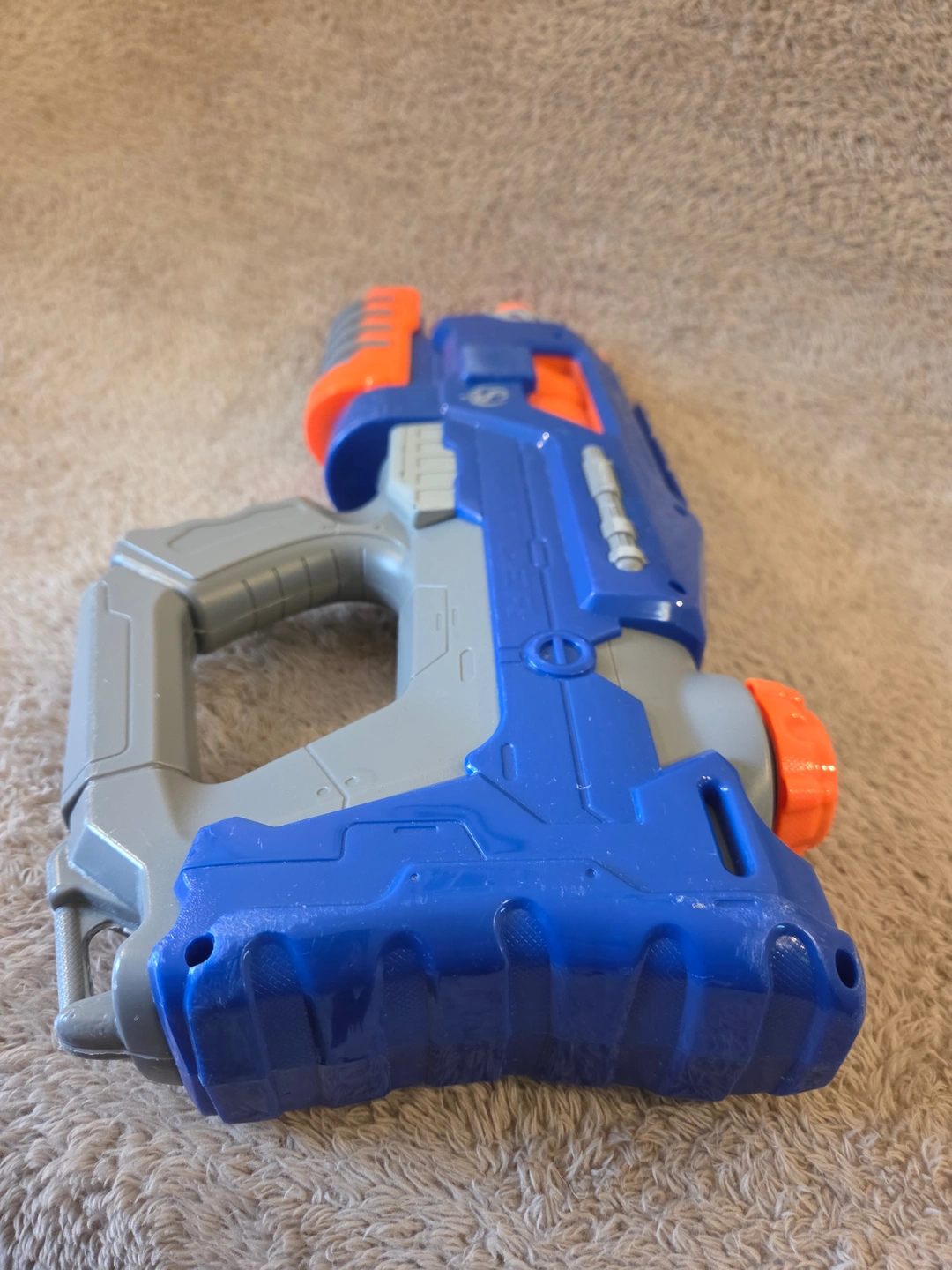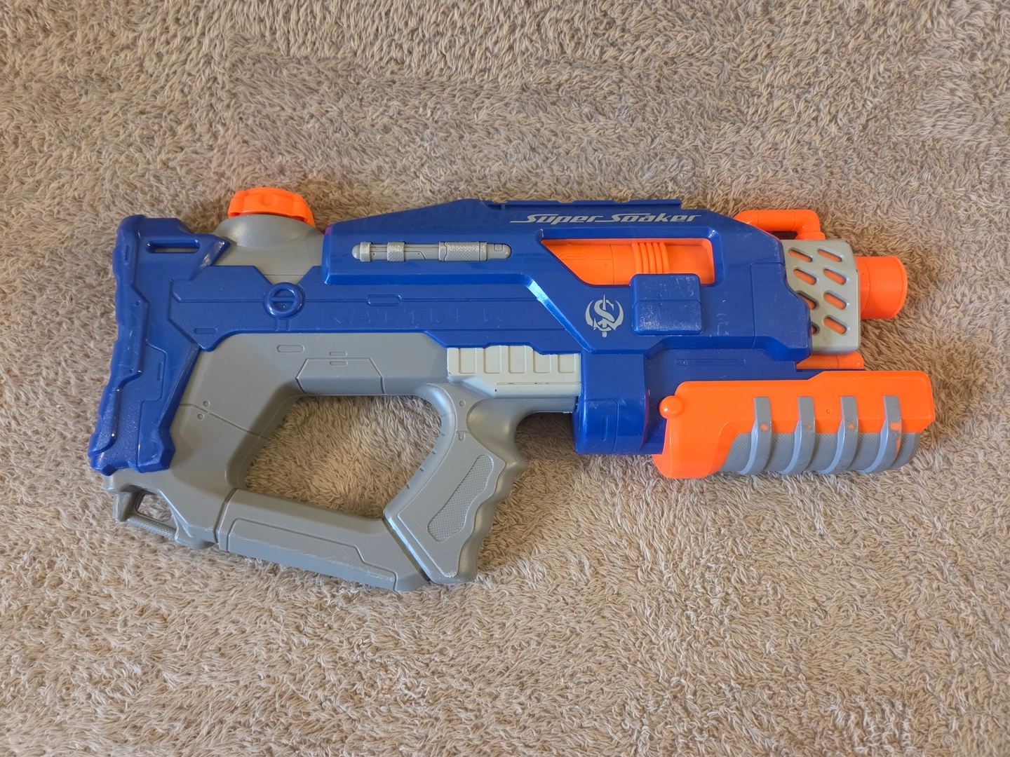 Classic Nerf Super Soaker Rattler in blue/grey/orange. This is the compact pump-action “no-trigger” Rattler from the Soaker Wars era – you slide the front pump to shoot. Advertised range up to 25 ft, with a top tactical rail and two sling points. Great backyard blaster for quick soak battles. Condition: pre-owned with normal scuffs from play – see photos.