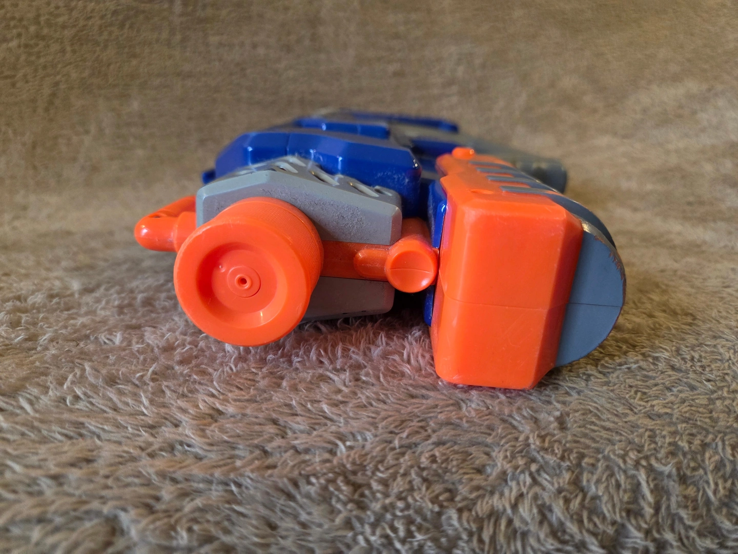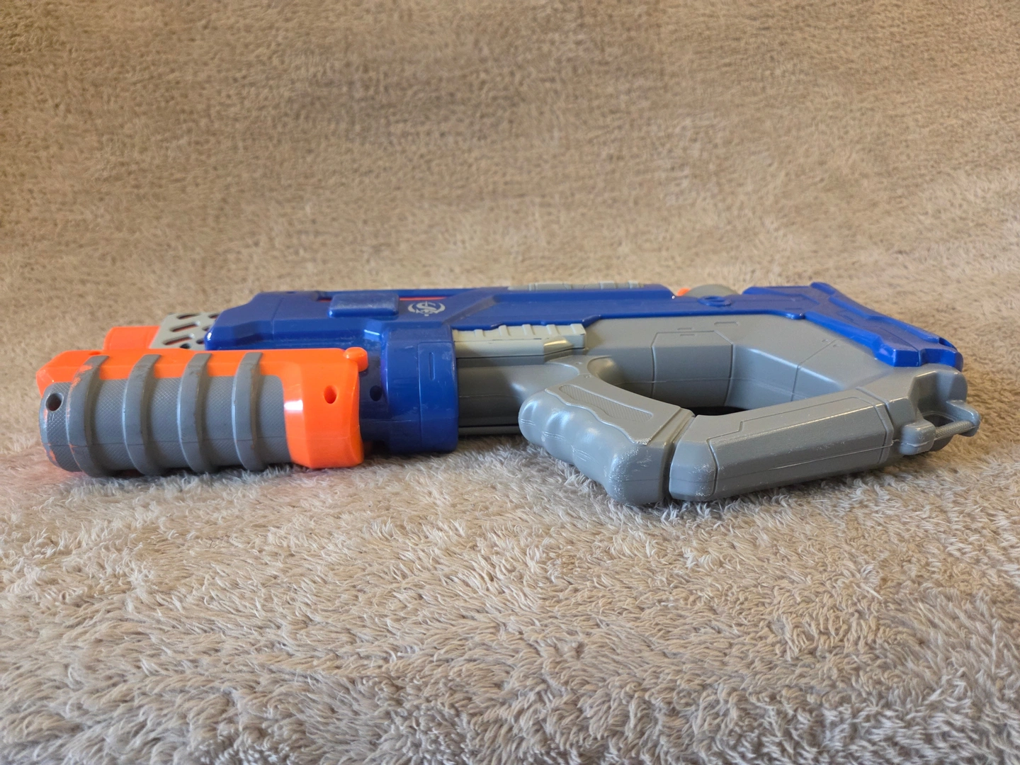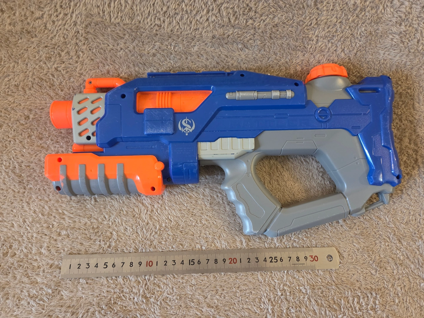 Classic Nerf Super Soaker Rattler in blue/grey/orange. This is the compact pump-action “no-trigger” Rattler from the Soaker Wars era – you slide the front pump to shoot. Advertised range up to 25 ft, with a top tactical rail and two sling points. Great backyard blaster for quick soak battles. Condition: pre-owned with normal scuffs from play – see photos.