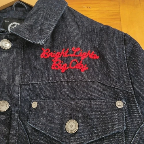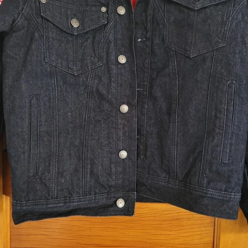 Classic denim jacket quilted inside and satin fabric design on back and cuffs of sleeve.
