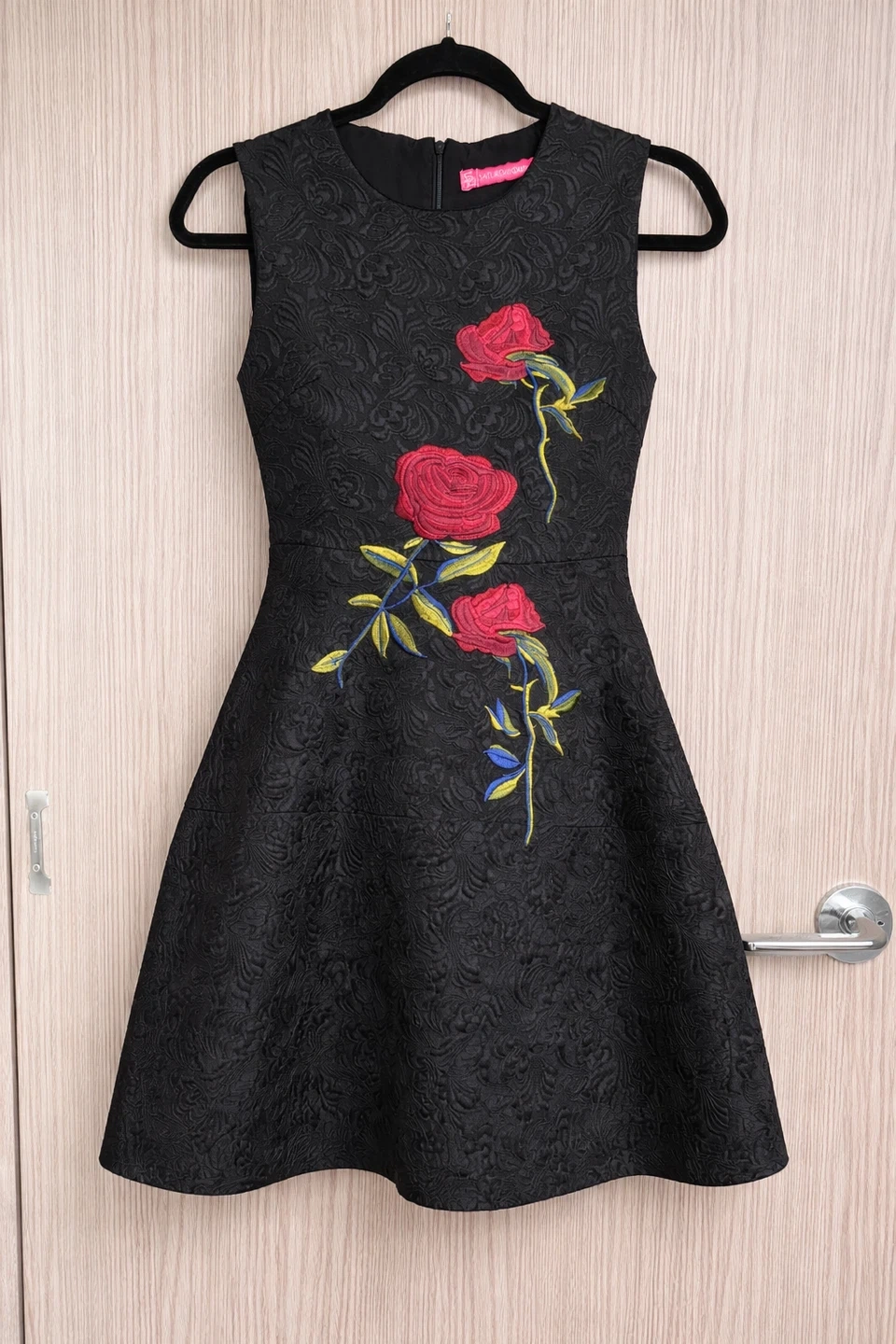 Luxury Black Embroidered Dress with Red Floral | One-of-a-Kind