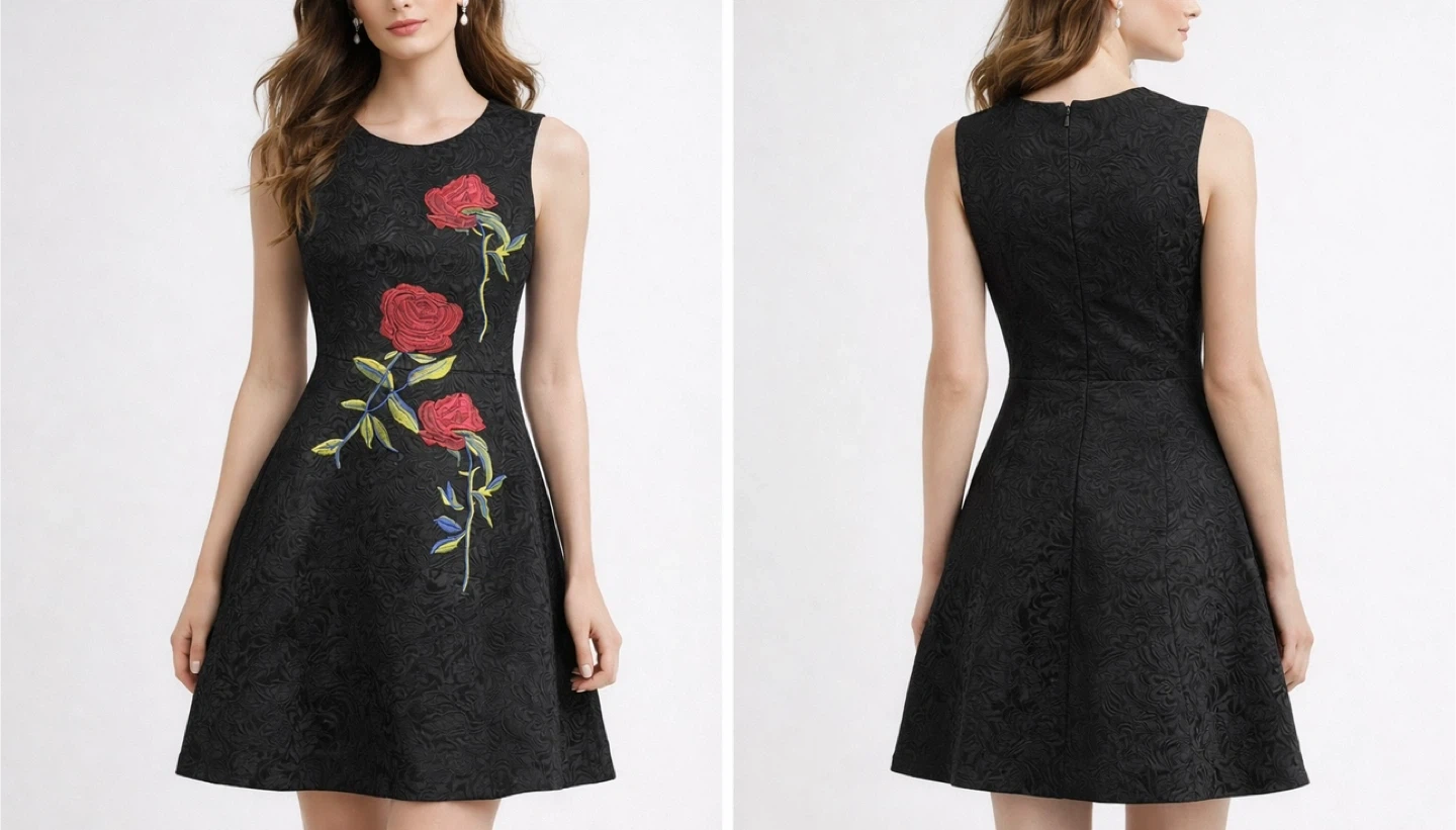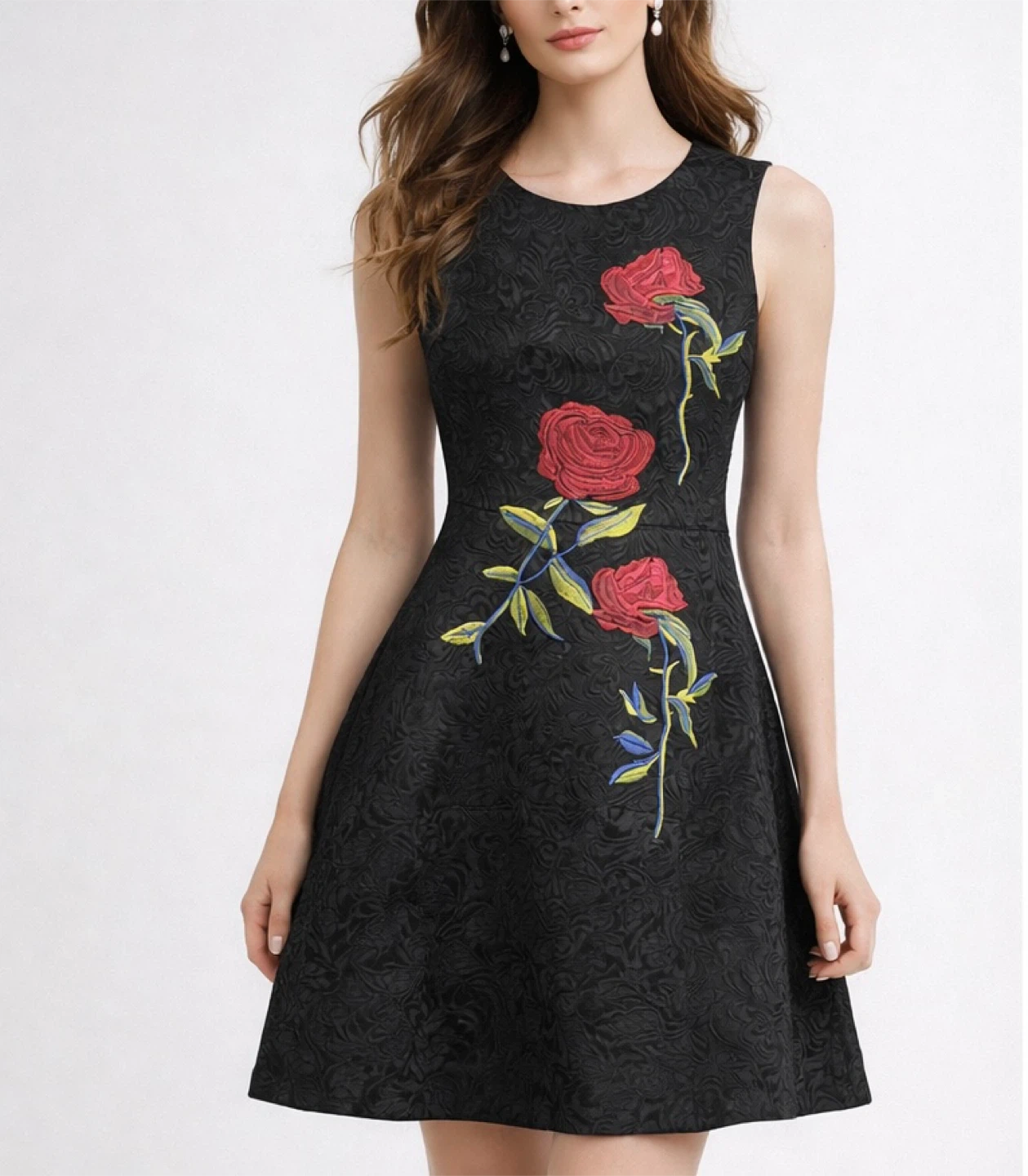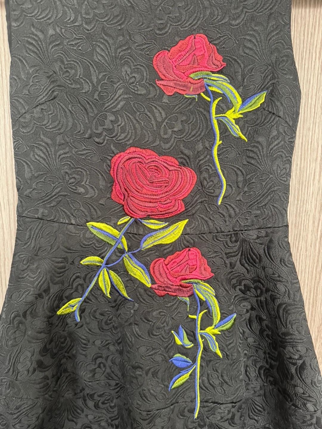 A striking, editorial-worthy black dress defined by its rich textured fabric and hand-embroidered rose motifs, discovered during travels and sourced as a one-of-a-kind piece. The sculpted silhouette is cut to flatter the waist before falling into a softly structured skirt, offering both elegance and ease.