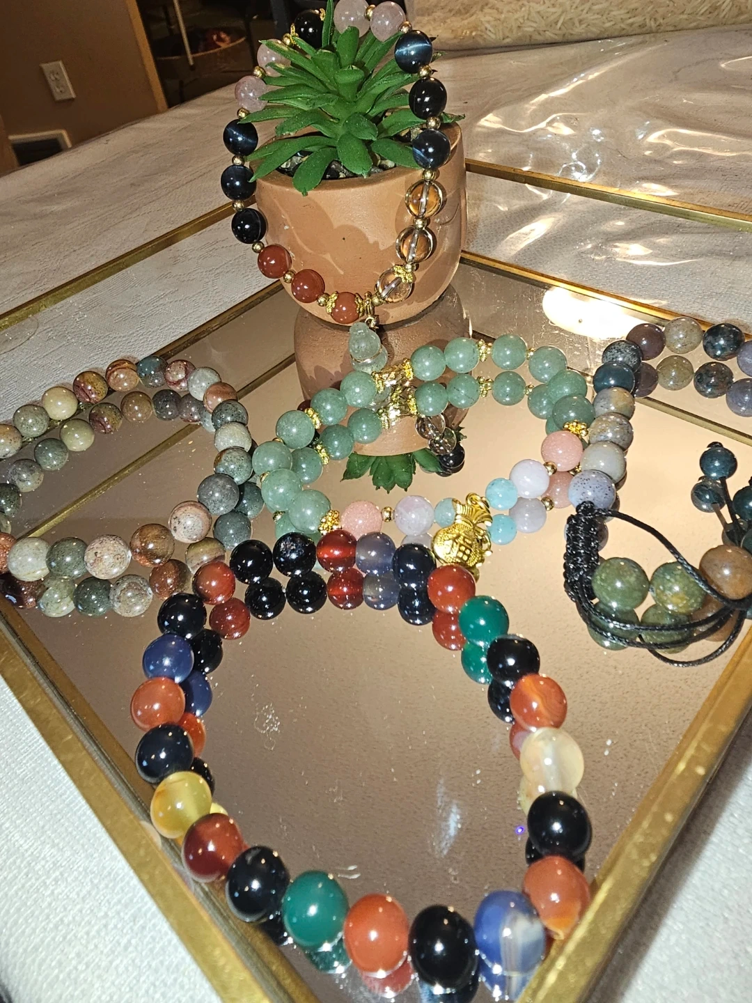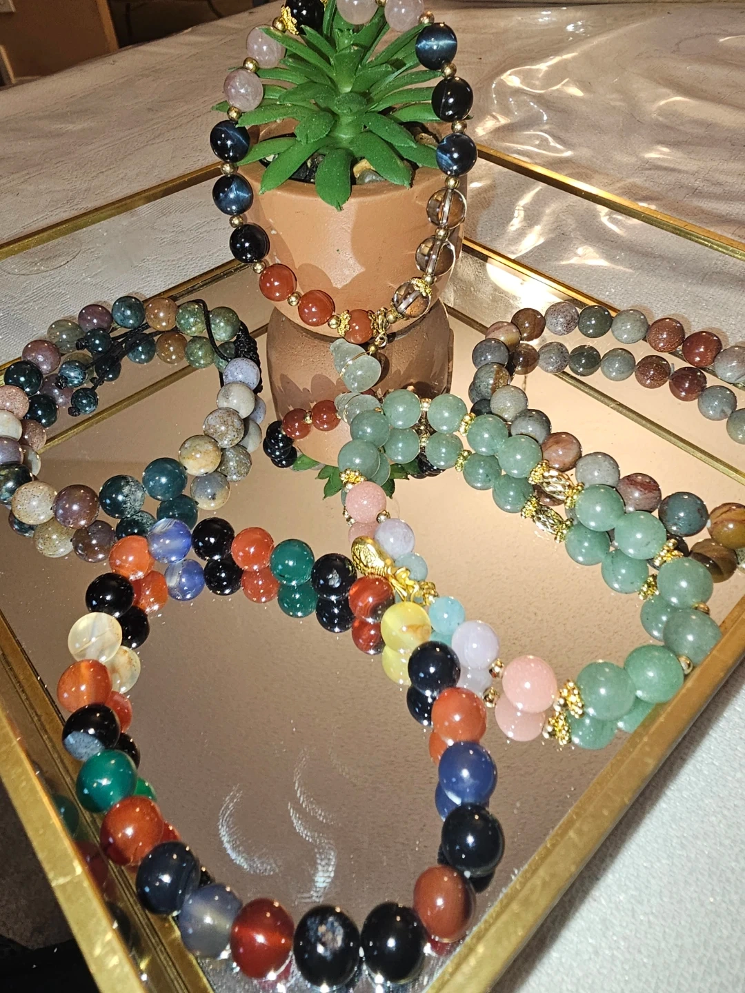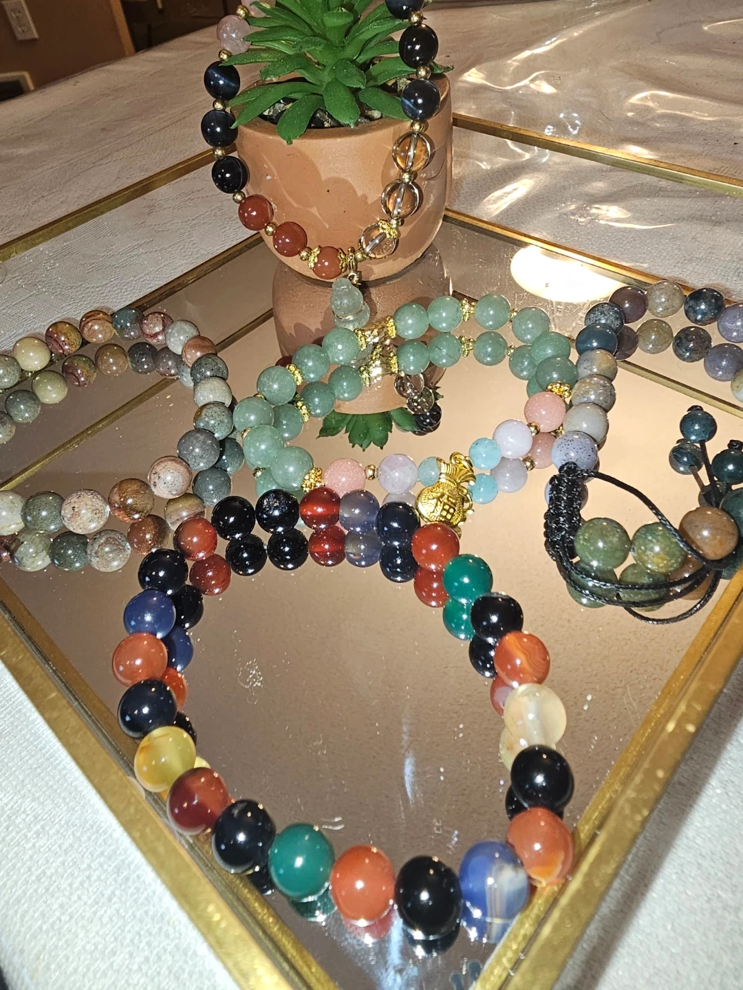 Here are some beautiful beaded gemstone bracelets in assorted colours! Ocean Jasper, indian agate, jade and green aventurine .They would make a great addition to any outfit or a thoughtful gift for someone special. New arrival $25each