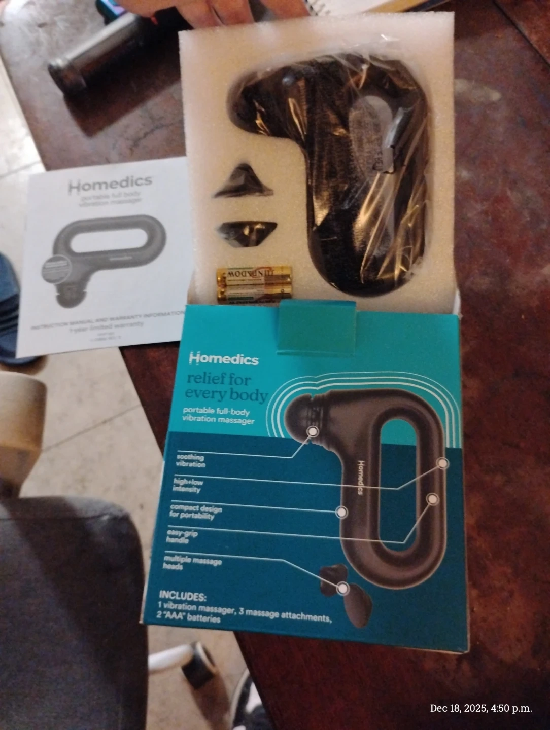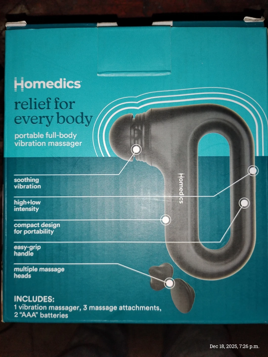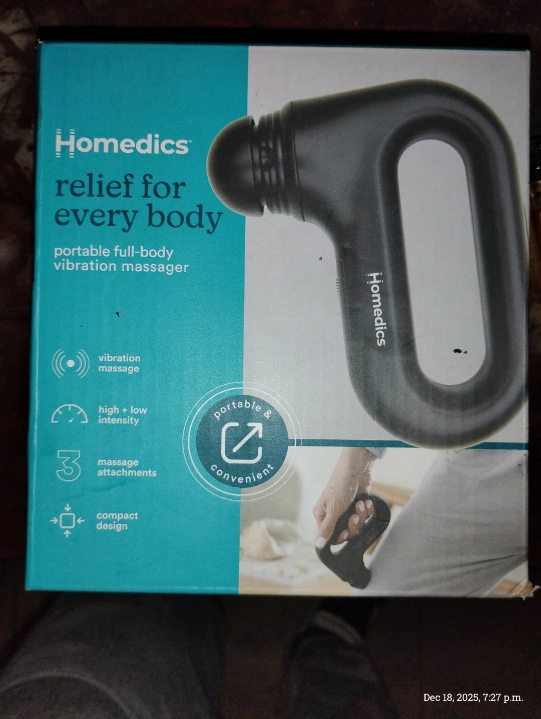 Selling a Homedics portable full-body vibration massager! It has a compact design for portability and an easy-grip handle. It includes 3 massage attachments and requires 2 AAA batteries. That are rechargeable that comes with it every thing in the box has not been opened or touched