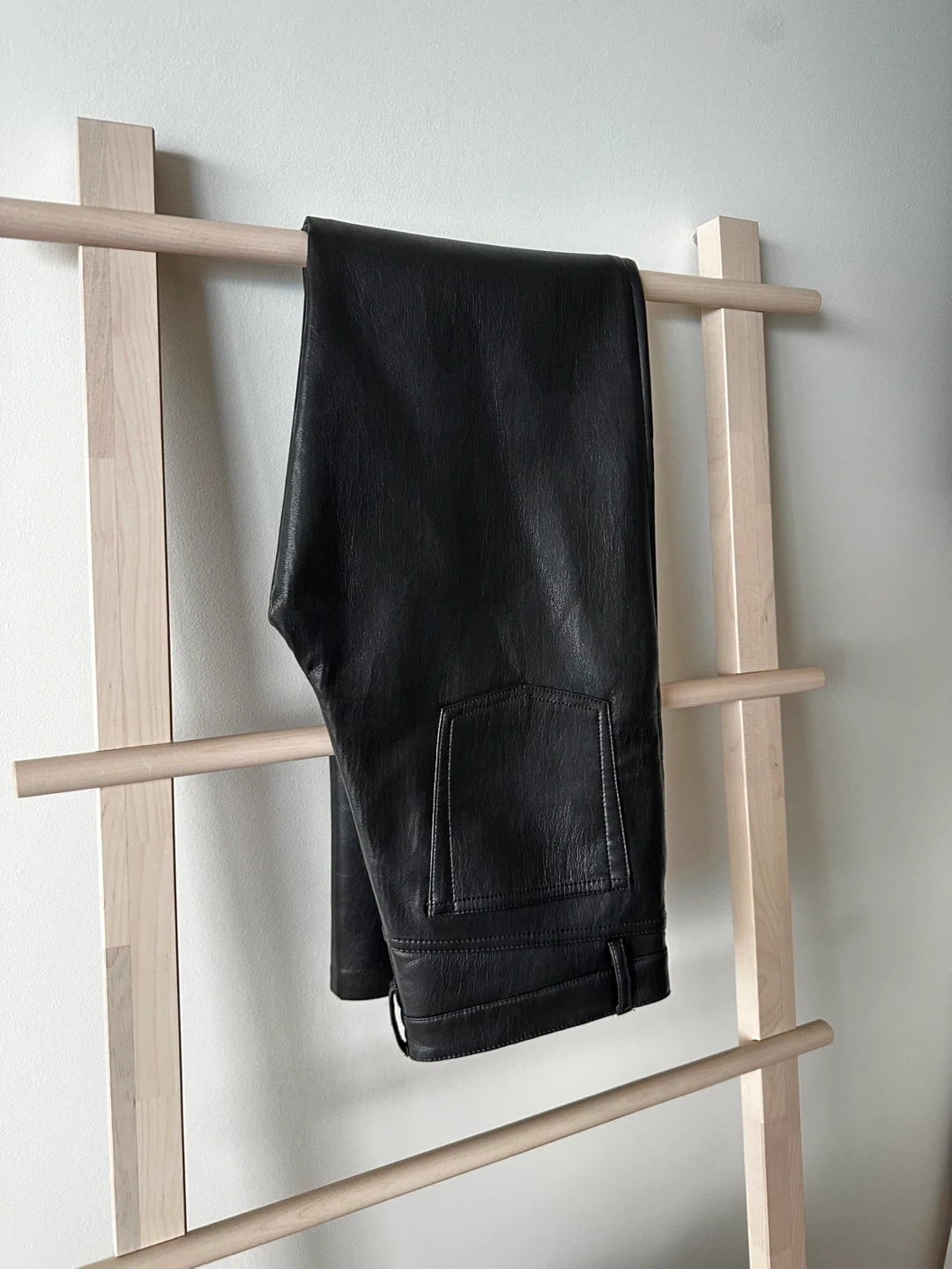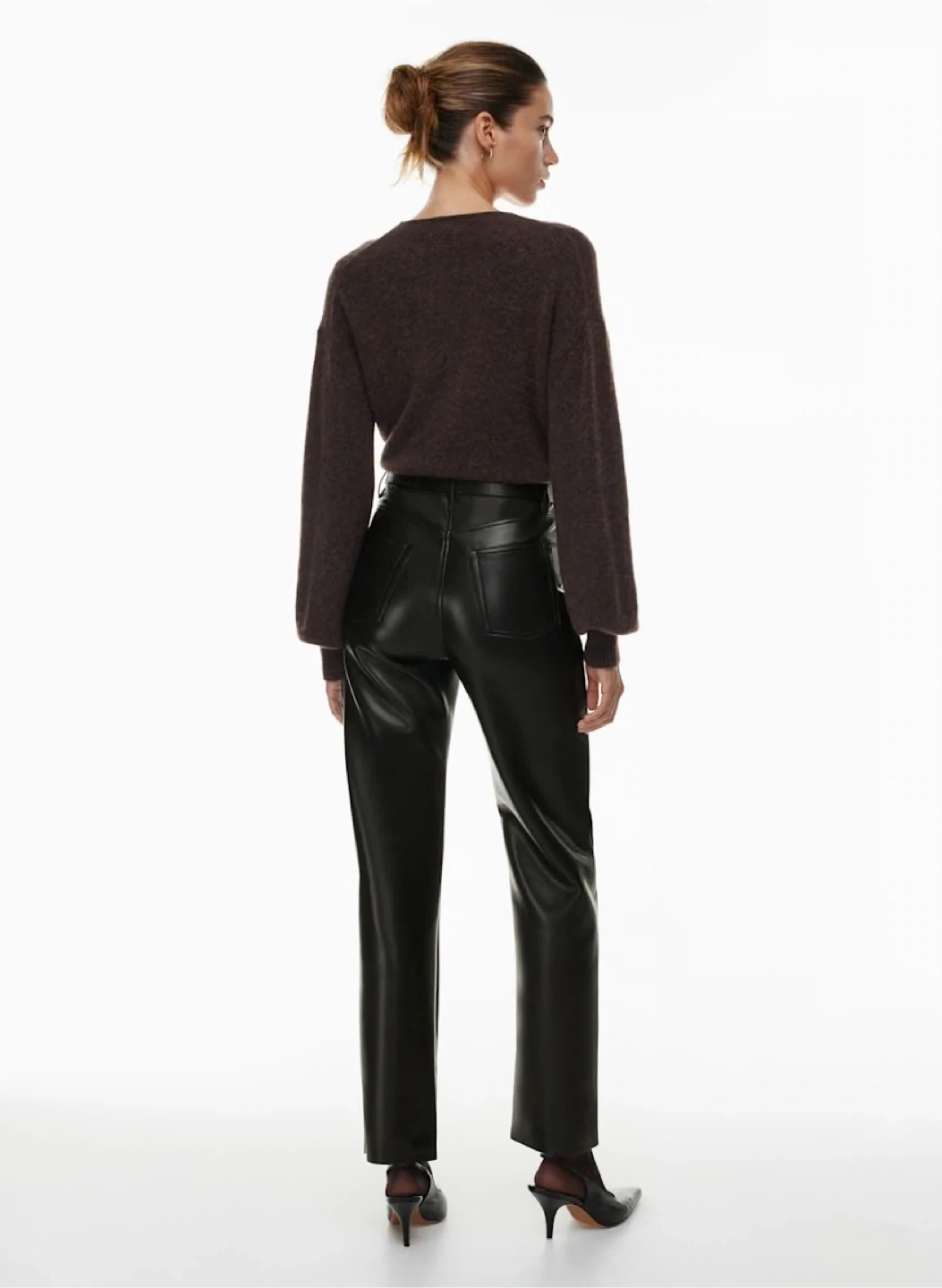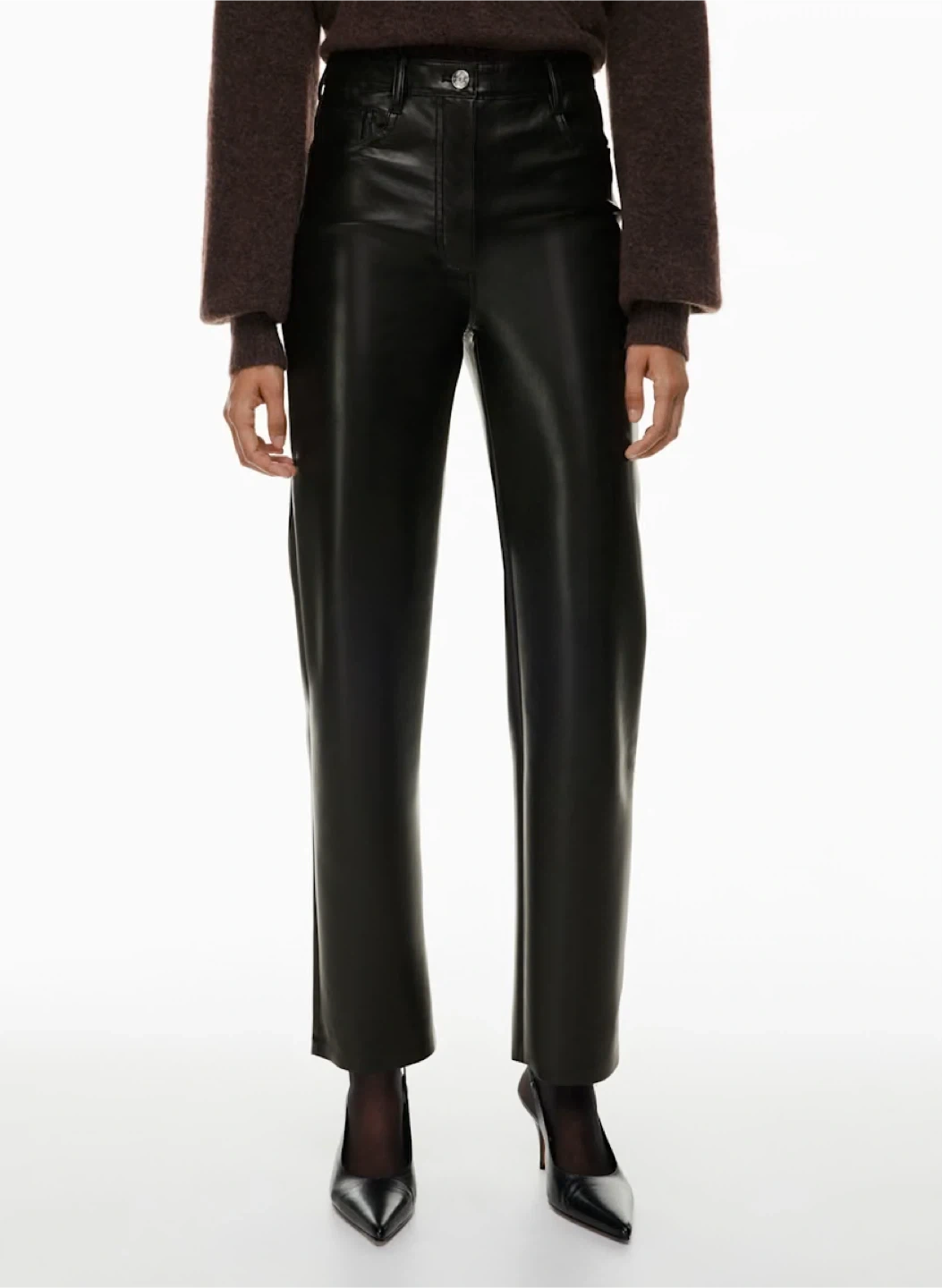 These are high-rise straight-leg pants with five-pocket styling and a universally flattering fit. They’re made with our innovative Vegan Leather that looks and feels like the real thing. They have an authentic drape and a soft sheen that feels right from day one.